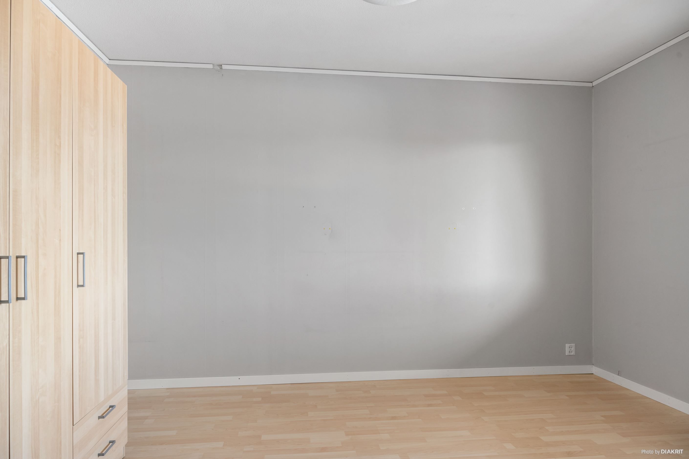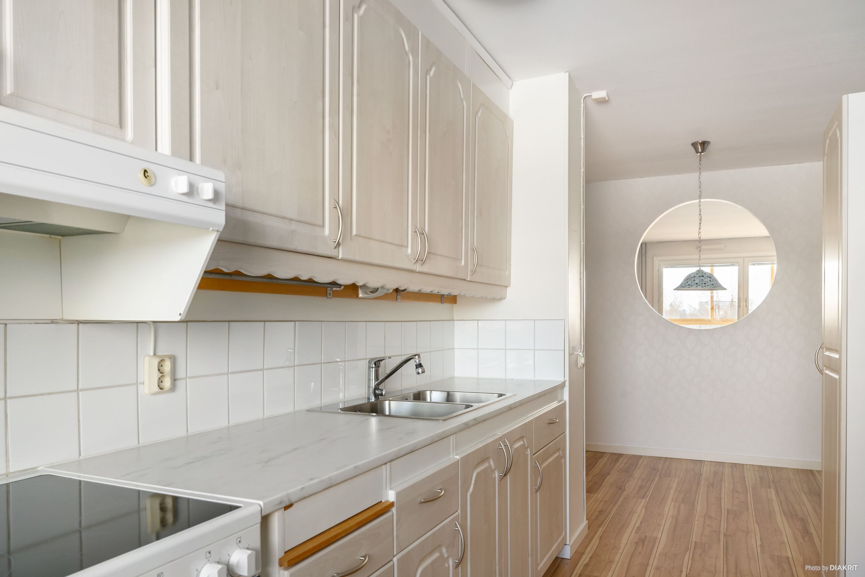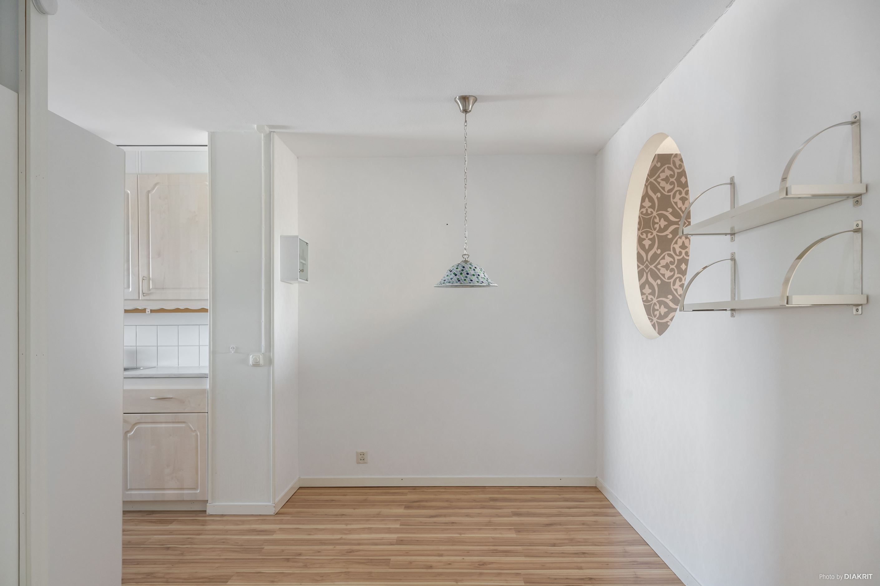 I hallen möts du av ett praktiskt och stilrent golv som fortsätter in i köket, medan vardagsrummet erbjuder ett vackert parkettgolv som skapar en varm och ombonad känsla. Vardagsrummet är rymligt och lättmöblerat och binds samman med köket via en rund öppning. Denna detalj skapar ett fint samband mellan rummen.