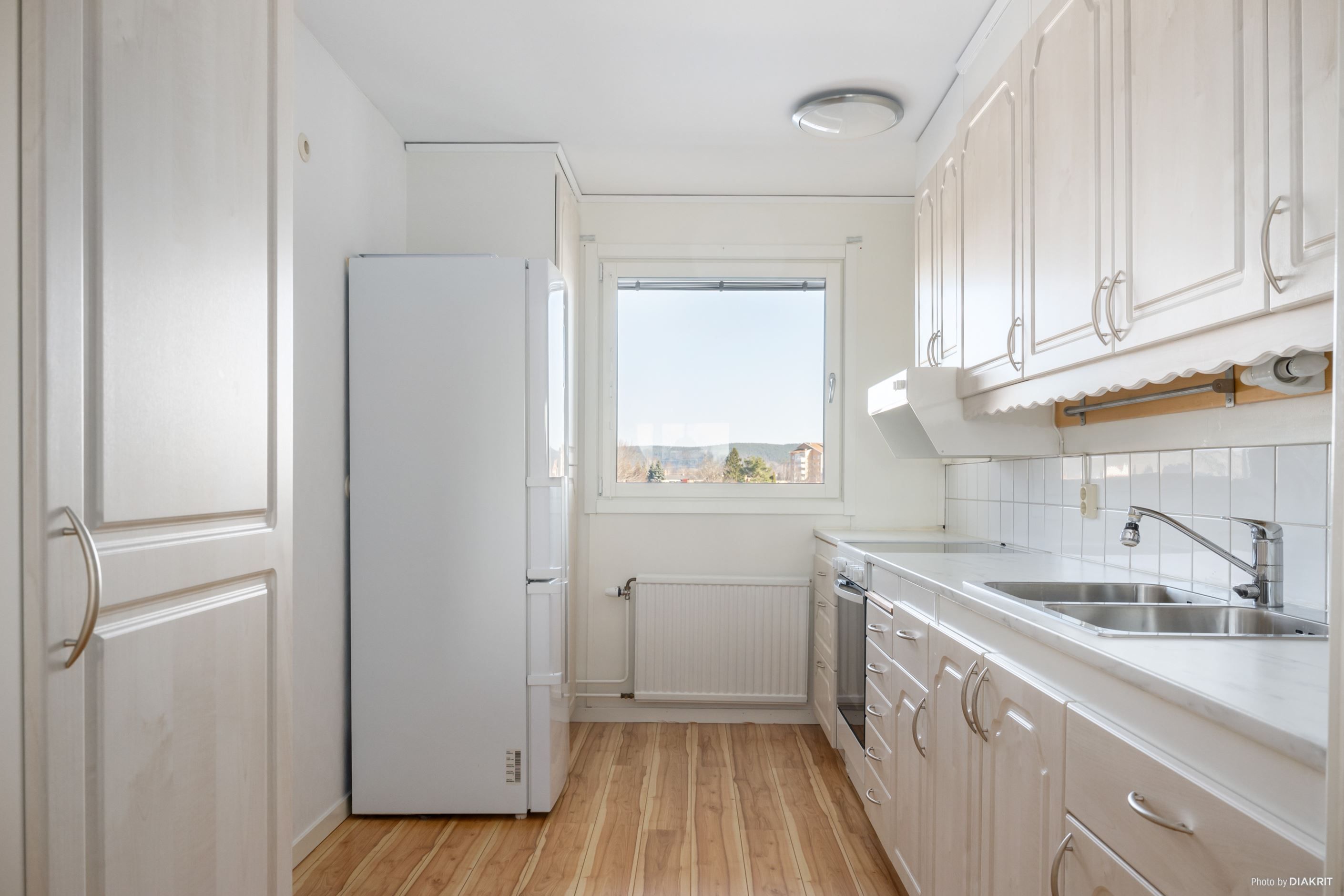 Köket är fräscht och funktionellt med gott om förvaring och bra arbetsytor.