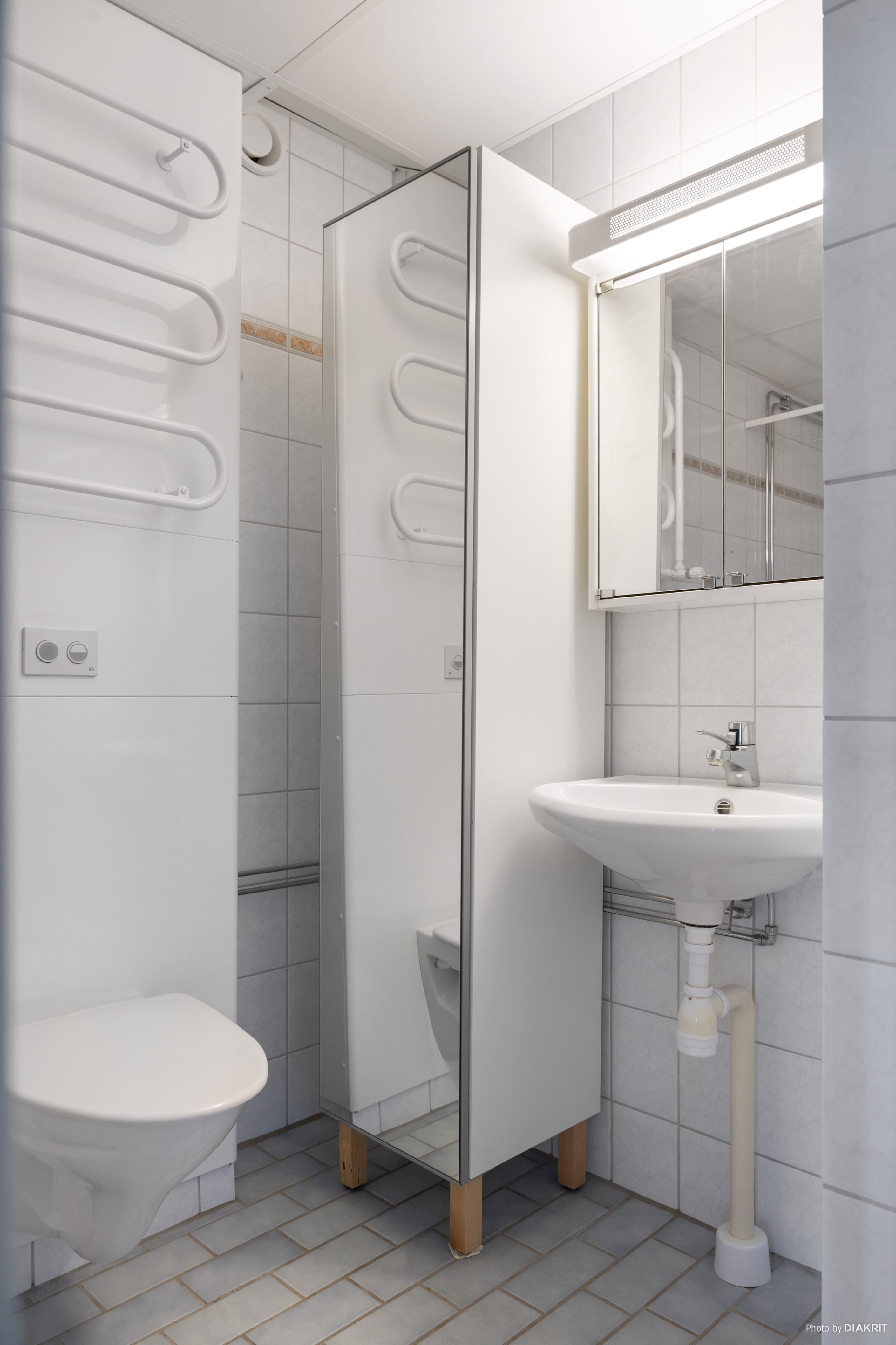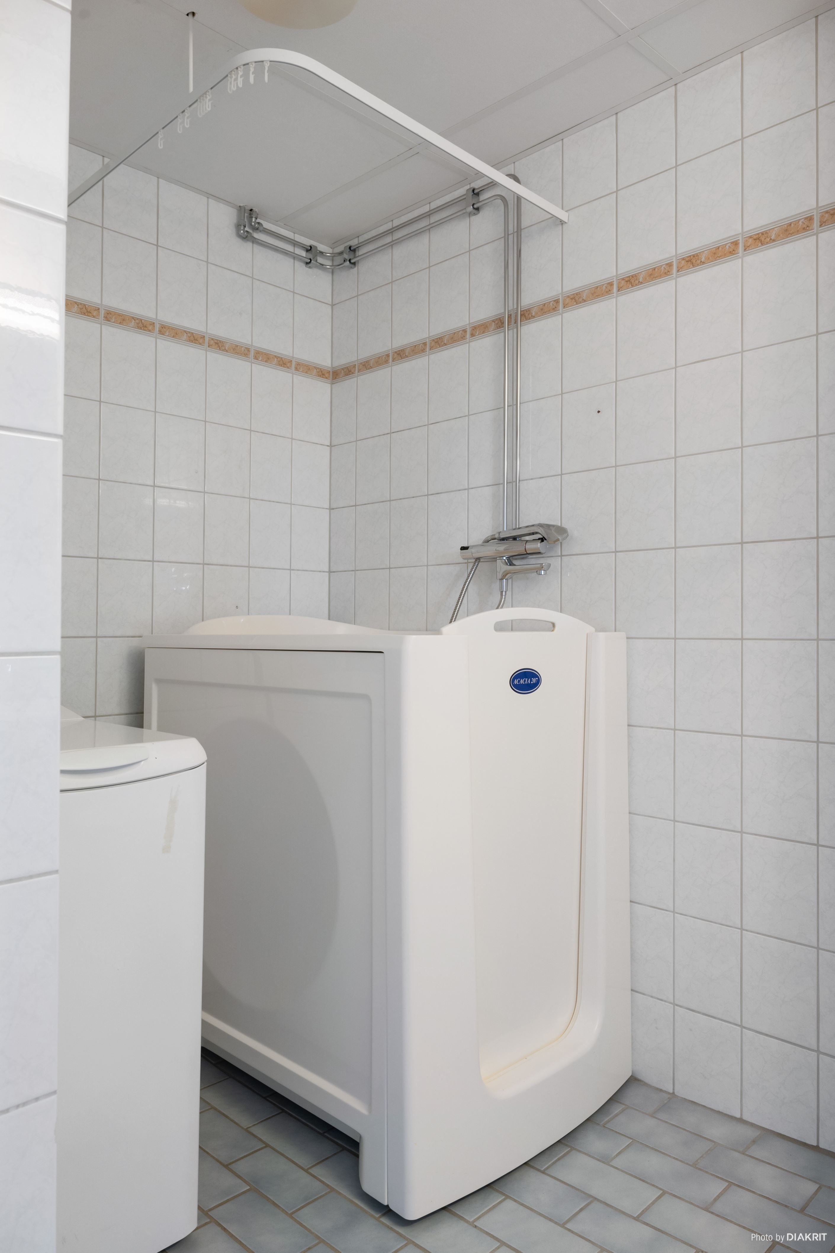 Badrummet är helkaklat och utrustat med tvättmaskin samt sittbadkar. För den som föredrar dusch finns möjlighet att enkelt ta bort badkaret och anpassa ytan efter egna önskemål.