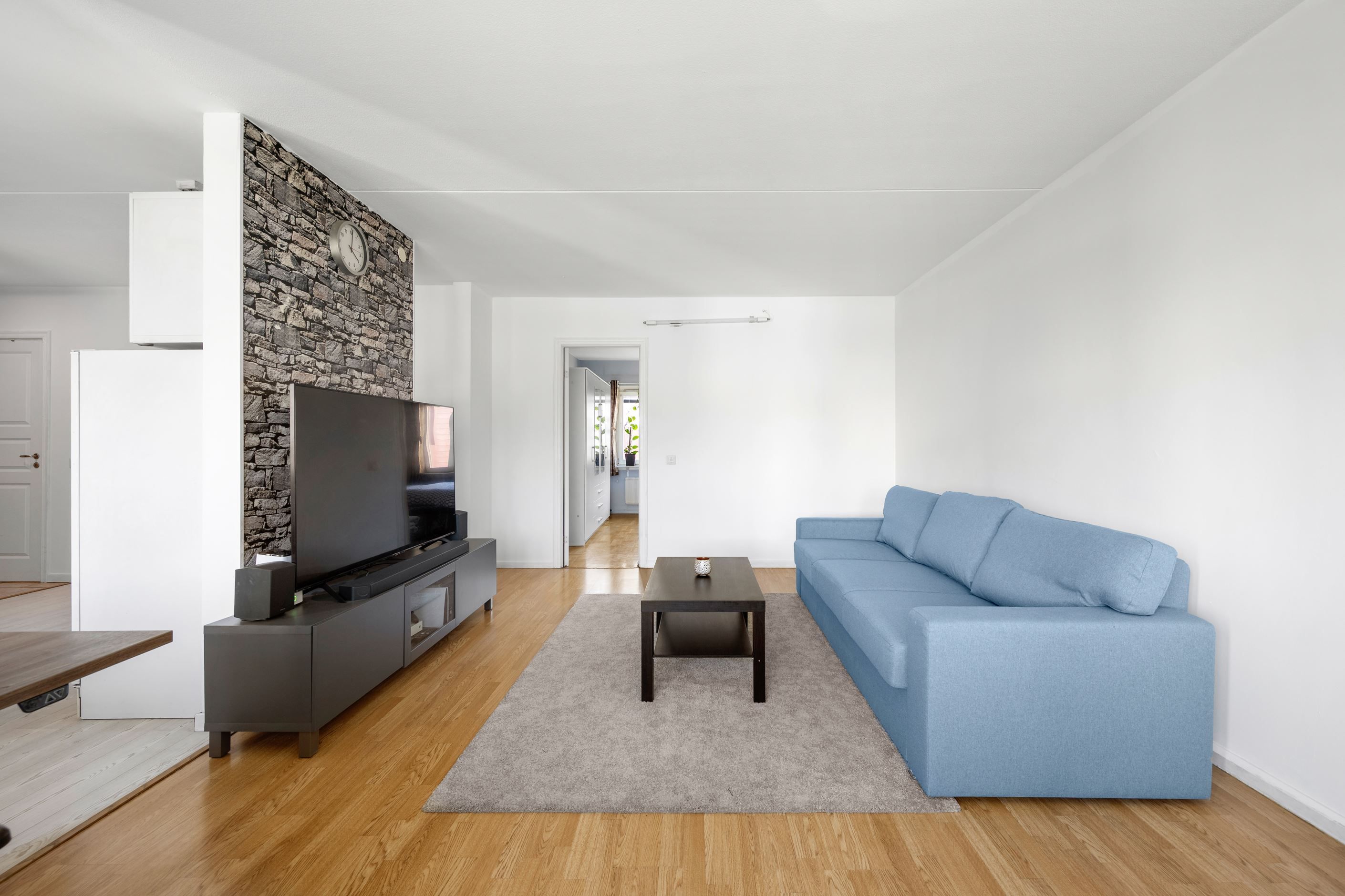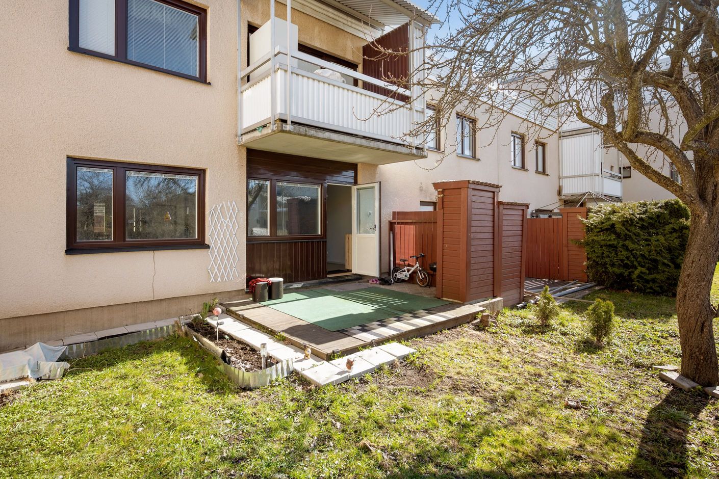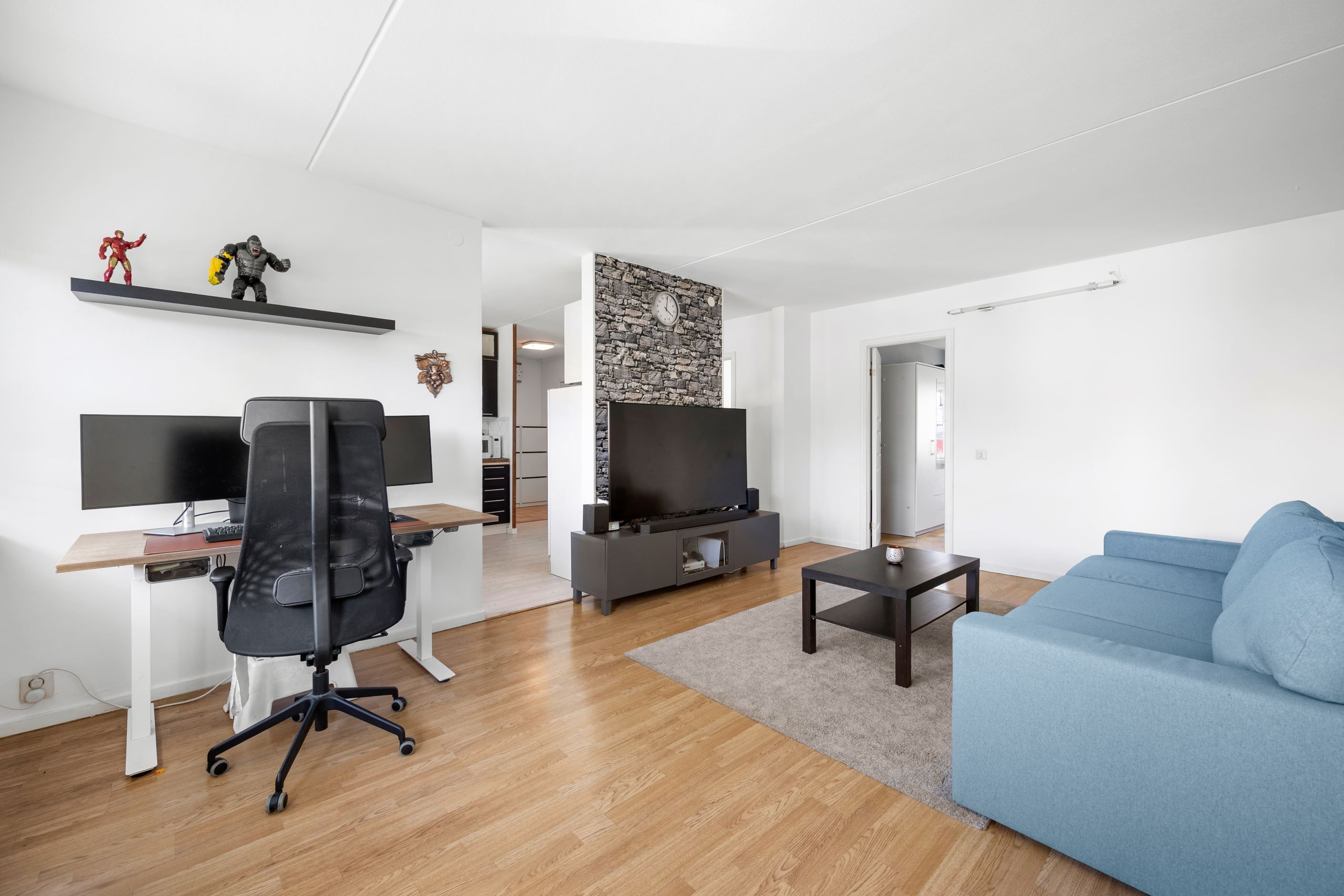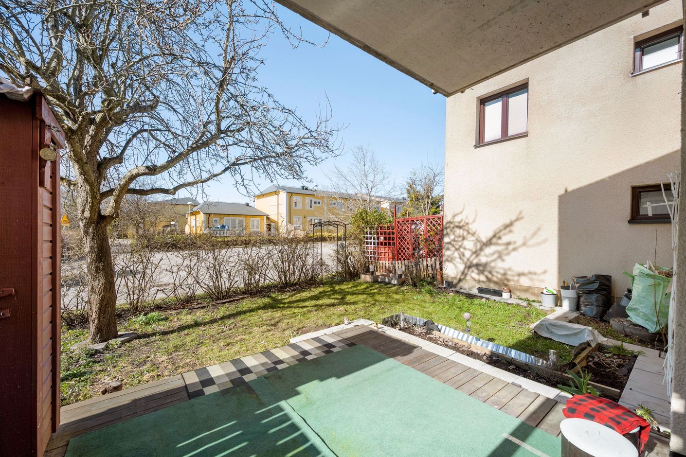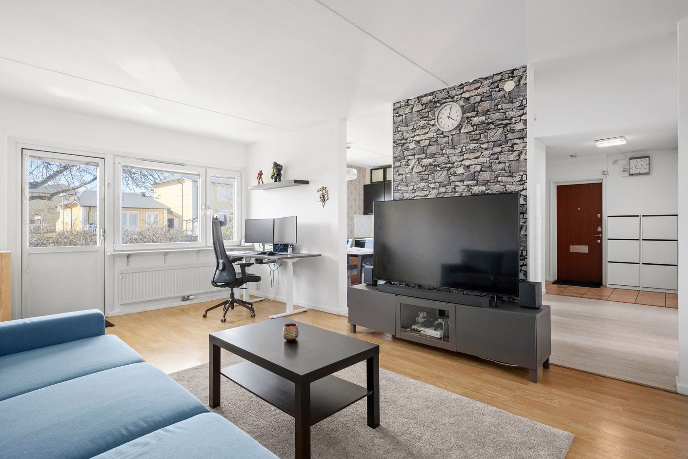 Bostaden erbjuder en välkomnande hall, ett stort och socialt vardagsrum med utgång till en stor och härlig uteplats, kök med gott om arbetsyta och mycket förvaring bakom skåpsluckor. Köket är fullutrustat med all maskinell utrustning som man kan önska. Helkaklat badrum i smakfull stil. Vidare finns två rymliga sovrum och ett förråd i lägenheten.