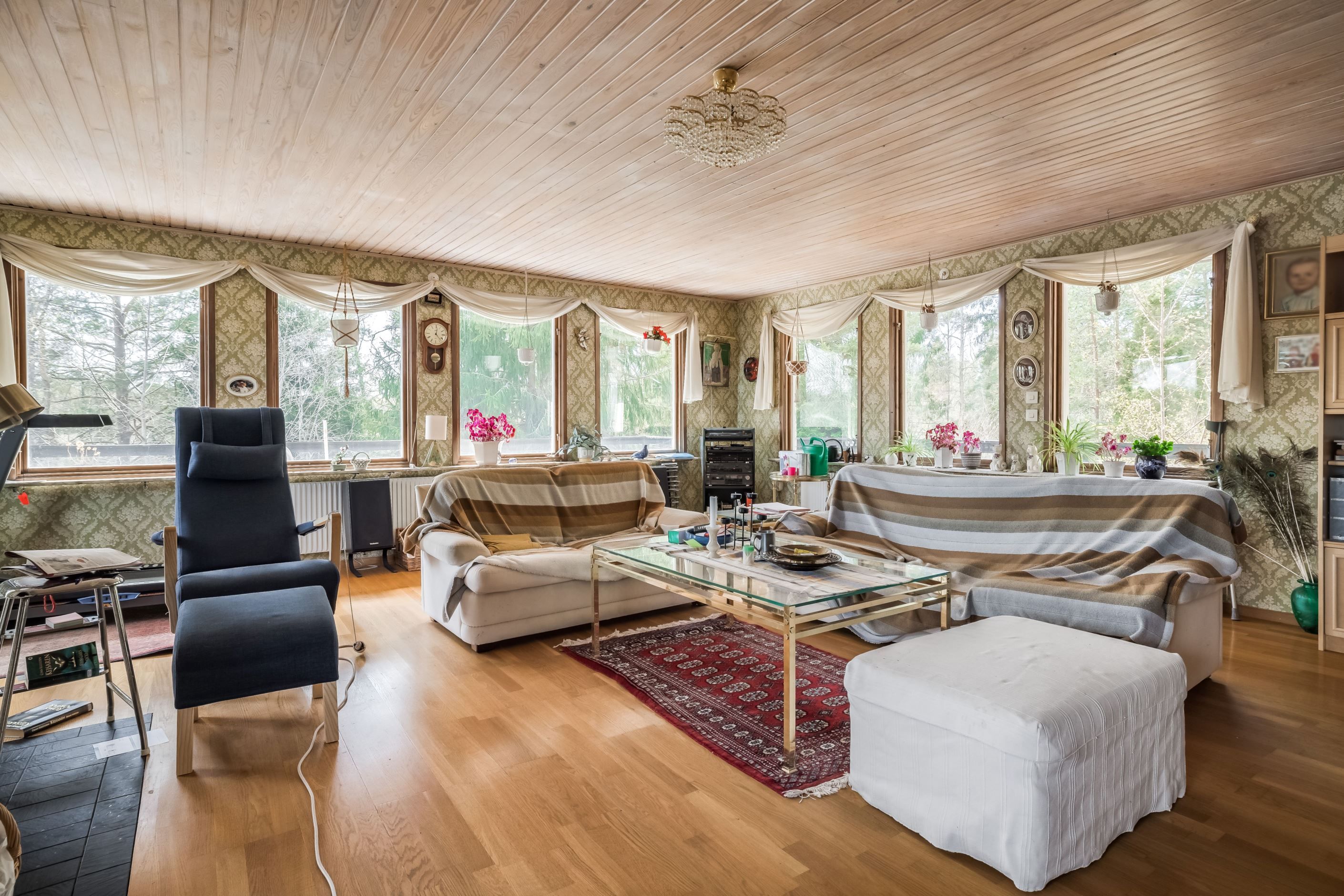 Man bor högt och vackert i en stor vit tegelvilla om över 180 kvm med en nästan helt insynsskyddad tomt. Njut av en vacker vy över viken och över trädtopparna. Vyn är lika fin från både trädgården, stora altanen och inomhus. Trädgården har stor potential och för en trädgårds älskare finns det möjlighet att skapa en oas. Tomten ligger väldigt skyddat.