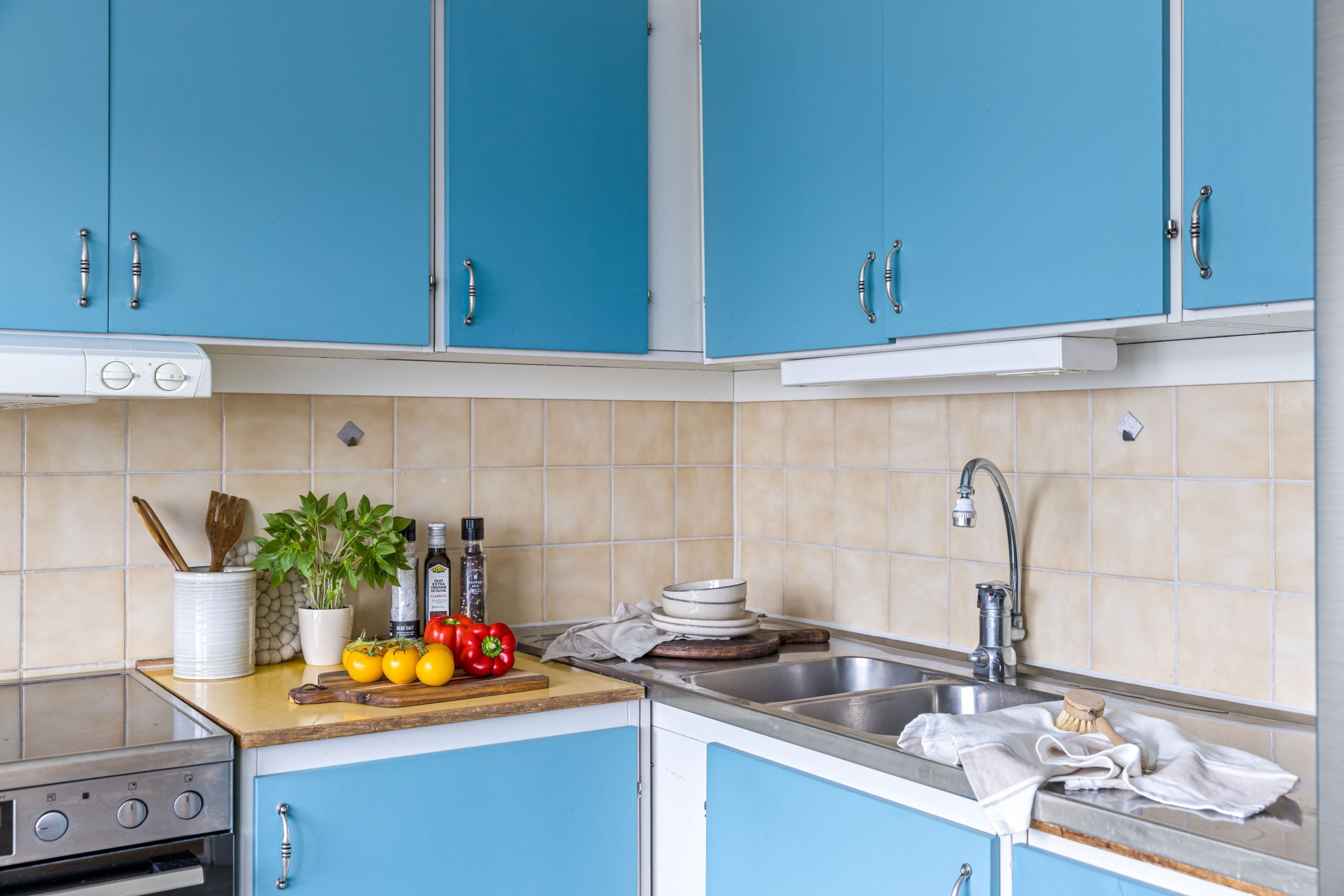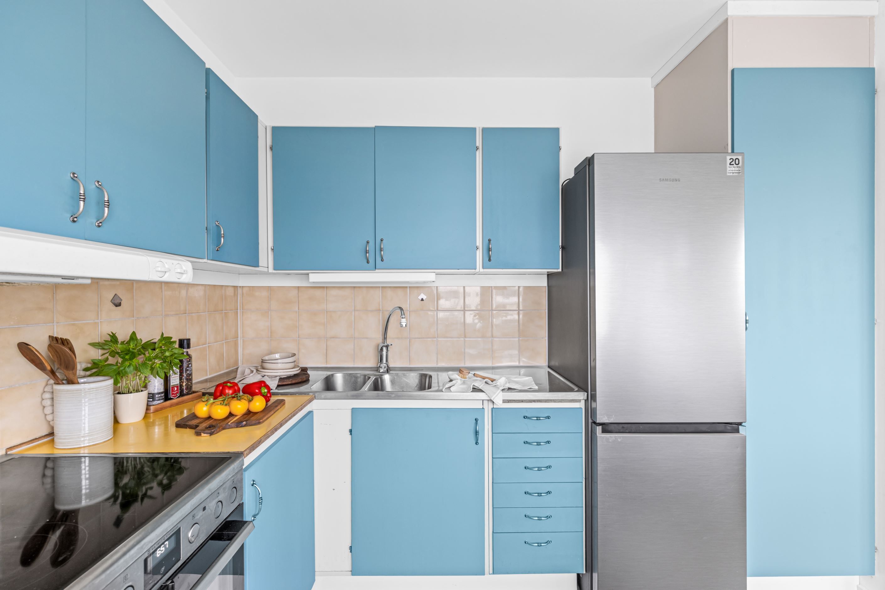 Köket är fullt utrustat och präglas av charmiga turkosa skåpluckor som ger rummet en unik karaktär. Här finns gott om förvaring, bra arbetsytor och plats för matbord. Badrummet är helkaklat och har WC och dusch.