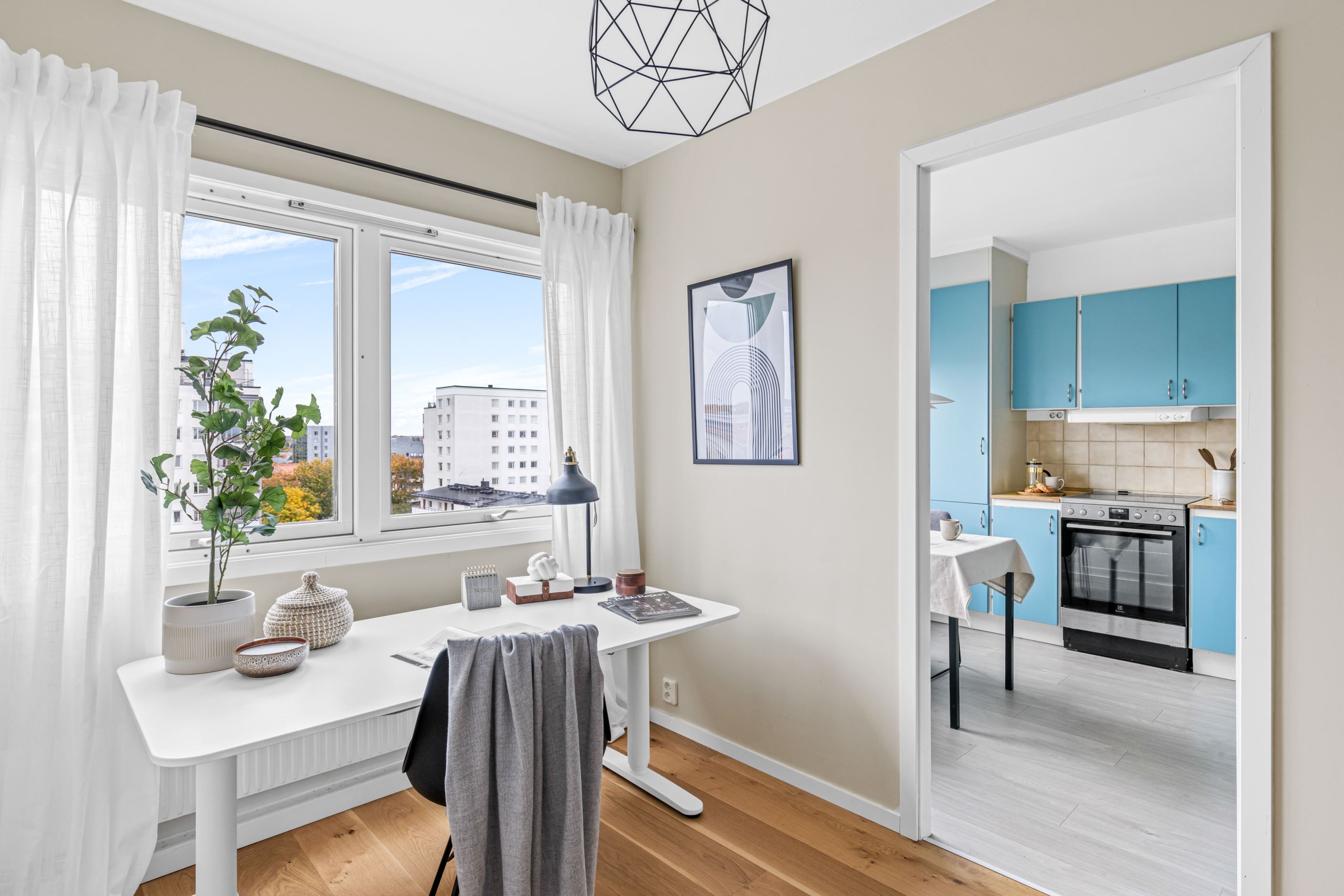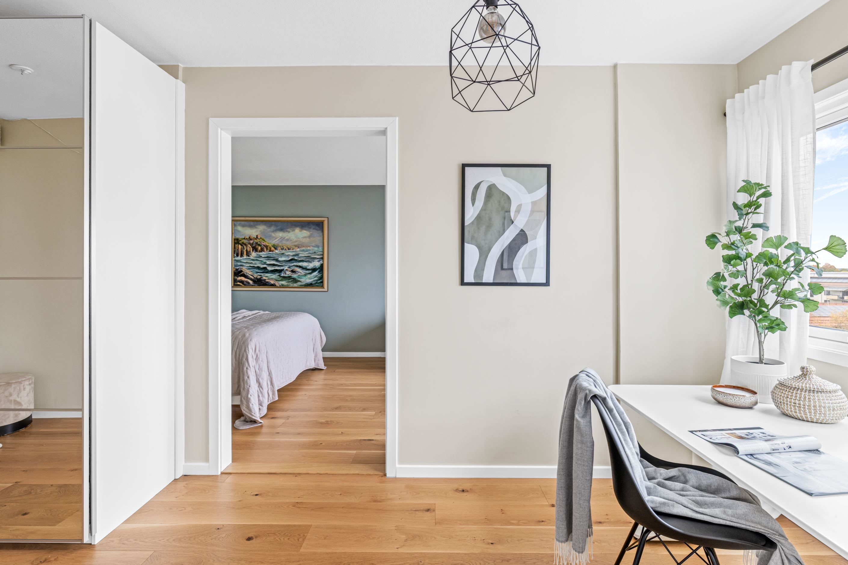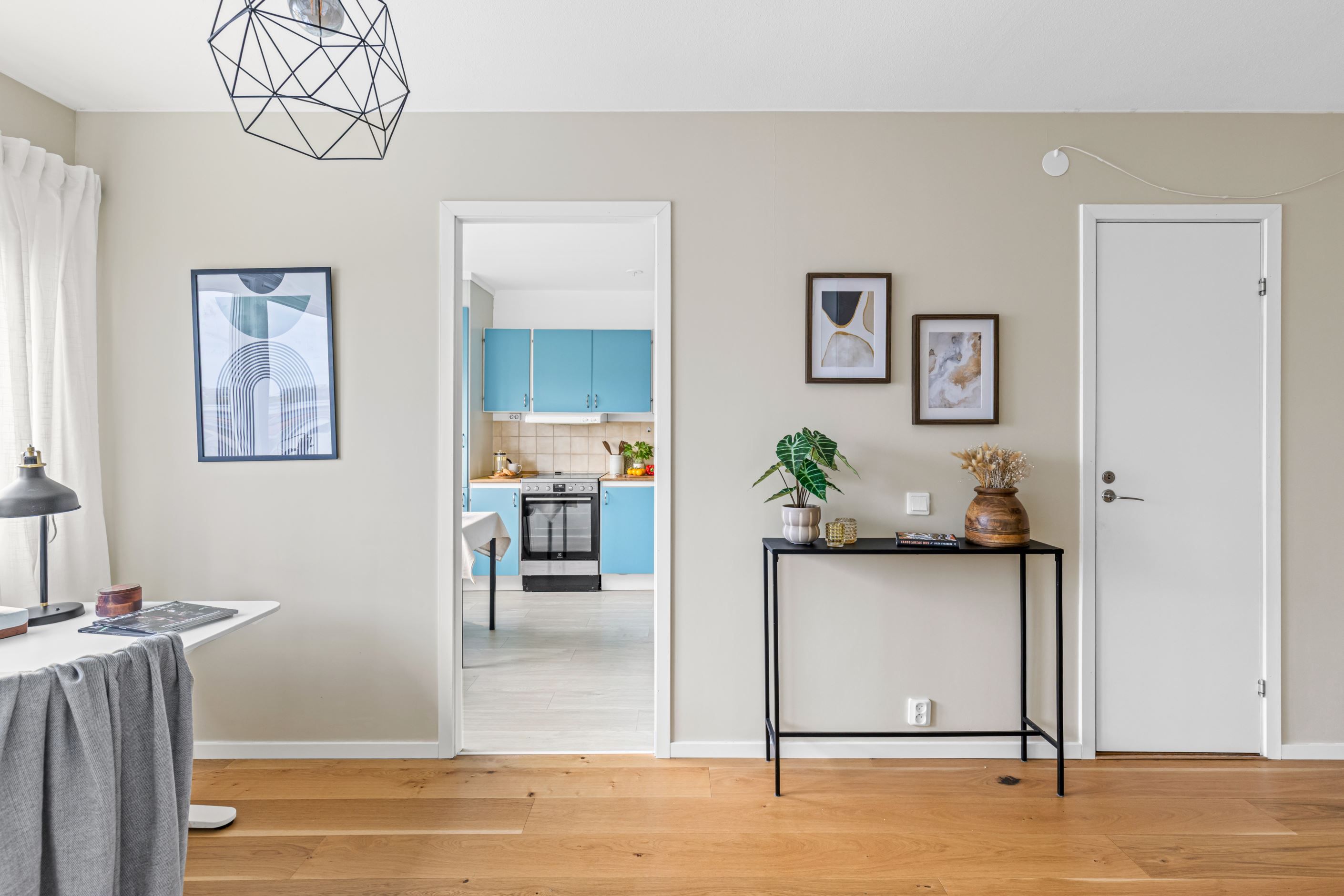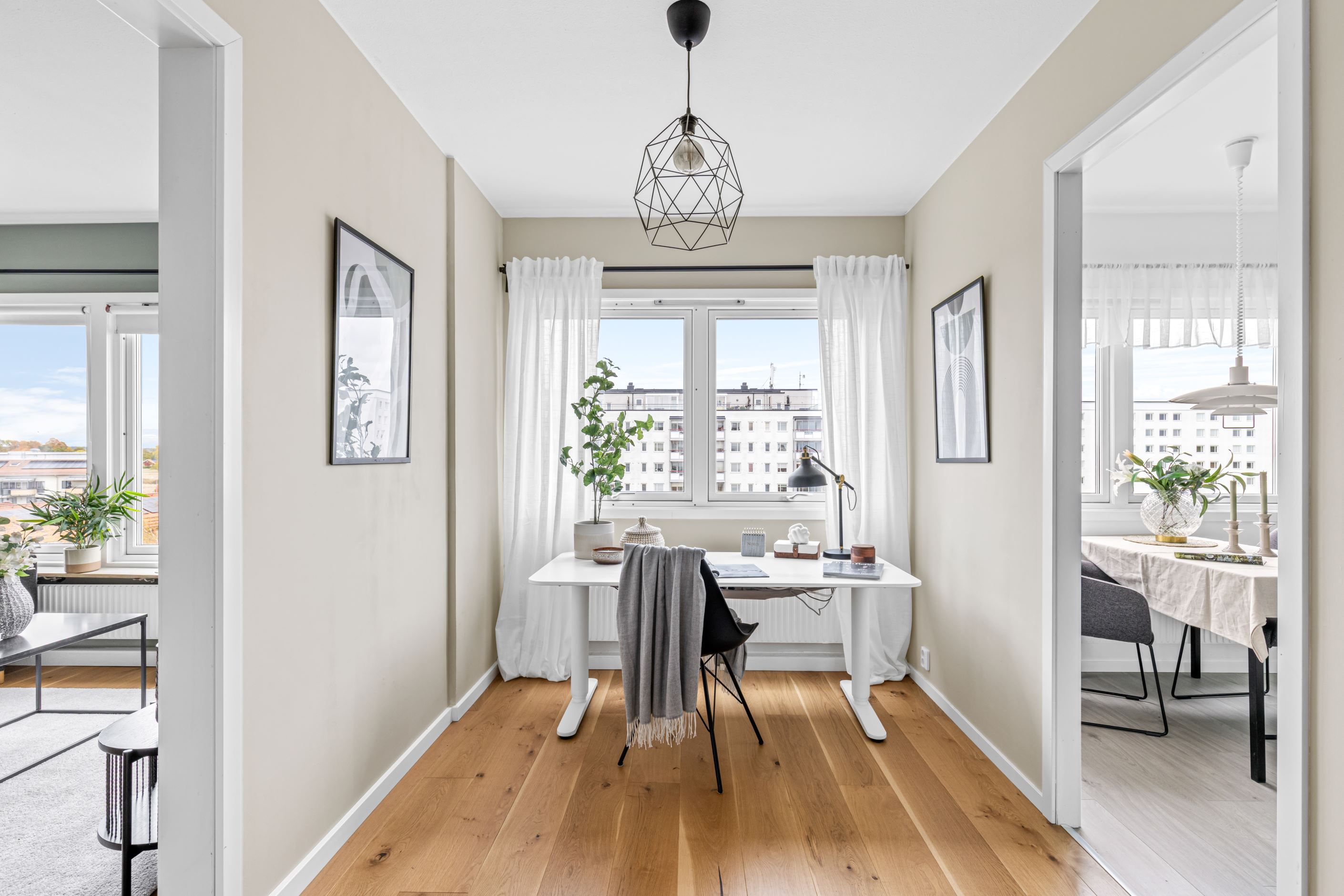 I hallen finns gott om förrådsutrymme i garderoberna och vidare finns en praktisk arbets- eller studiehörna, idealisk för dig som jobbar eller pluggar hemifrån. Här skapas en naturlig plats för fokus och produktivitet, utan att ta av bostadens övriga ytor.