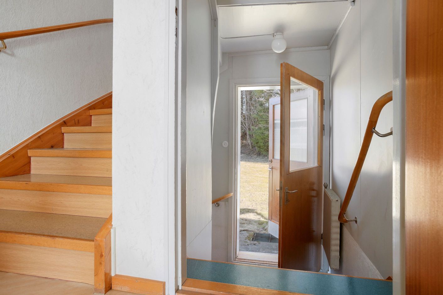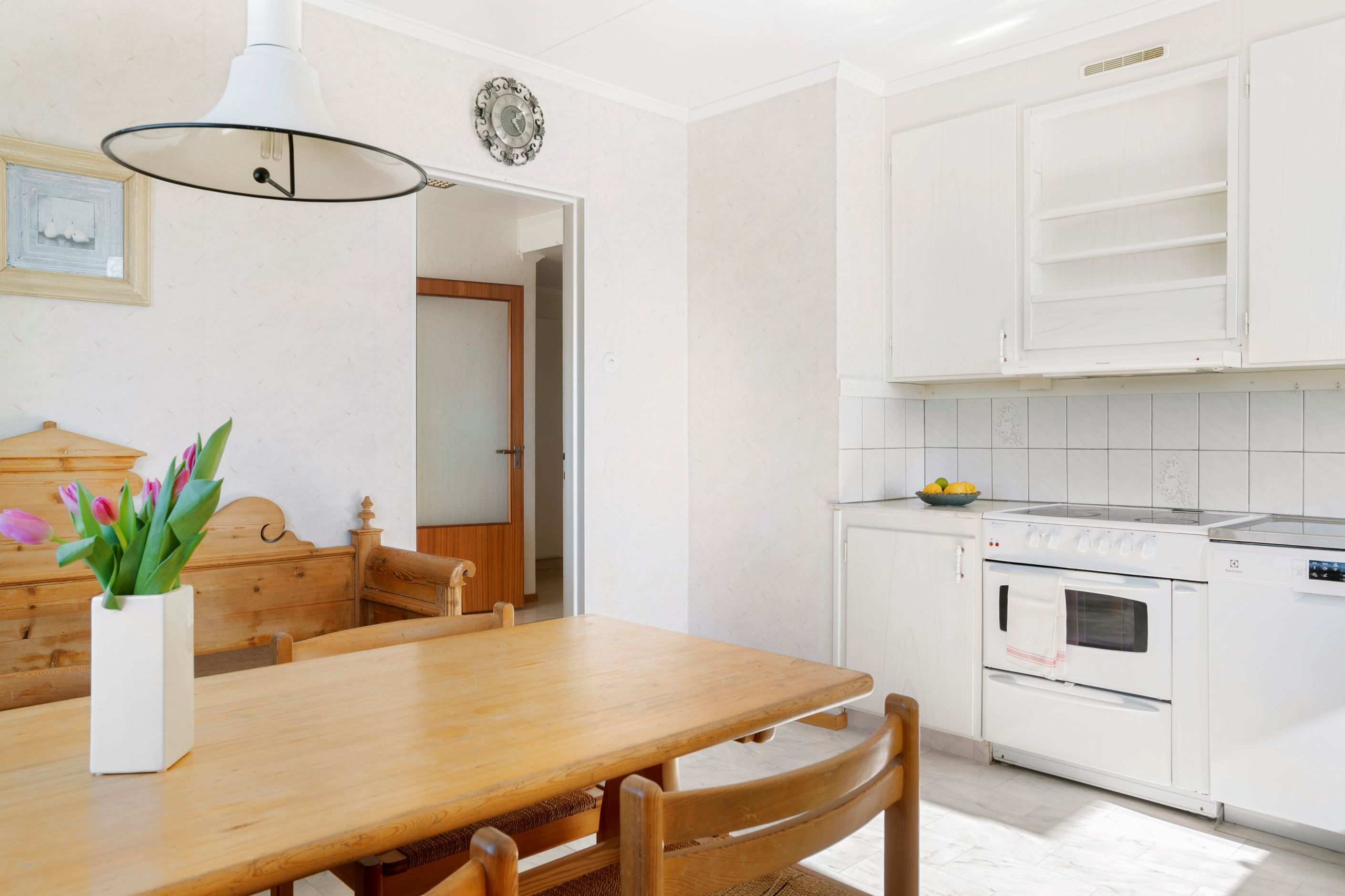 Huset har en välkommande hall med yta för klädavhängning samt bra med förvaring i form av garderober. Köket är rymligt med fönster åt två väderstreck vilket skapar ett härligt ljusflöde i rummet. Här finns gott om förvaringsmöjligheter och bra arbetsytor. Köksutrustningen består av spis med häll, köksfläkt, kombinerad kyl/frys och diskmaskin.