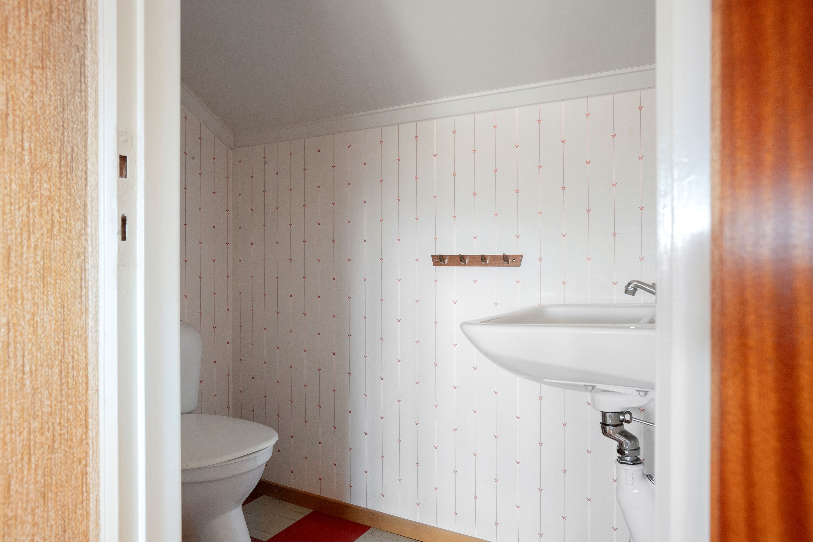 Rummet har vägg- och golvmatta och här finns wc, handfat, badrumsskåp och spegel.