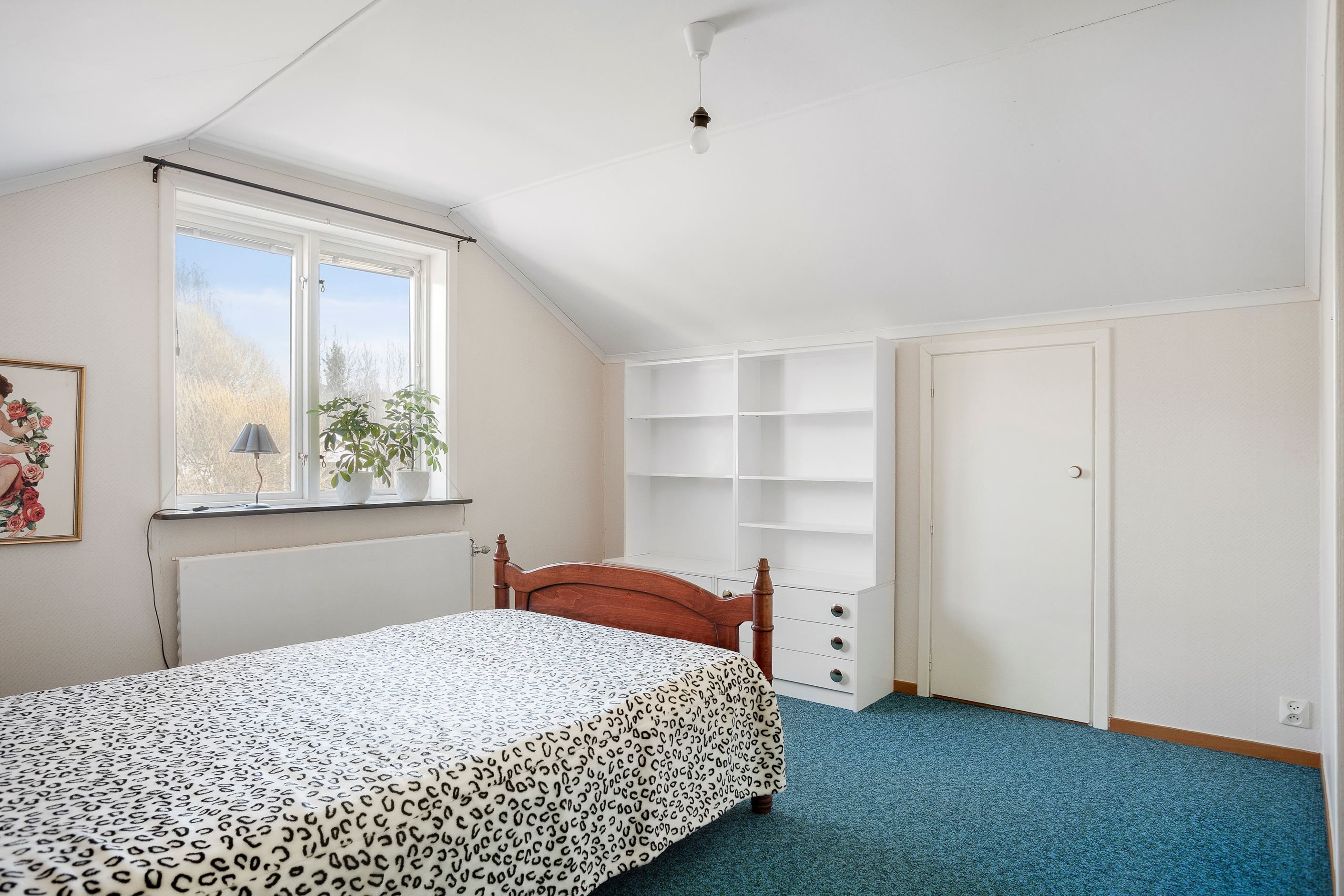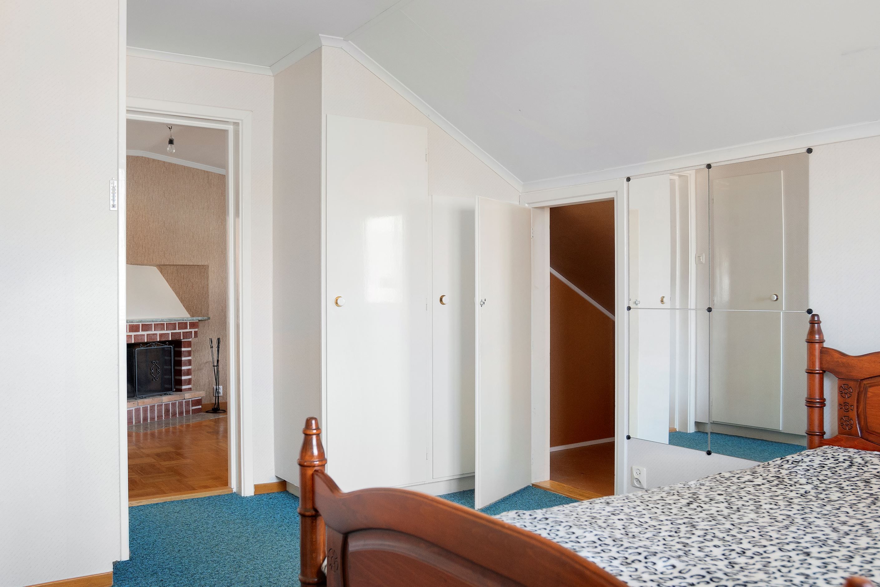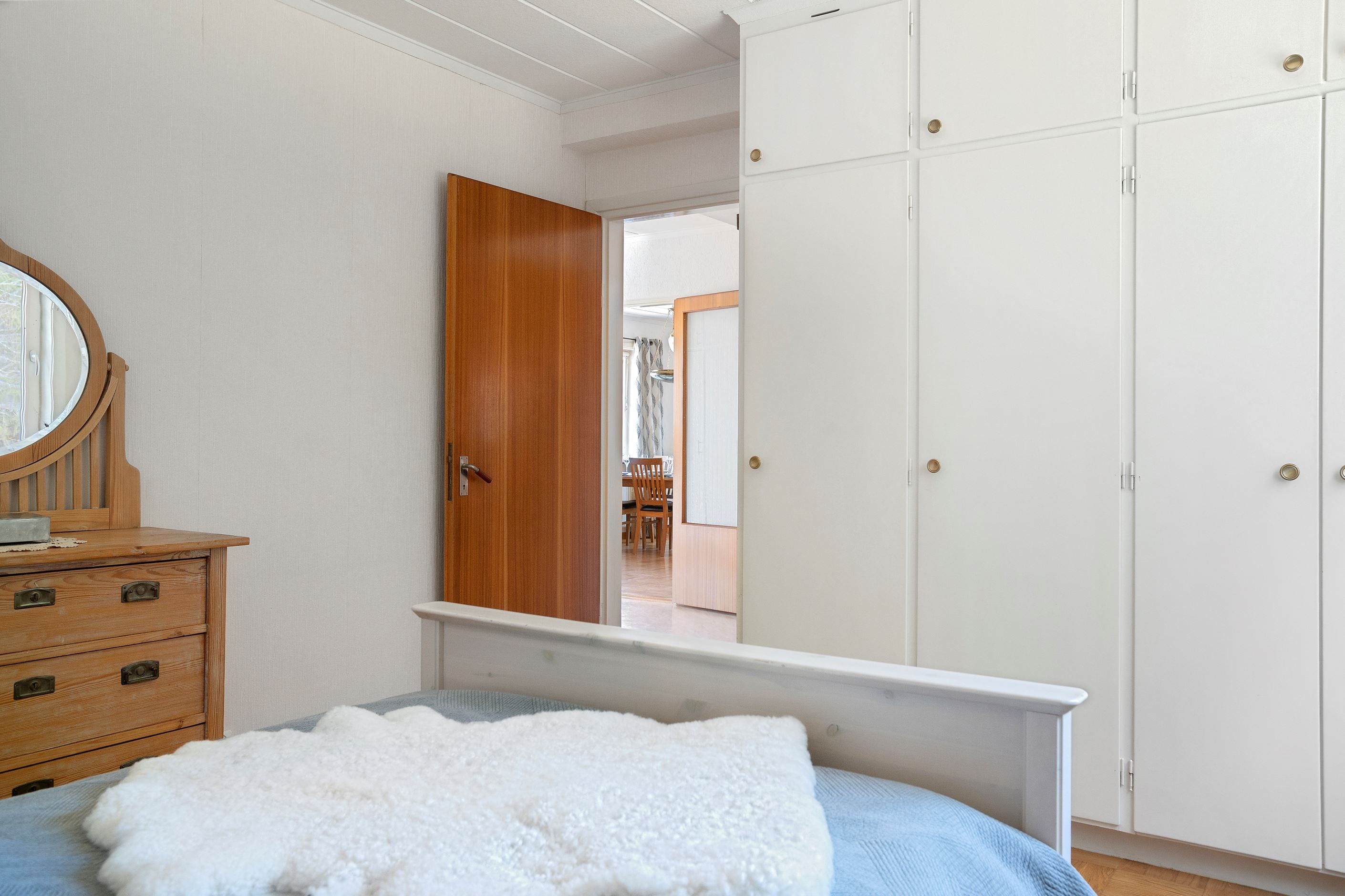 Sovrummet på entréplan är stort nog för dubbelsäng, sängbord och annan önskvärd möblering. Rummet har praktisk garderobsvägg, vita väggar och samma vackra parkettgolv i ek.