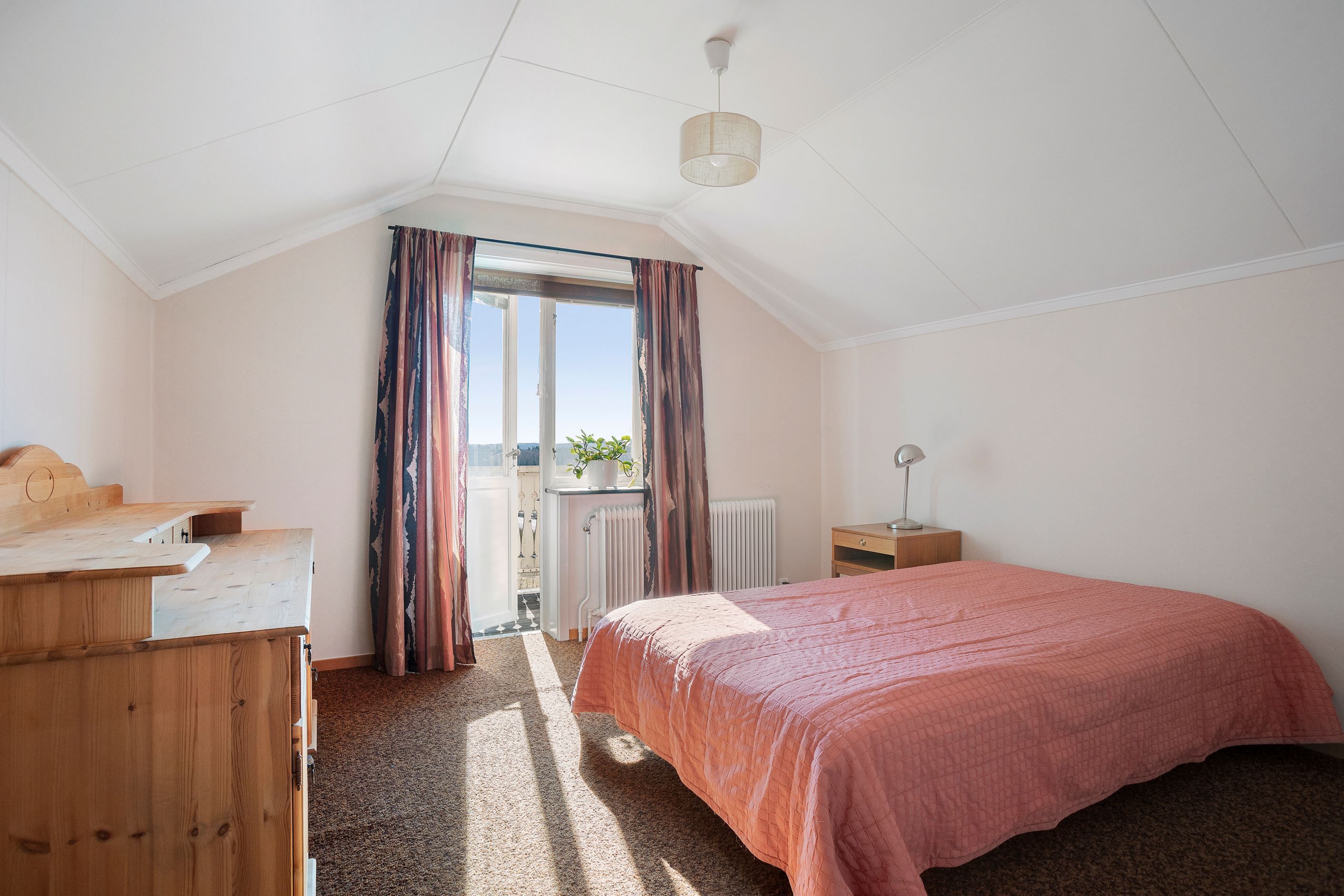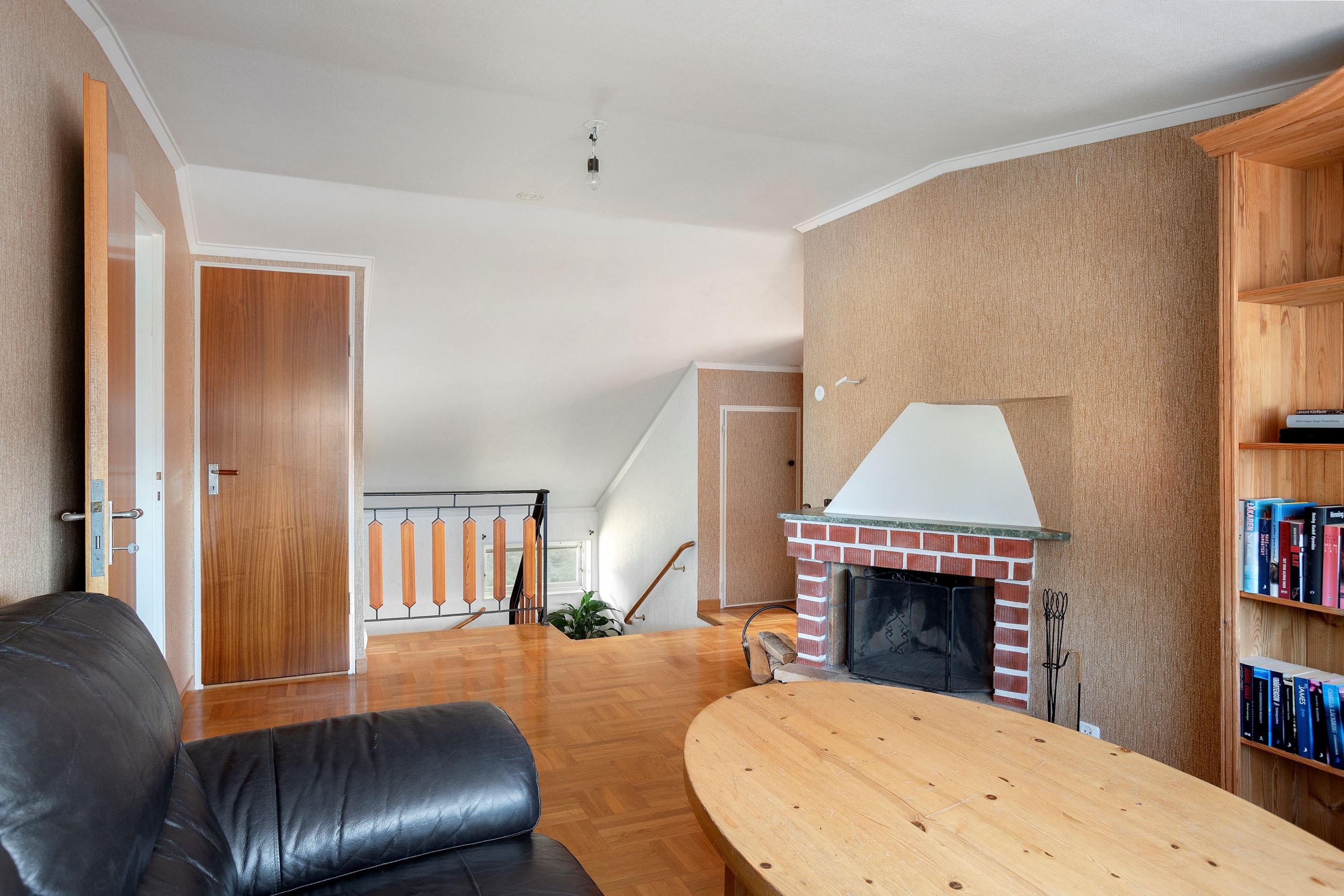 På övre plan finns ett fint allrum med öppen spis och vackert parkettgolv samt med en toalett intill. Här finns även två rymliga sovrum med väldigt stora och isolerade sidovindsförråd samt garderober. Från ena sovrummet finns en balkong med vacker utsikt utöver ängar och natur.