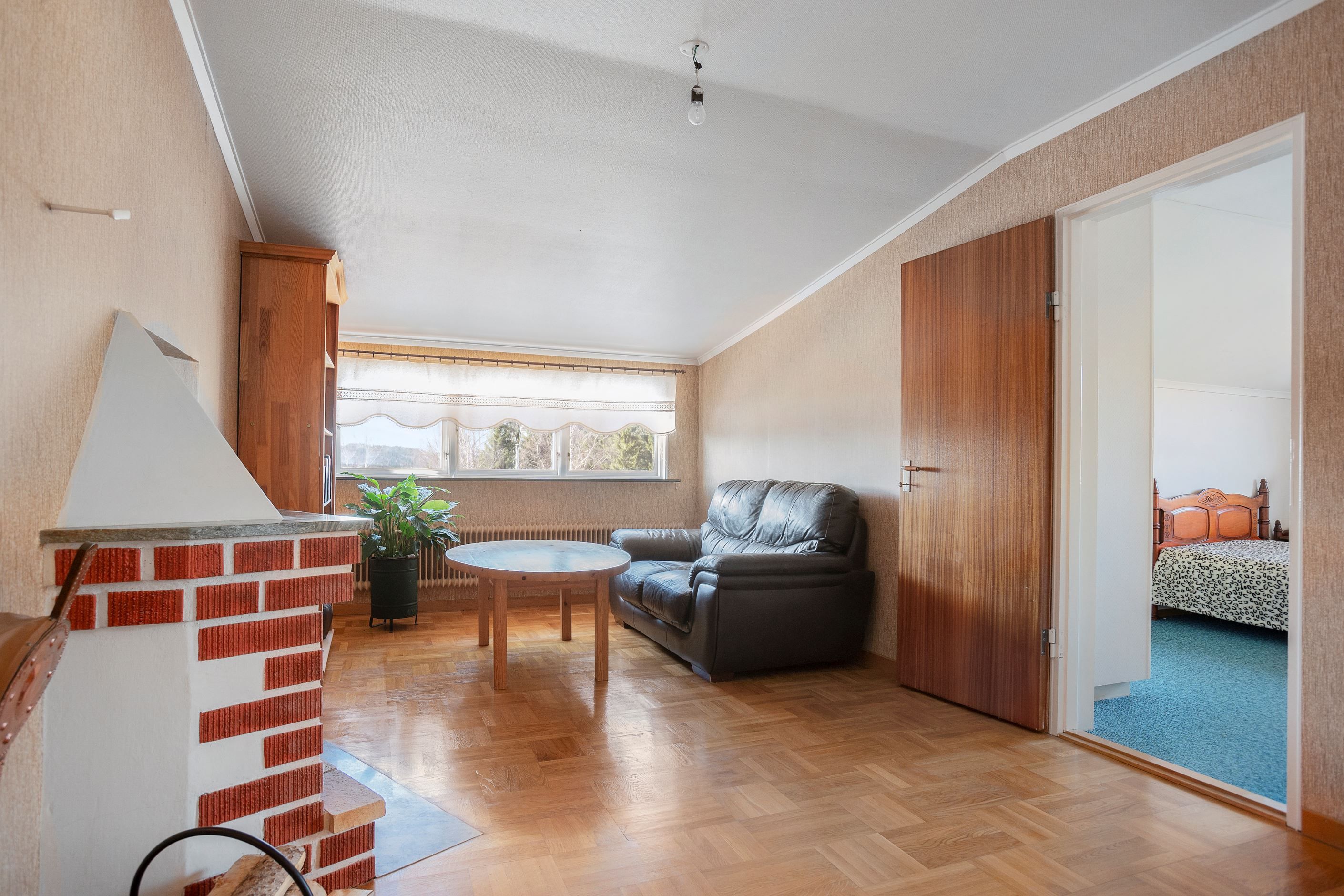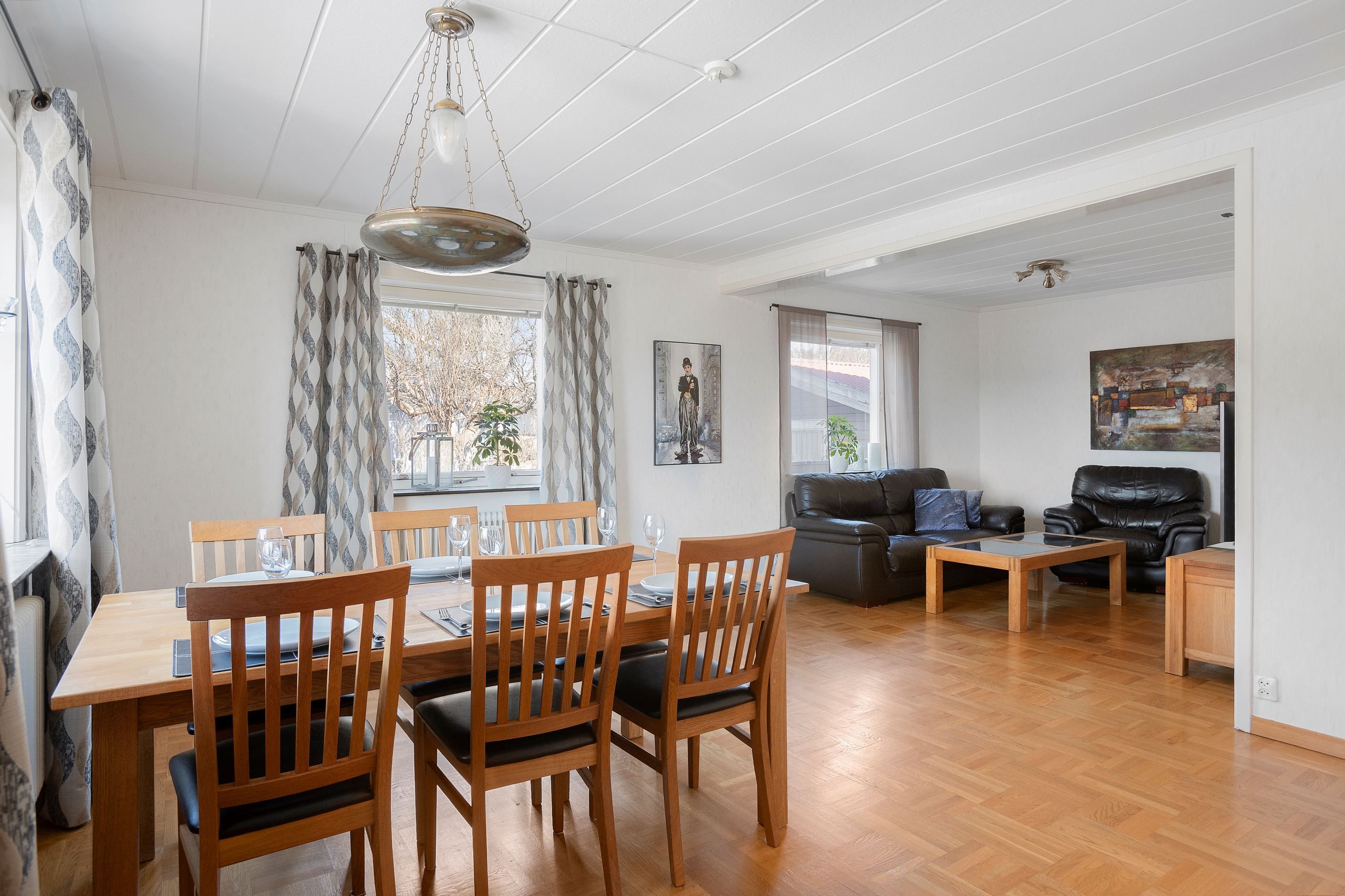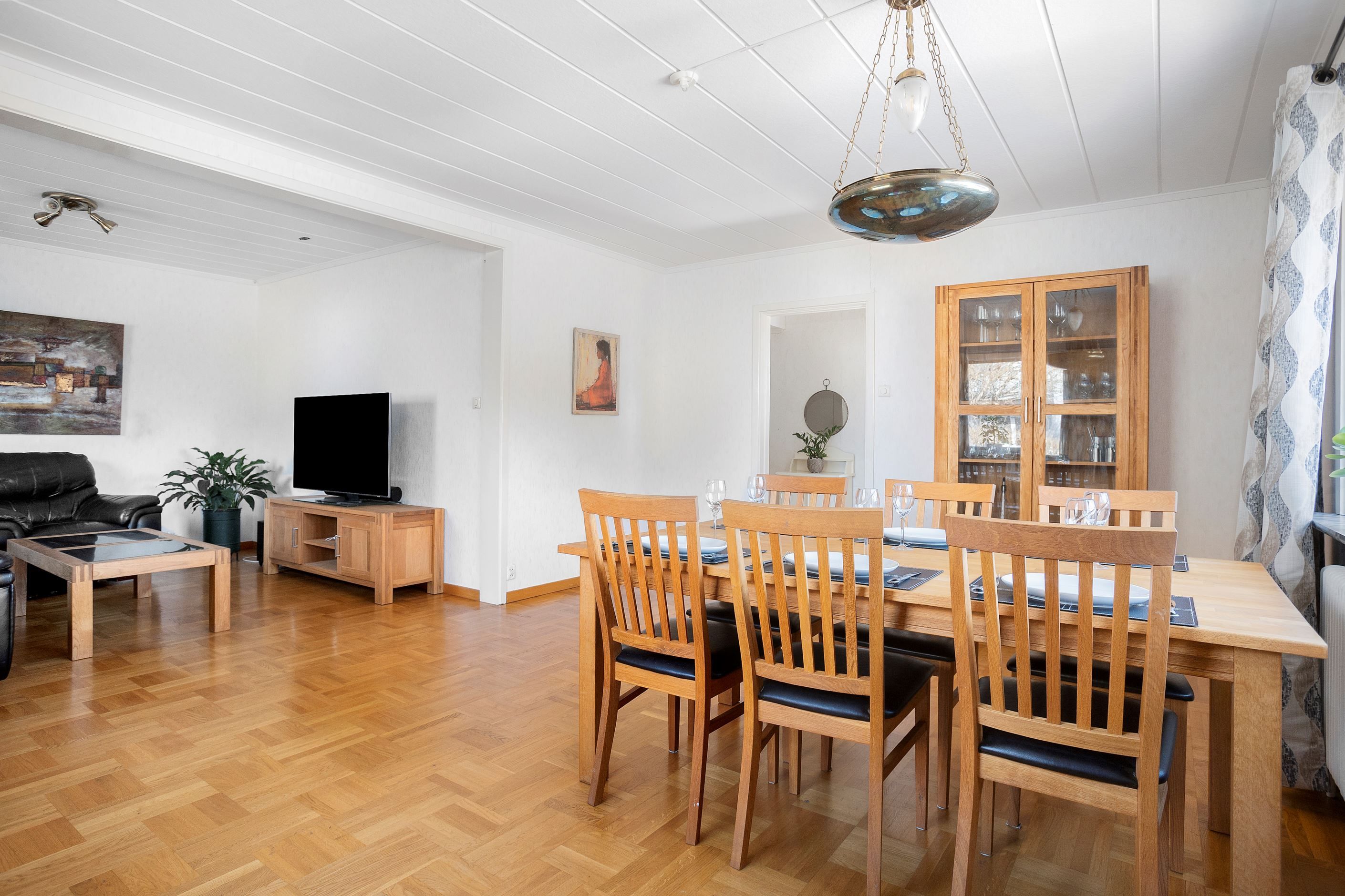 Vardagsrummet är ursprungligen även ett sovrum vilket går att återställa om så önskas. Idag är rummet stort och rymmer utan problem mat- och soffgrupp samt tv-möbel utan problem. Rummet har vita väggar och ett vackert parkettgolv av ek.
