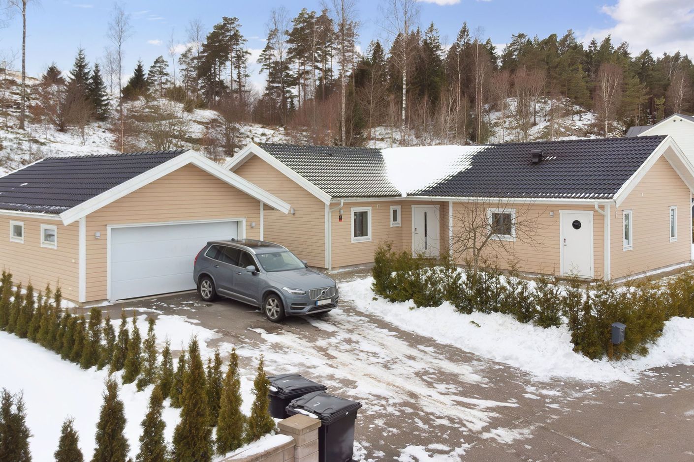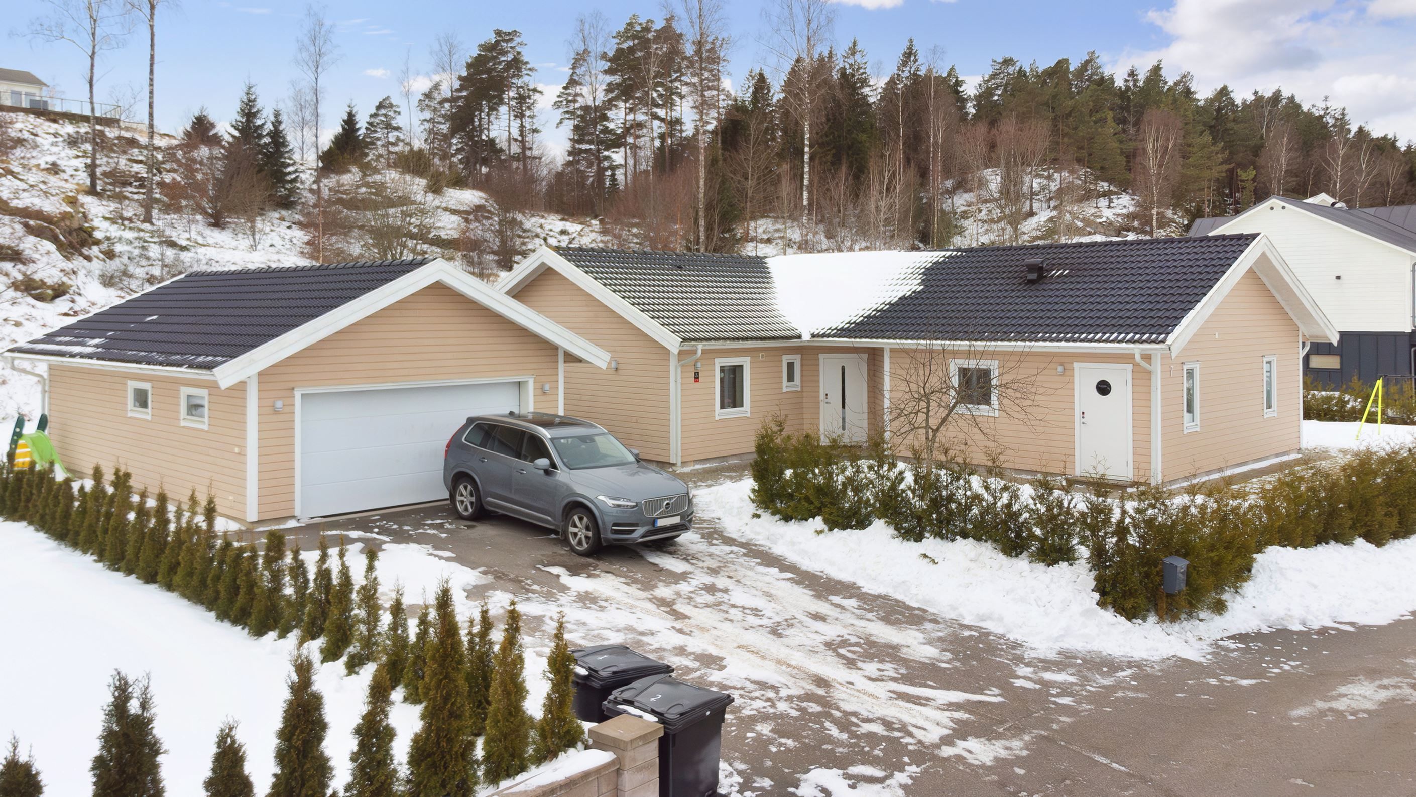 Den rymliga uppfarten ger plats för flera fordon och kompletteras av ett fristående garage med gjuten betongplatta – utmärkt för bil, förvaring eller hobbyverksamhet. Tomten bjuder på fina möjligheter till både avkoppling och lek, med gott om utrymme för uteplatser och framtida idéer.