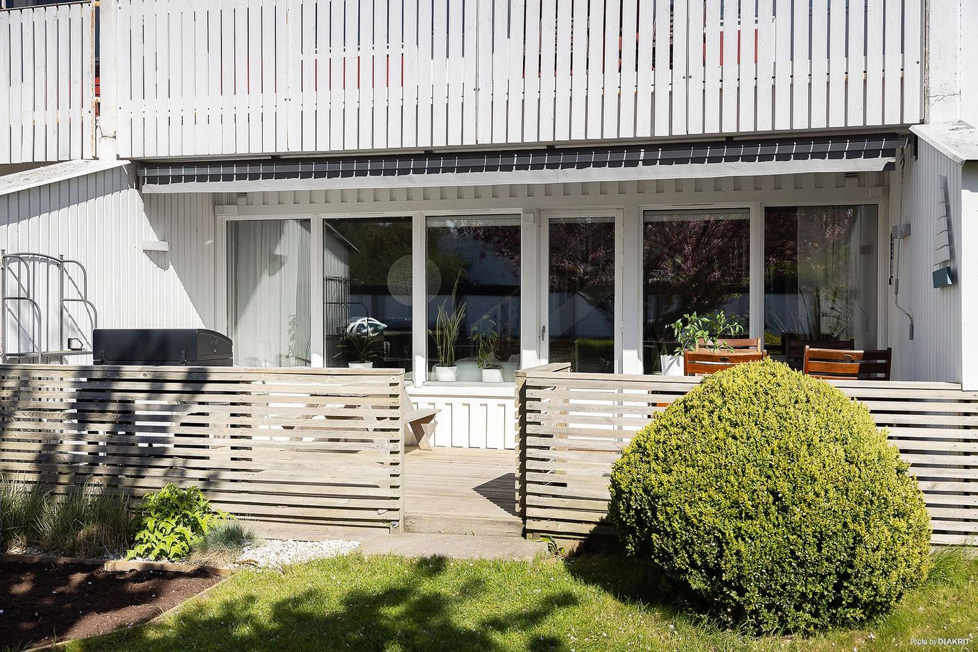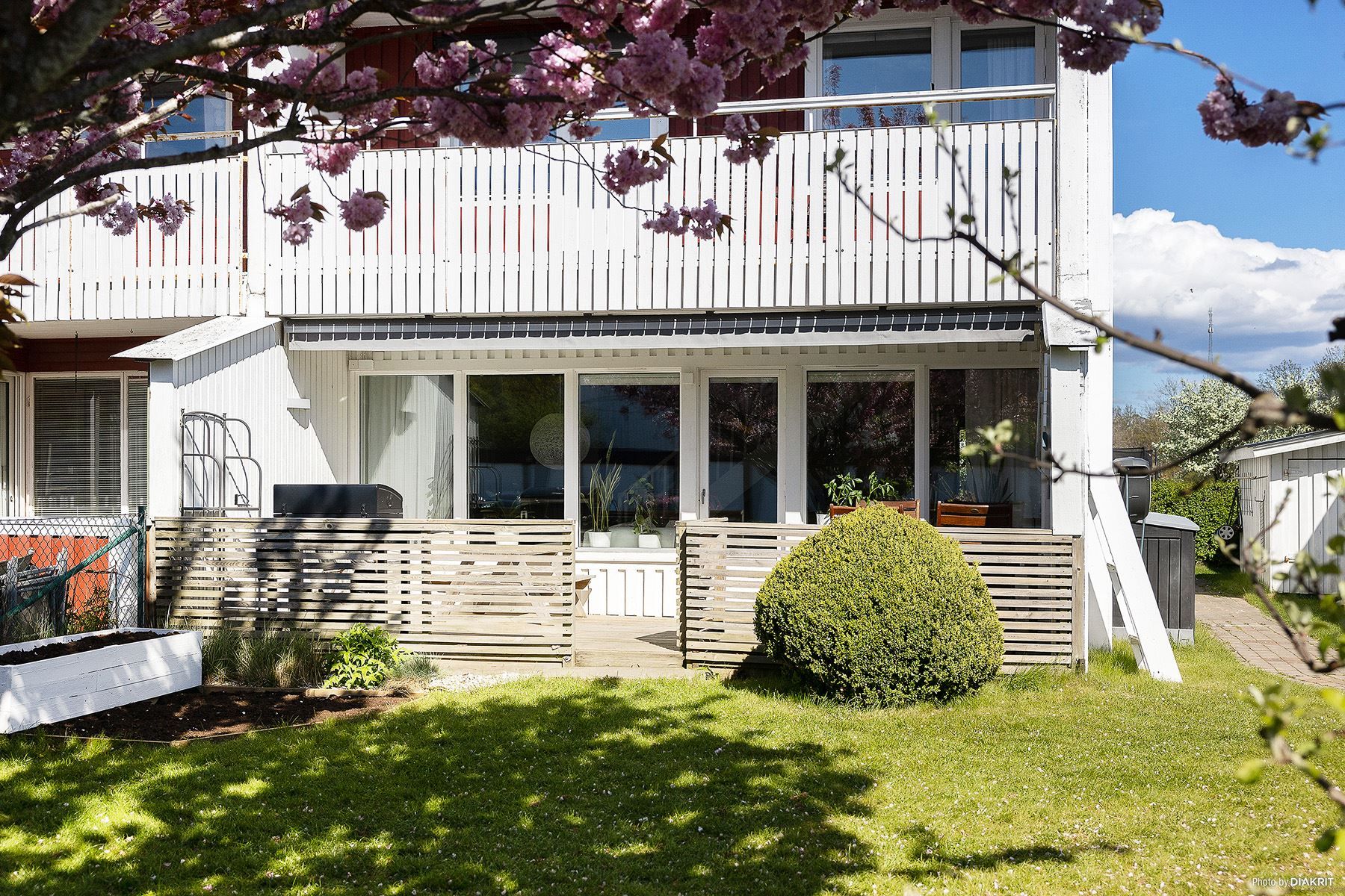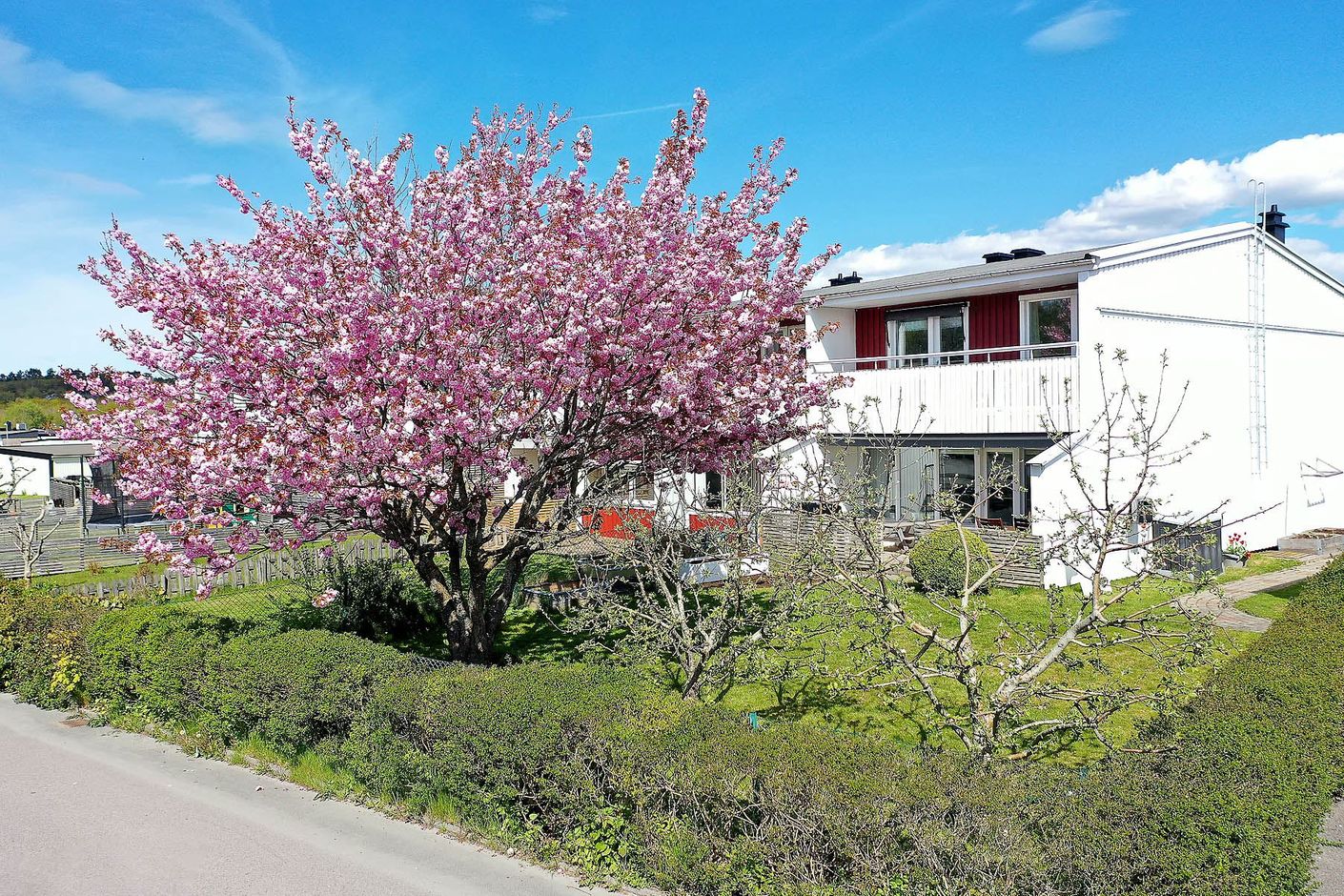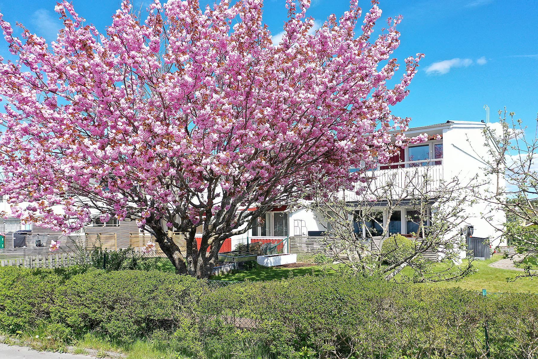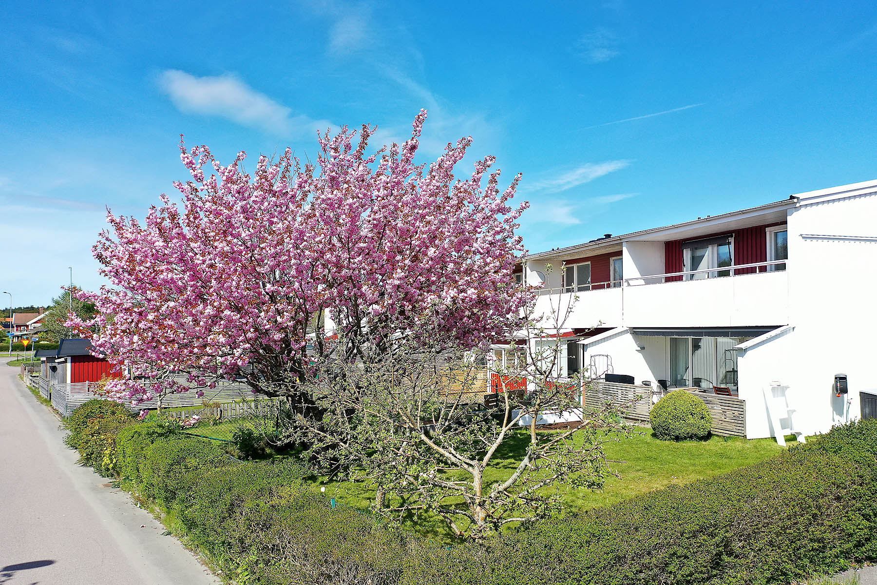 På framsidan möts du av en stillsam och skyddad miljö med gott om plats för utemöbler. Här finns perfekta förutsättningar för att avnjuta sommarens frukostar i morgonsolen eller koppla av med en bok i en lugn atmosfär. På tomten finns även ett extra förråd som ger praktisk förvaring för säsongssaker såsom cyklar, utemöbler och trädgårdstillbehör.