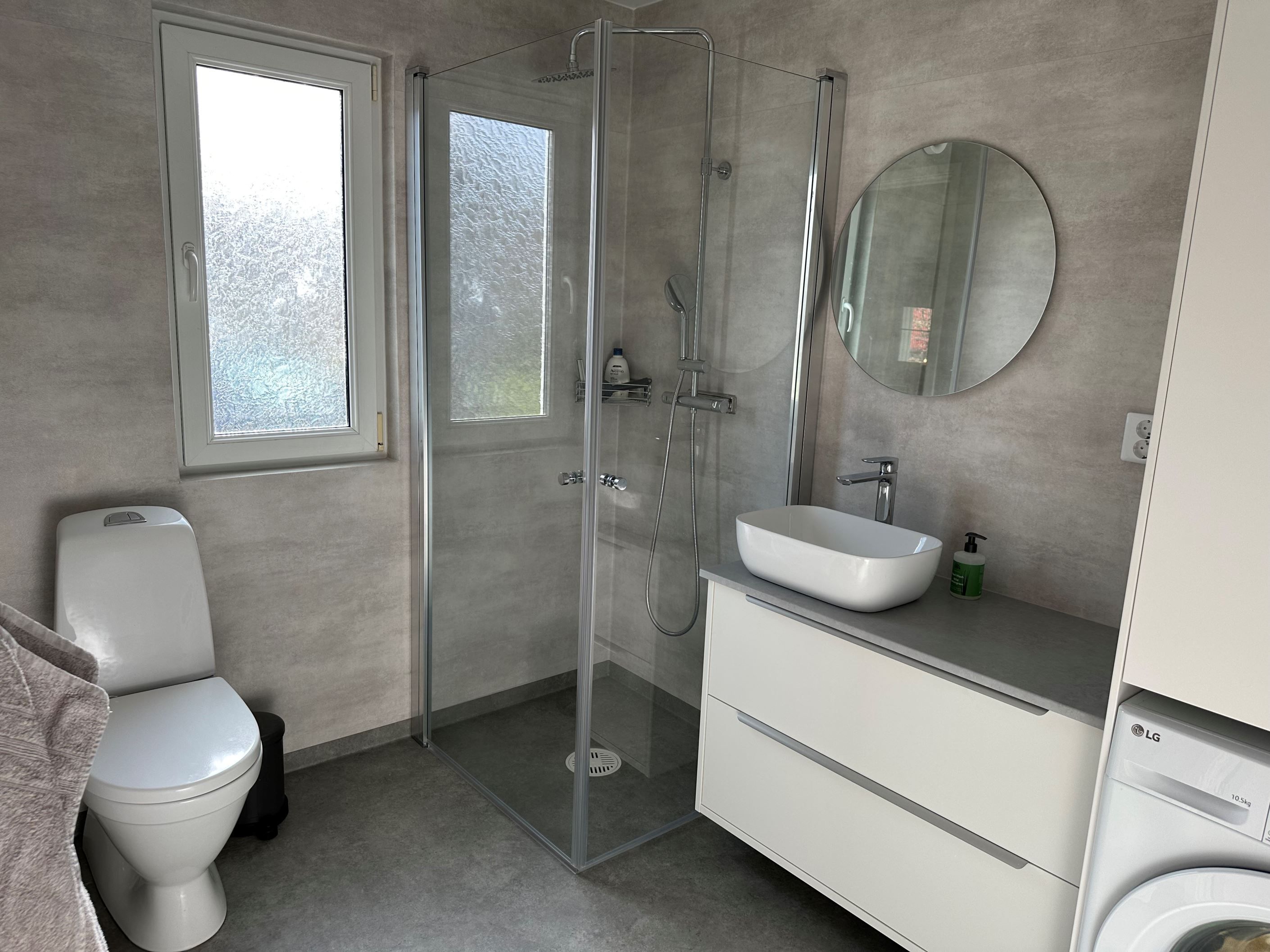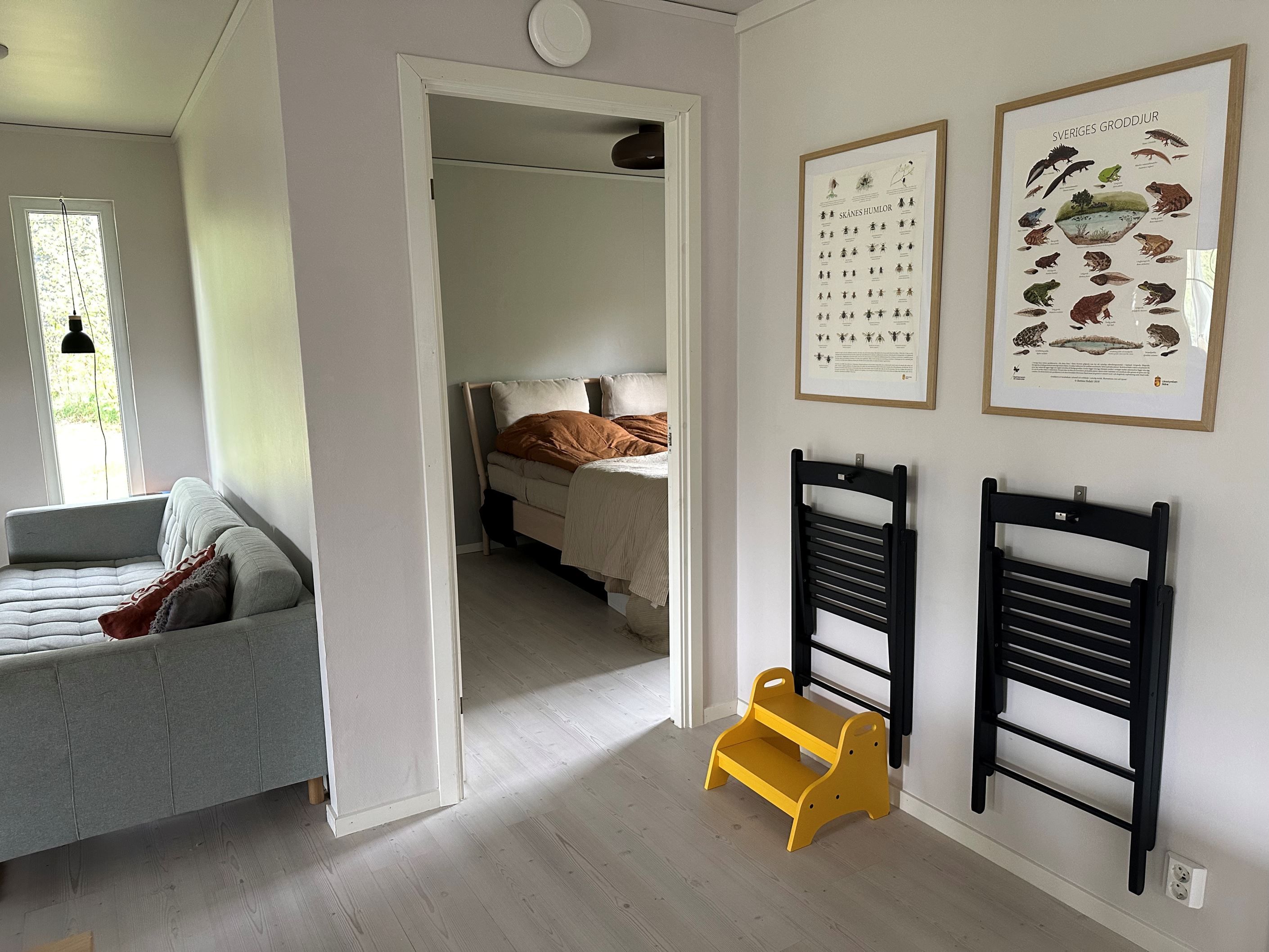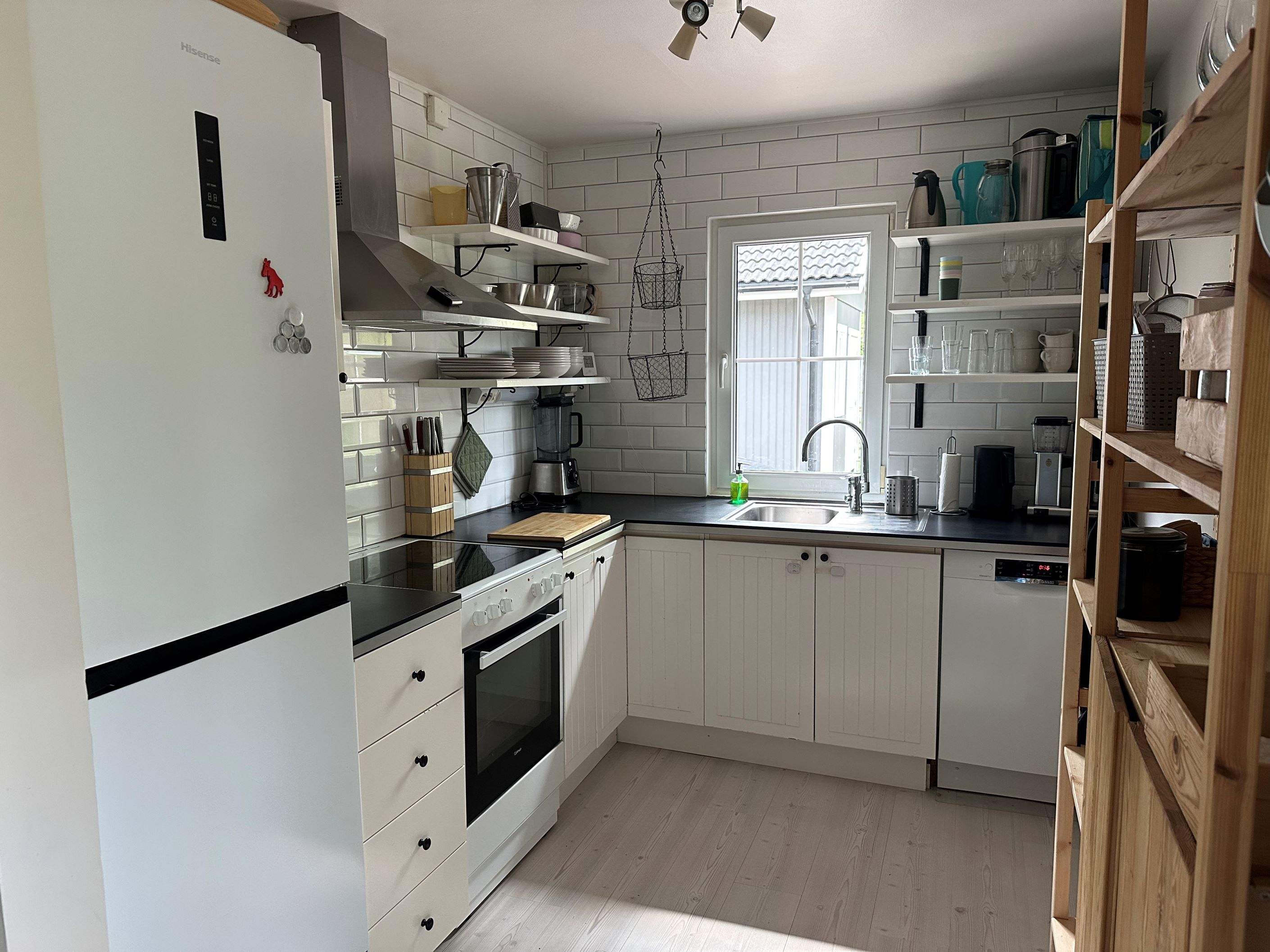 Köket är modernt utrustat och erbjuder goda arbetsytor, medan vardagsrummet skapar en trivsam miljö för umgänge. Badrummet renoverades så sent som 2025 och är stilrent inrett med dusch, WC, tvättställ samt tvättmaskin.