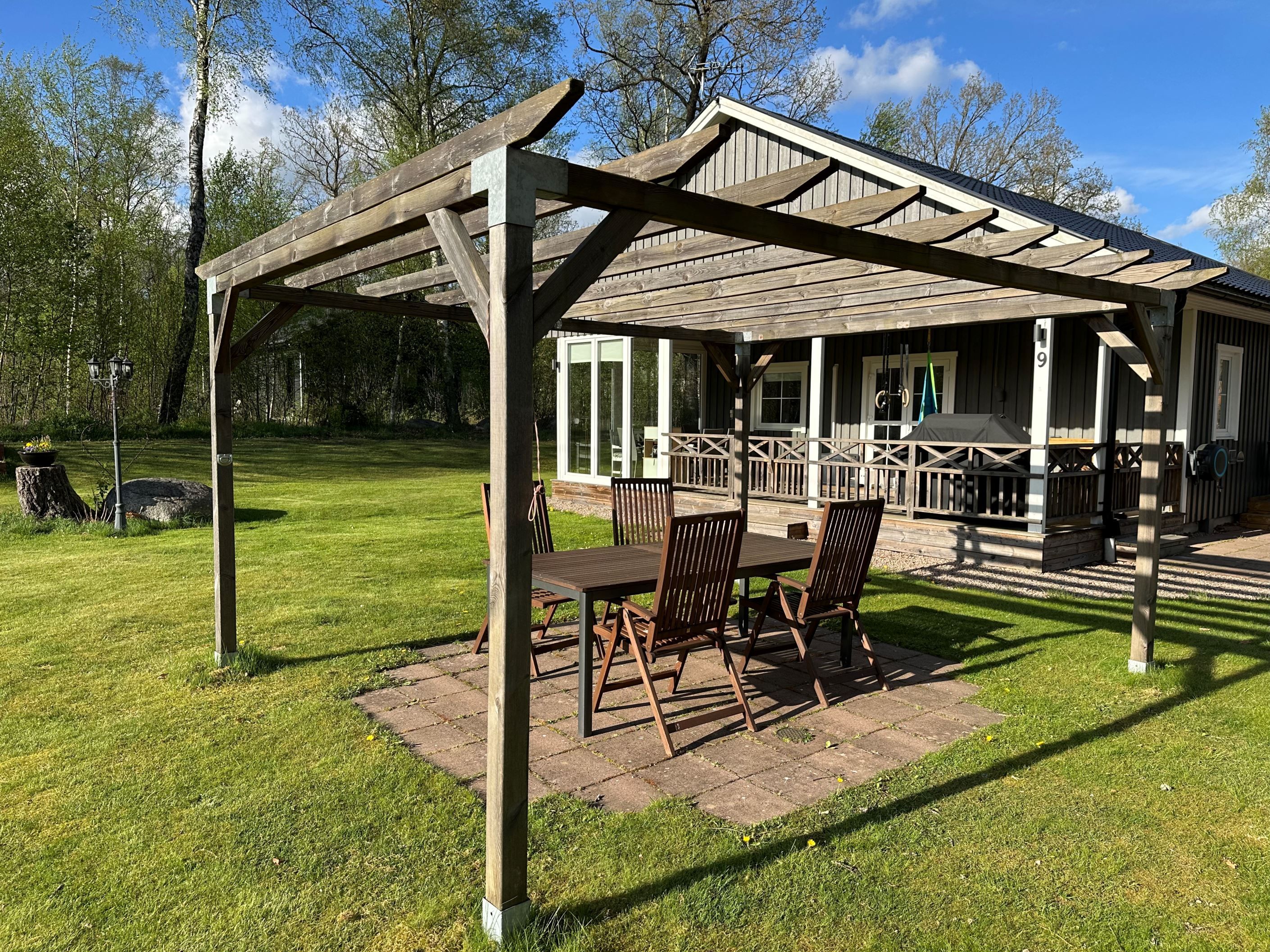 På den lättskötta och generösa tomten finns gott om utrymme för både lek och trädgårdsdrömmar. Här finns en stensatt uteplats med pergola, en stor gräsyta samt en rymlig grusad uppfart med plats för flera bilar. Tomten har ett trevligt läge med sol stora delar av dagen.