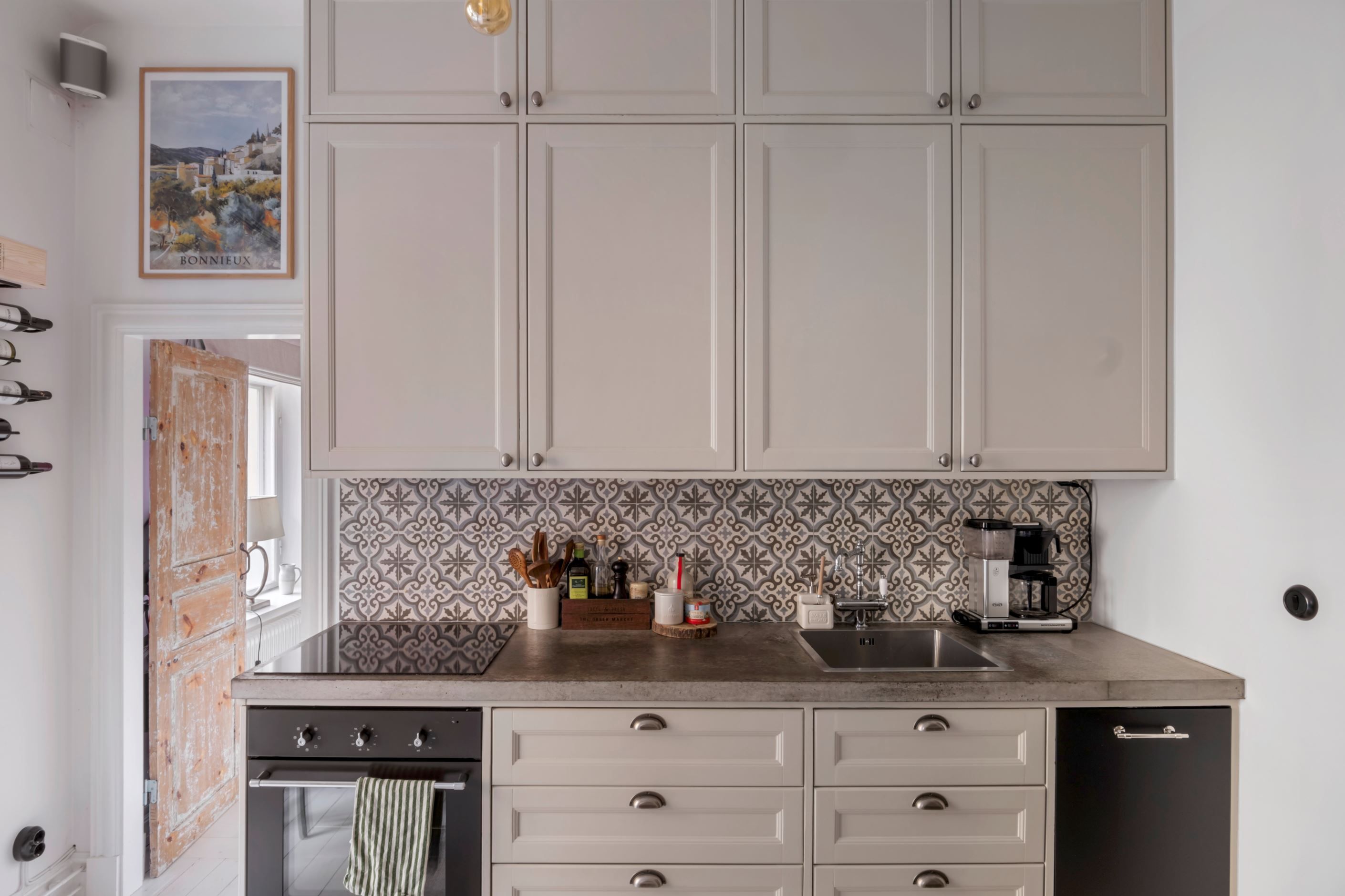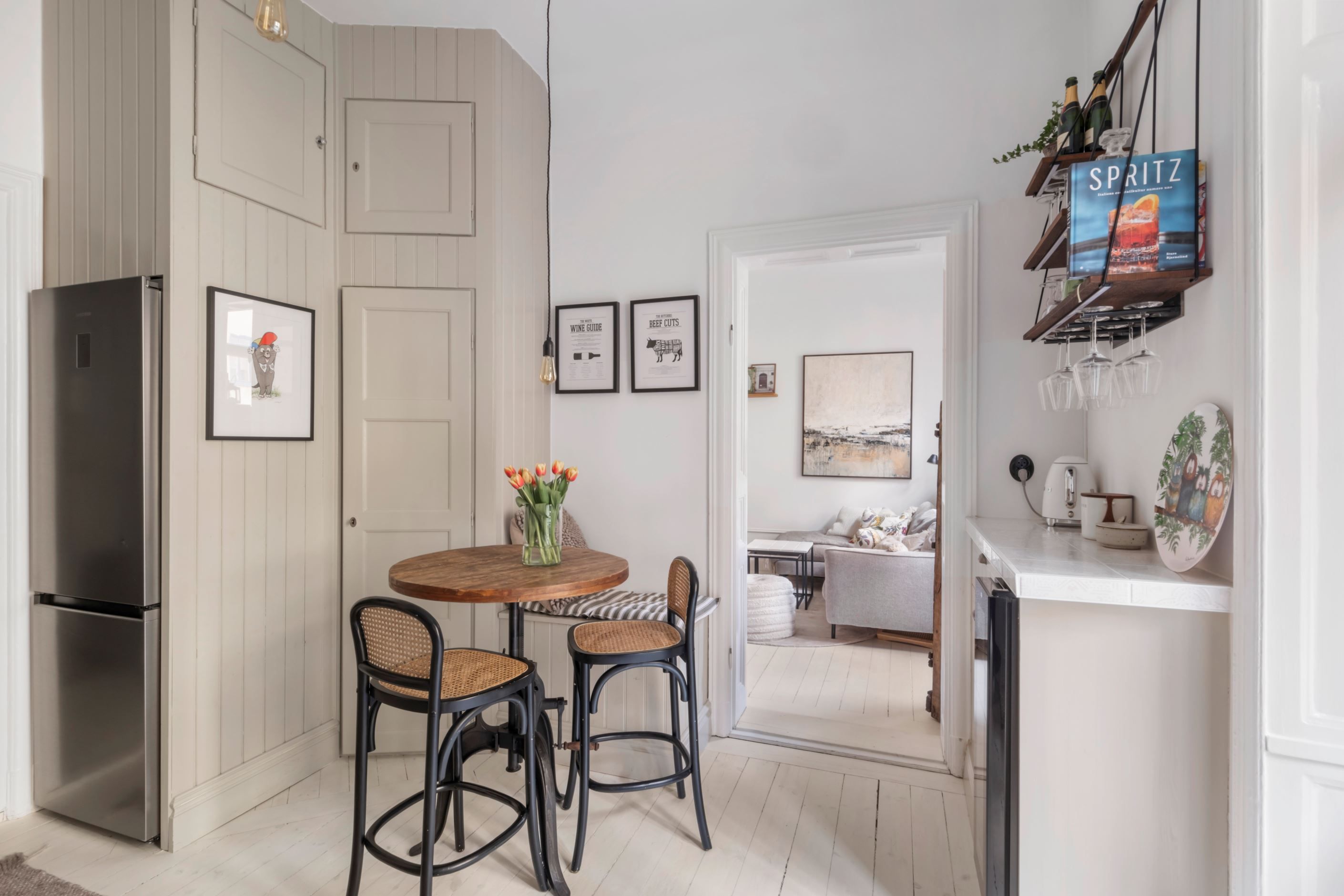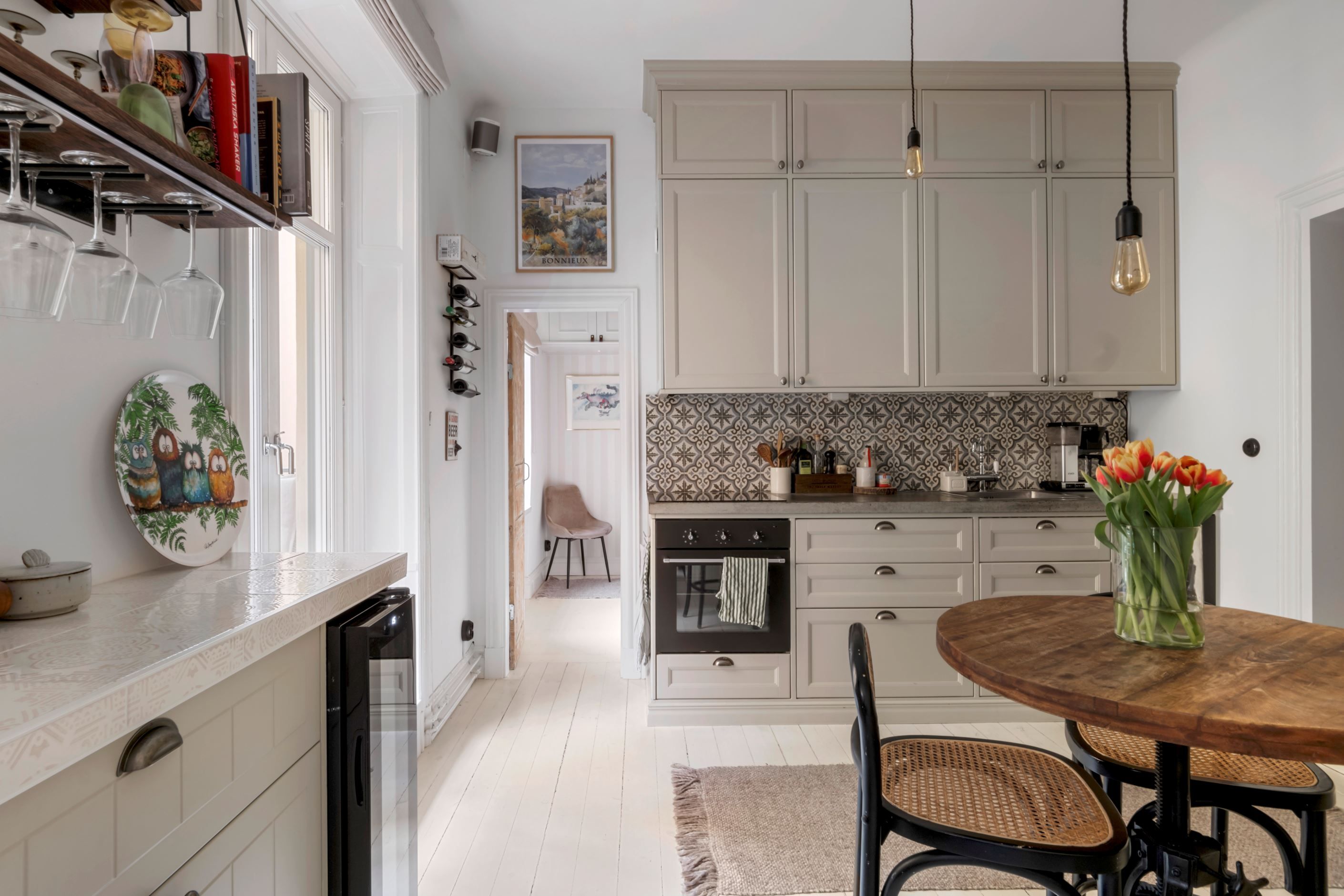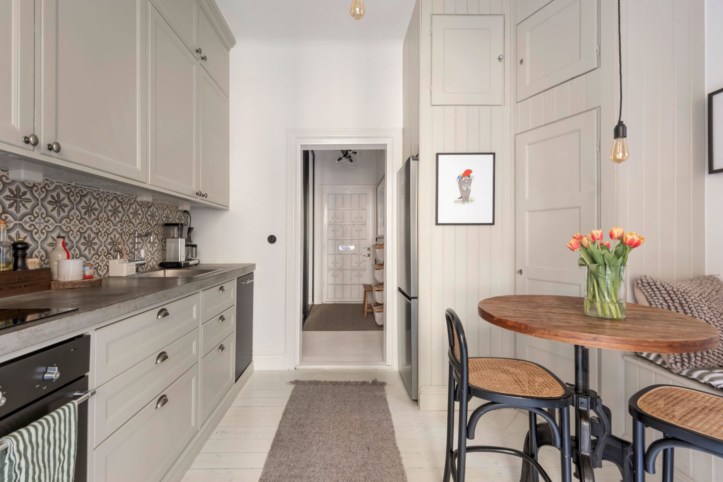 Lägenheten är genomgående i mycket fint skick med smakfulla materialval och vackra sekelskiftesdetaljer. Det stilrena köket är fullt utrustat med kyl/frys, spis, ugn, diskmaskin samt vinkyl. Badrummet är snyggt och stilrent, stambytt och renoverat 2020/2021, med wc, handfat, dusch bakom duschvägg samt tvättmaskin för extra bekvämlighet.