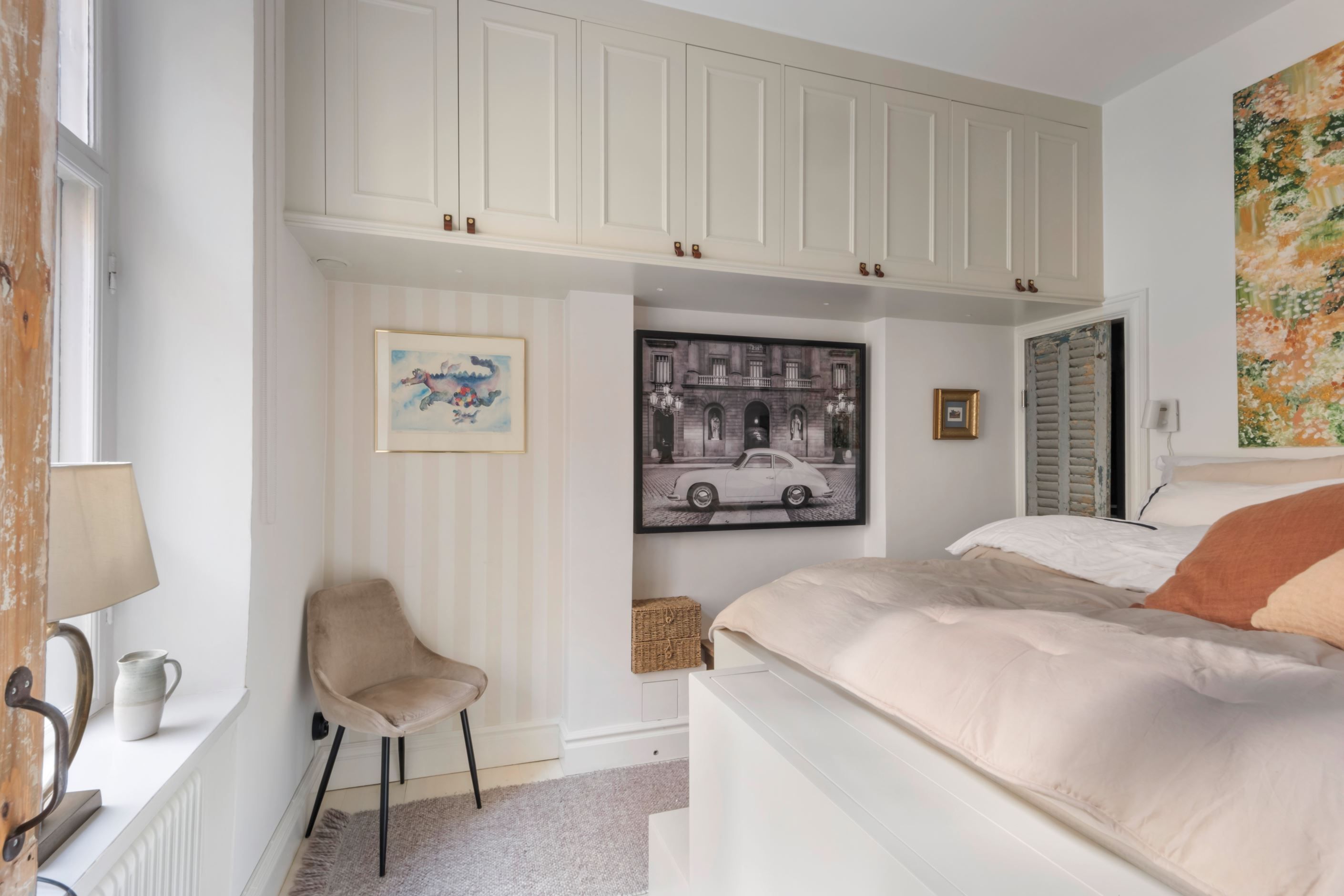 Sovrummet är både smart och trivsamt utformat med en platsbyggd säng med generös förvaring under. Här finns även en diskret, dold TV-lösning som bidrar till det stilrena intrycket. Förvaringsmöjligheterna är mycket goda tack vare en rymlig walk-in closet i sovrummet samt platsbyggda överskåp i sovrummet som gör det enkelt att hålla ordning och reda.