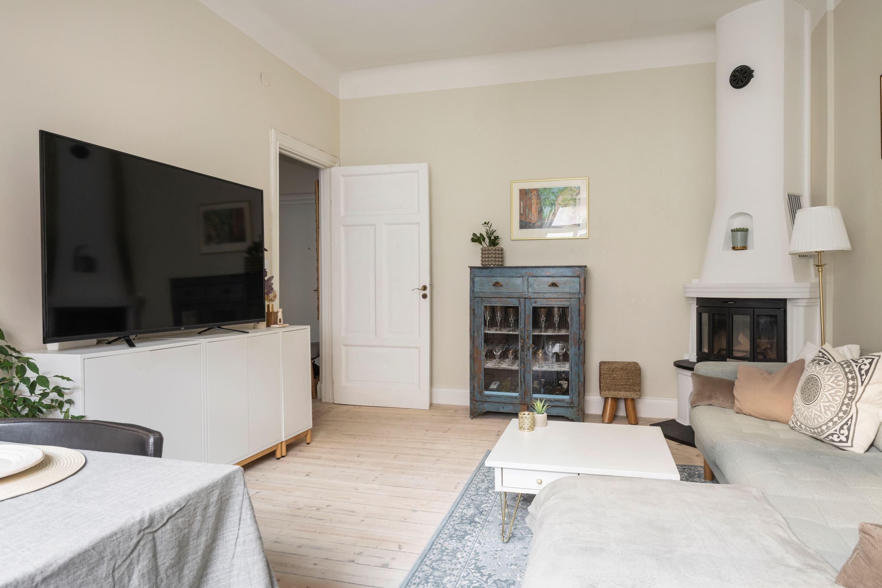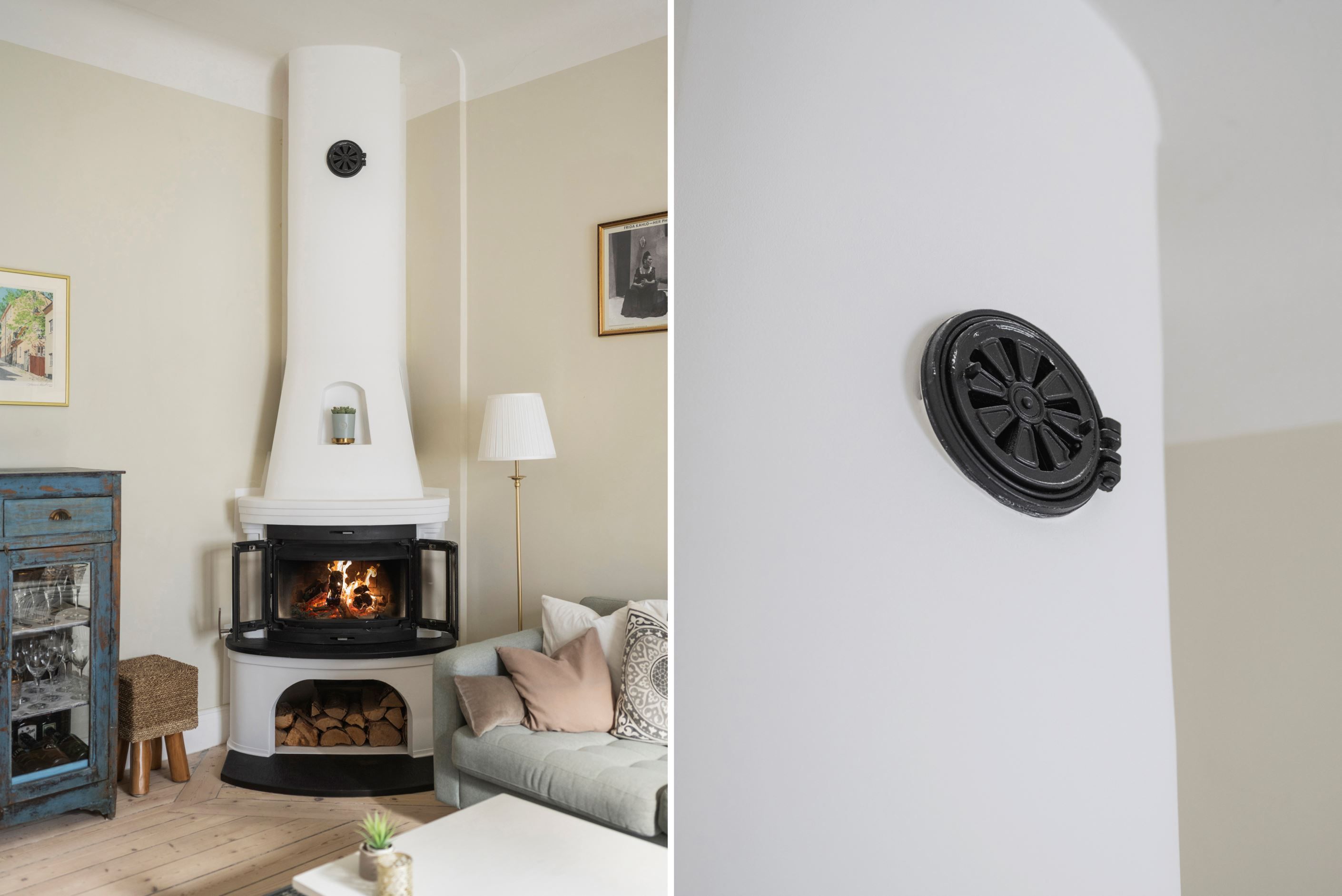 Bostaden erbjuder fungerande eldstad och en södervänd balkong utöver tidstypisk charm och fina originaldetaljer.