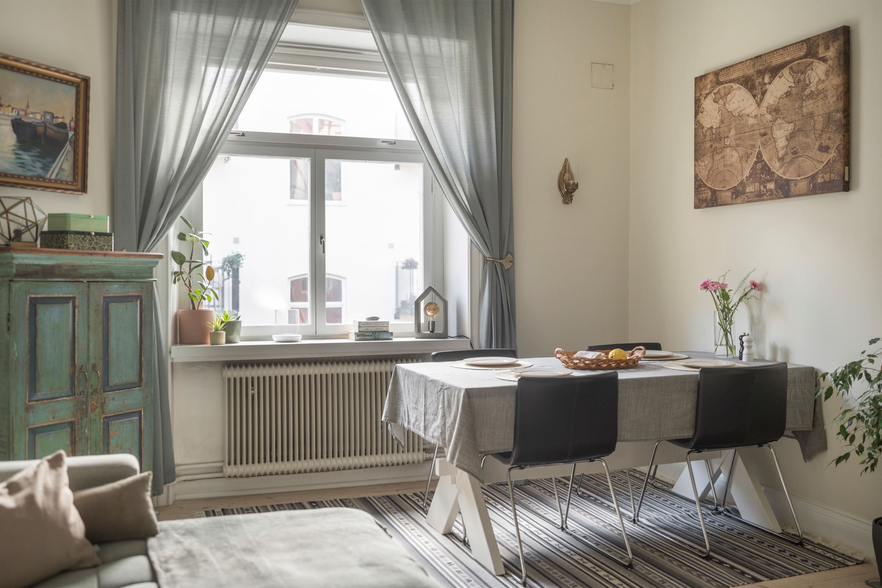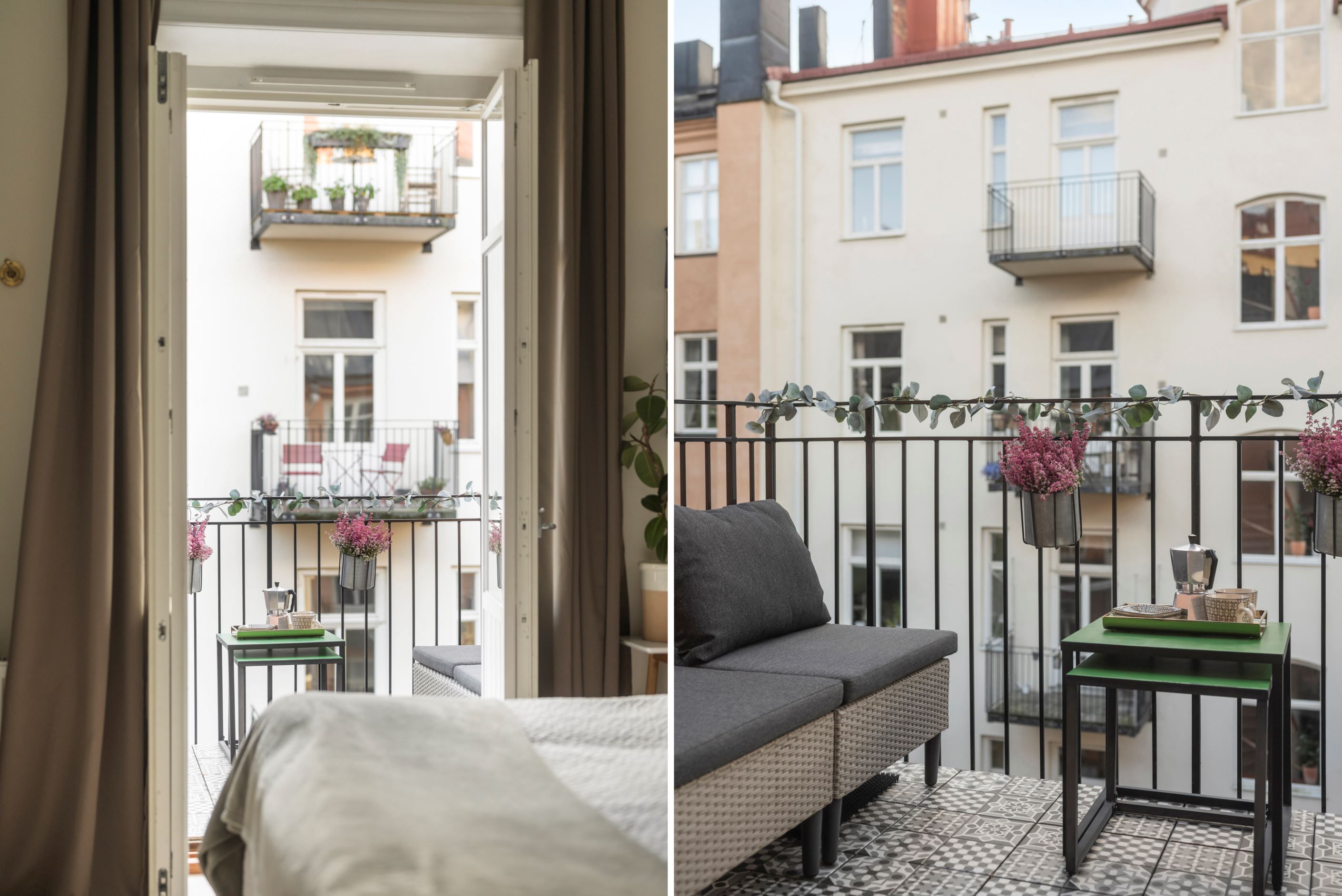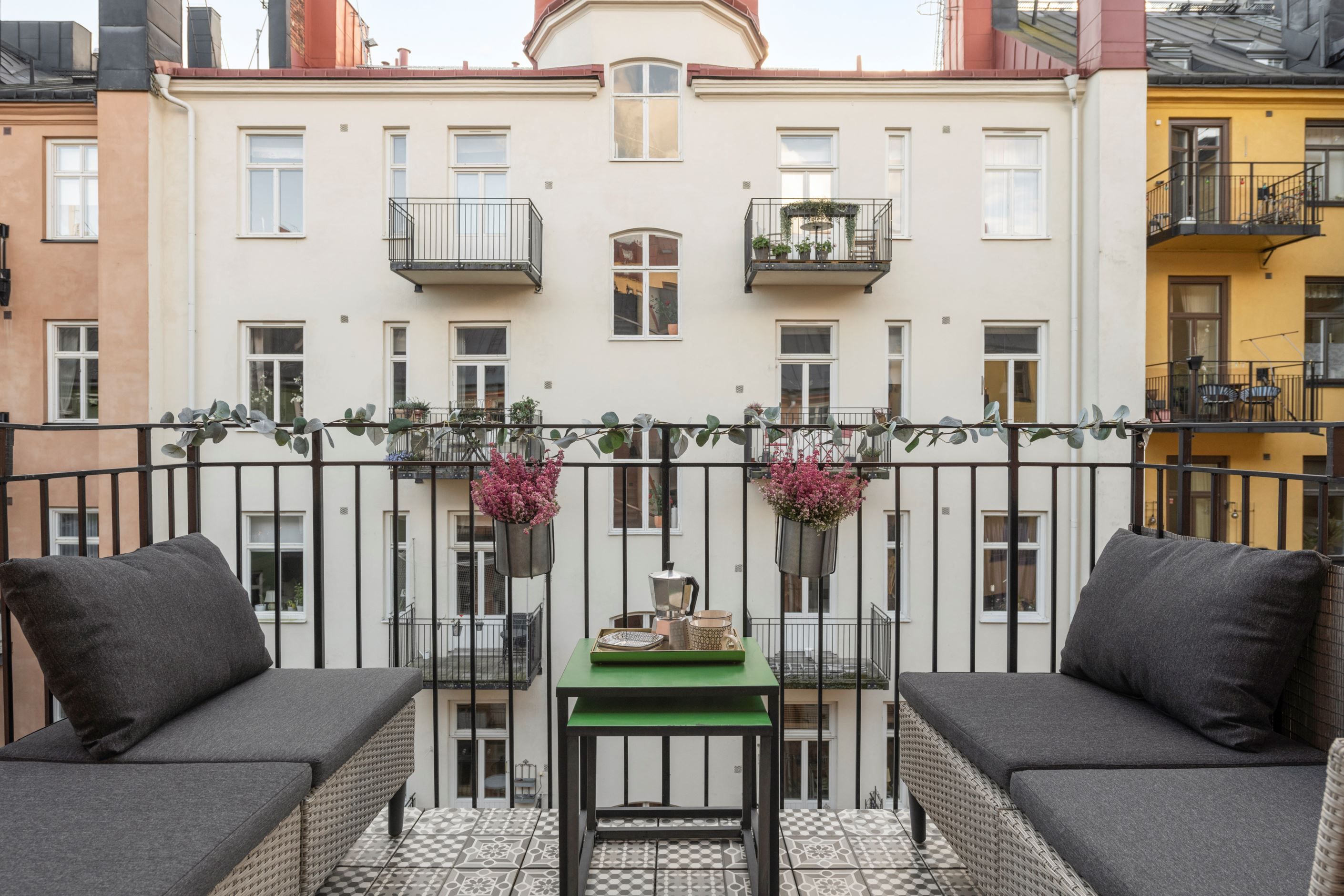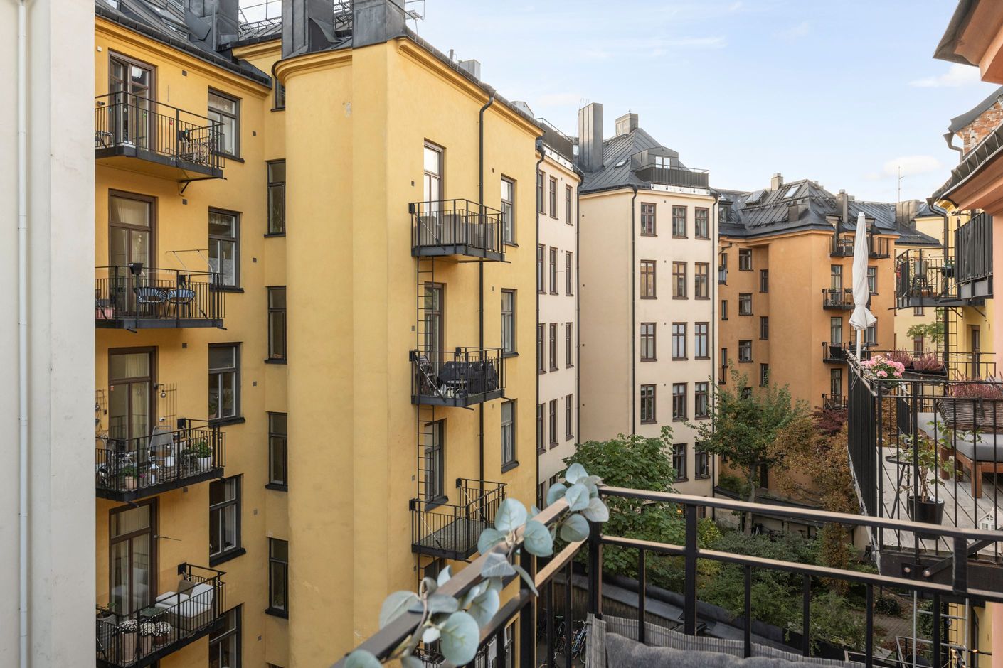 Här bor du högt upp, omsluten av två stillsamma innergårdar, med generösa fönsterpartier i fil.