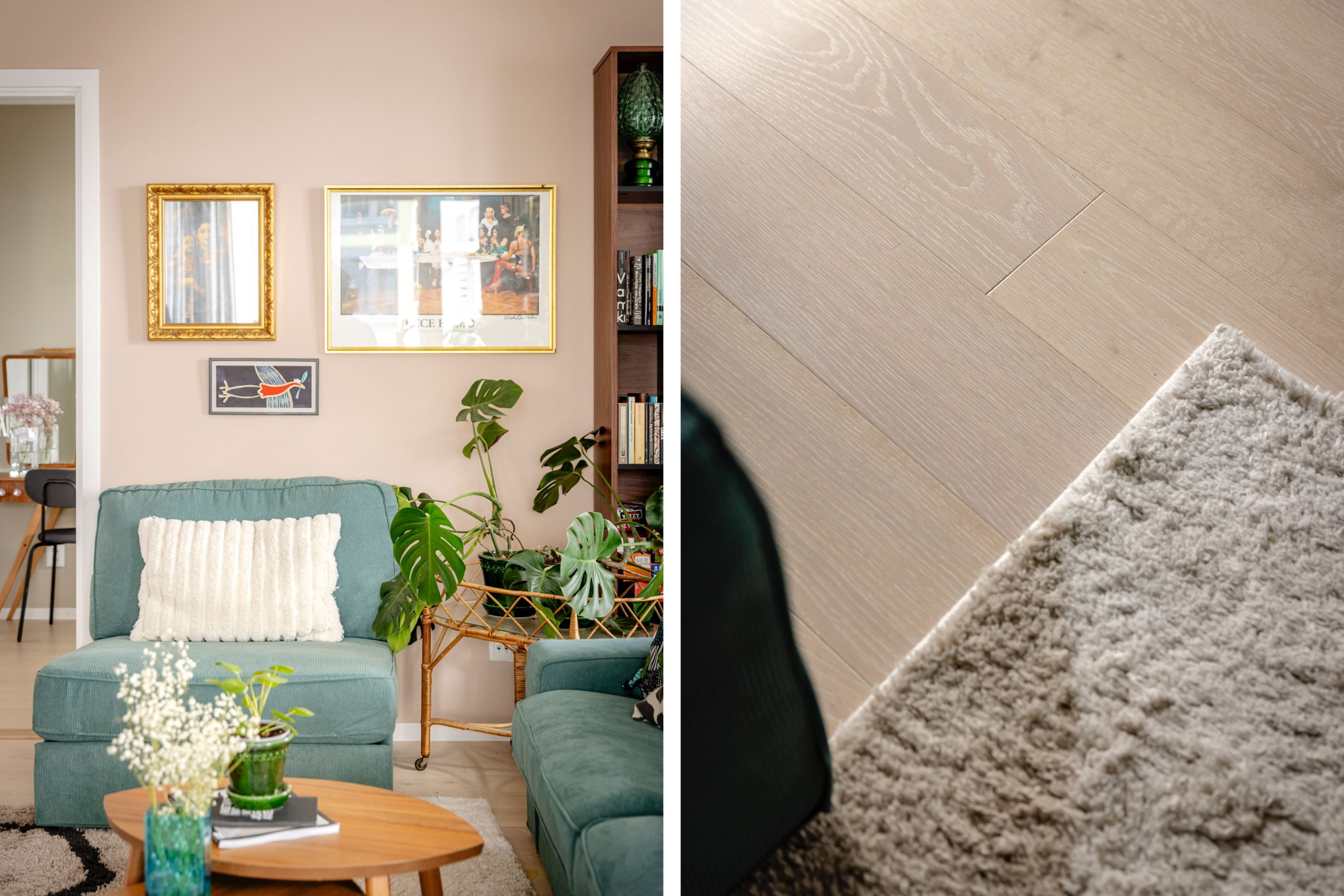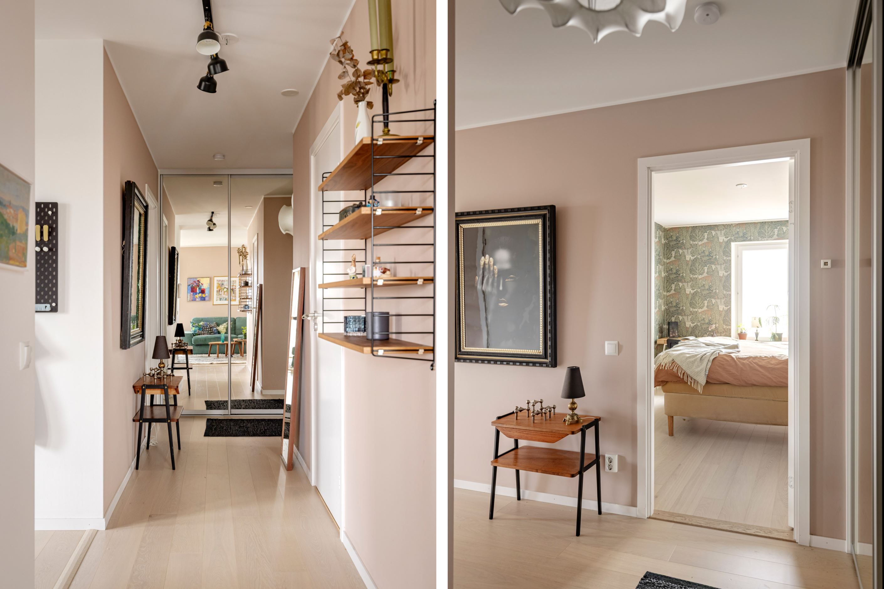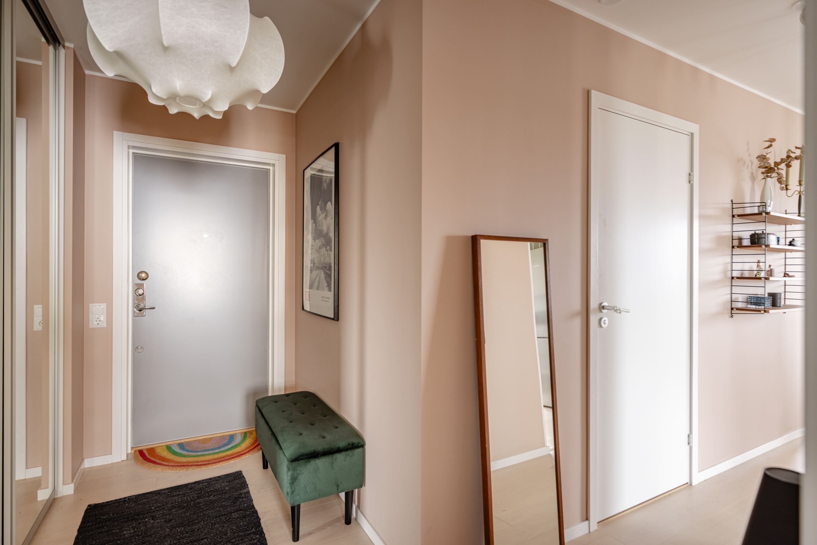 När du kliver in i bostaden välkomnas du av en rymlig hall med gott om förvaring i den stora garderoben med skjutdörrar i spegelglas. På golvet ligger ett fint, ljust parkettgolv som löper vidare genom hela lägenheten. Från den inre delen av hallen nås bostadens stora, helkaklade badrum.