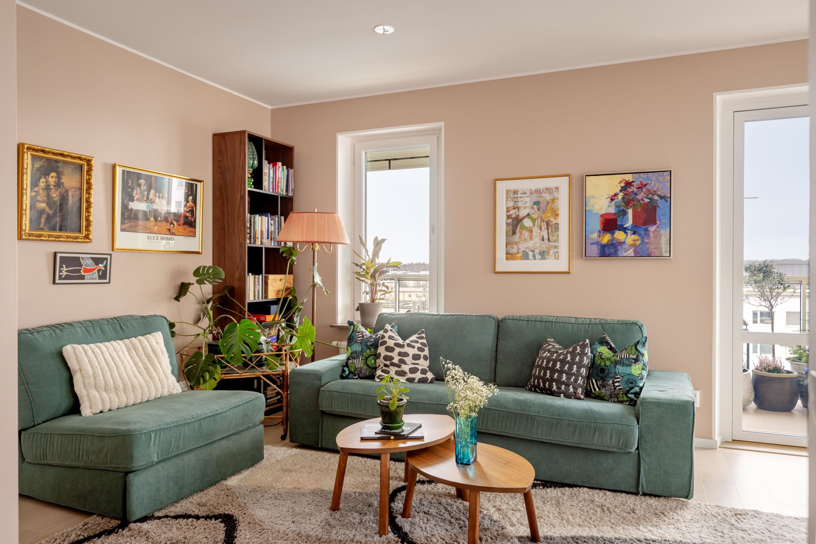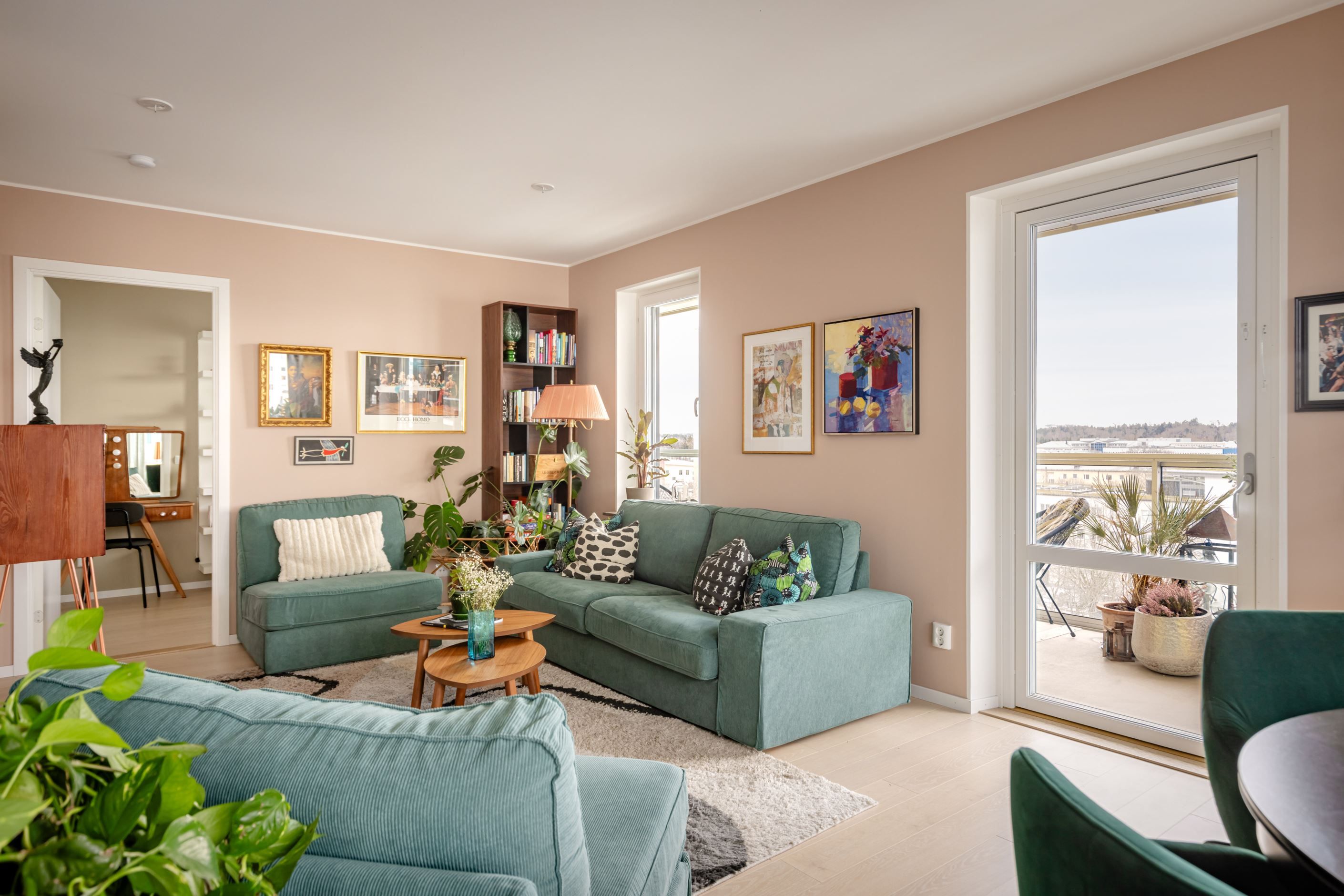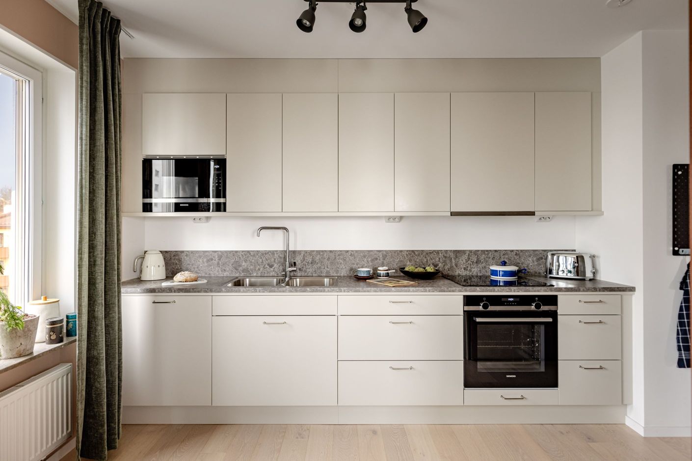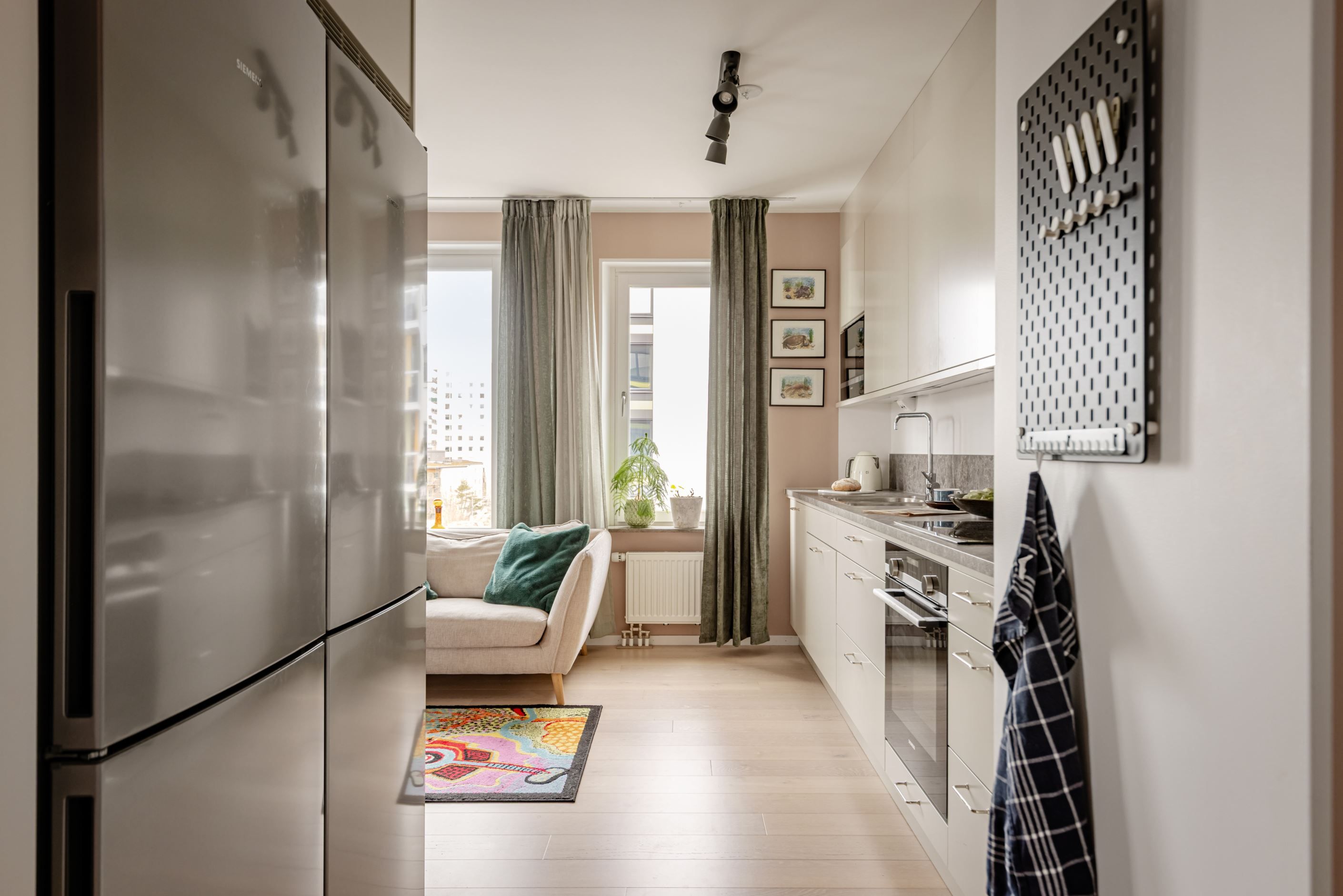 Köket är stilrent och modernt med gott om förvaring såväl som arbetsyta. Här finns självklart full maskinell utrustning med ugn, spis, fläkt, micro samt dubbel kyl och frys. Den öppna planlösningen mellan kök och vardagsrum ger en social och inbjudande miljö, perfekt för både vardagen och middagar med vänner och familj. Vardagsrummet erbjuder generösa ytor som rymmer både en större soffgrupp och matplats utan att tumma på den luftiga känslan. Tack vare fönster i två väderstreck flödar rikligt med naturligt ljus fritt genom rummet vilket skapar en ljus och härlig atmosfär. Härifrån nås även den stora balkongen som utan problem rymmer både loungemöbel och matgrupp, högt belägen i ett trevligt söderläge. För den som önskar finns även möjlighet att dela av vardagsrummet för ytterligare ett sovrum.