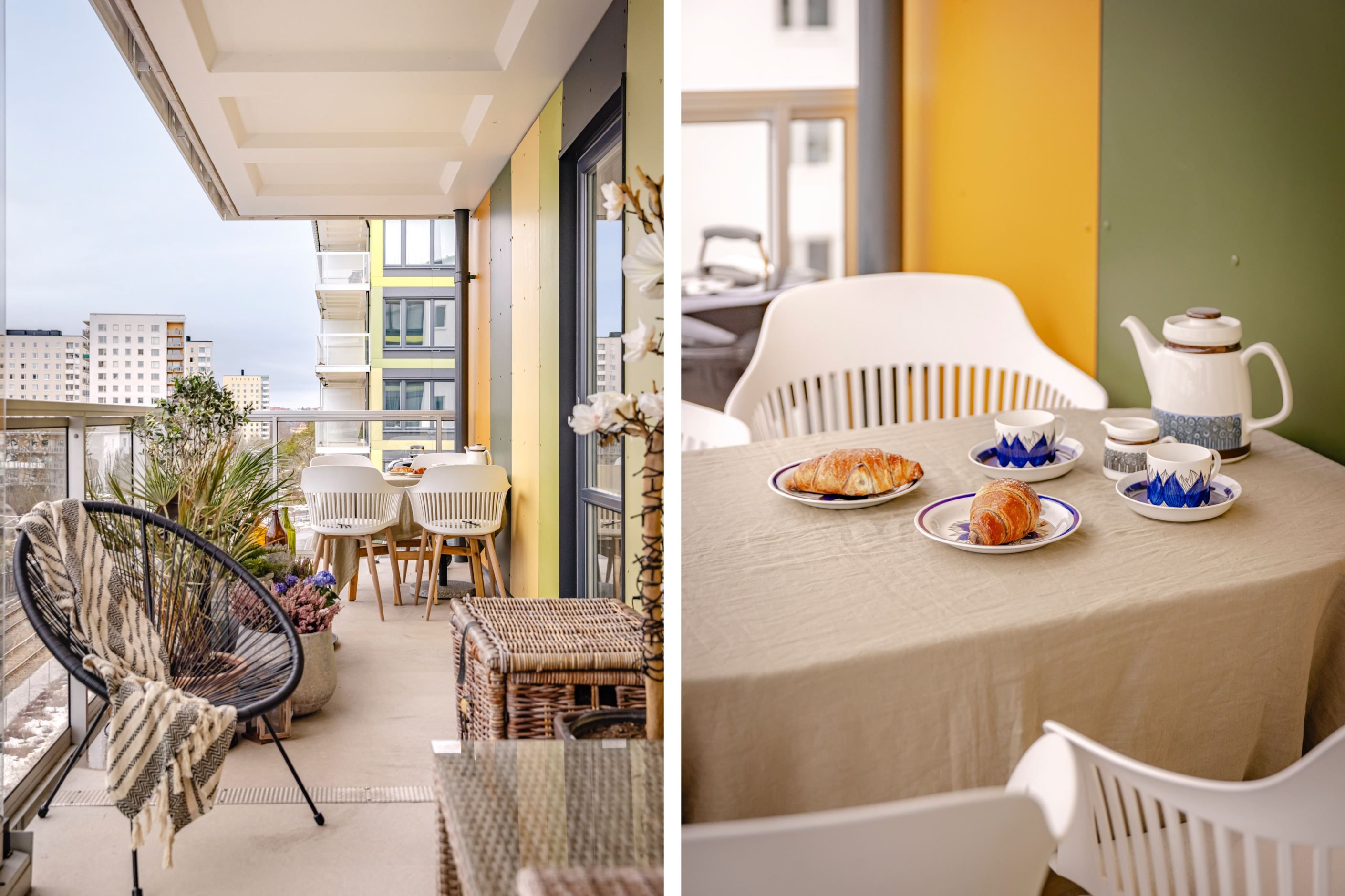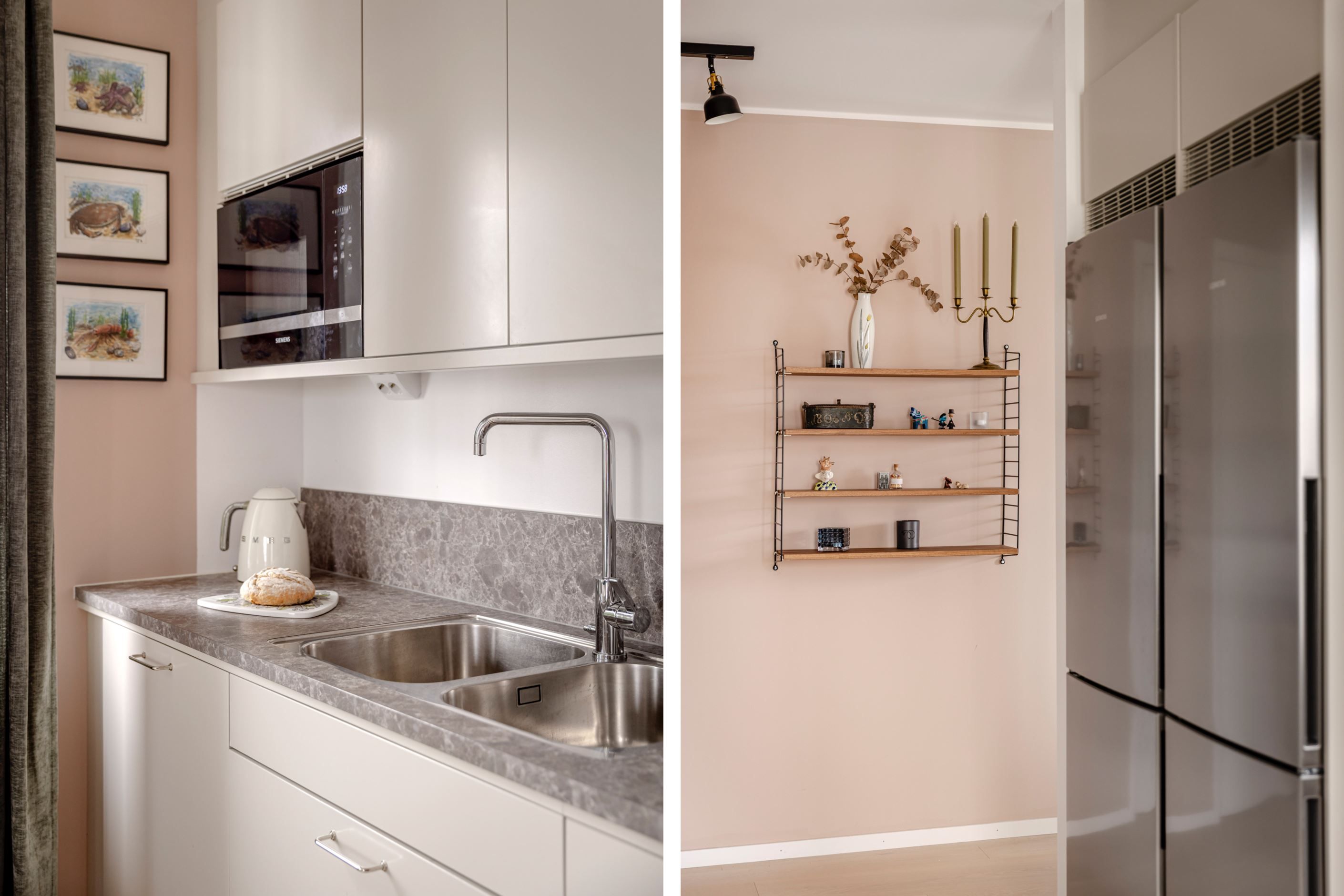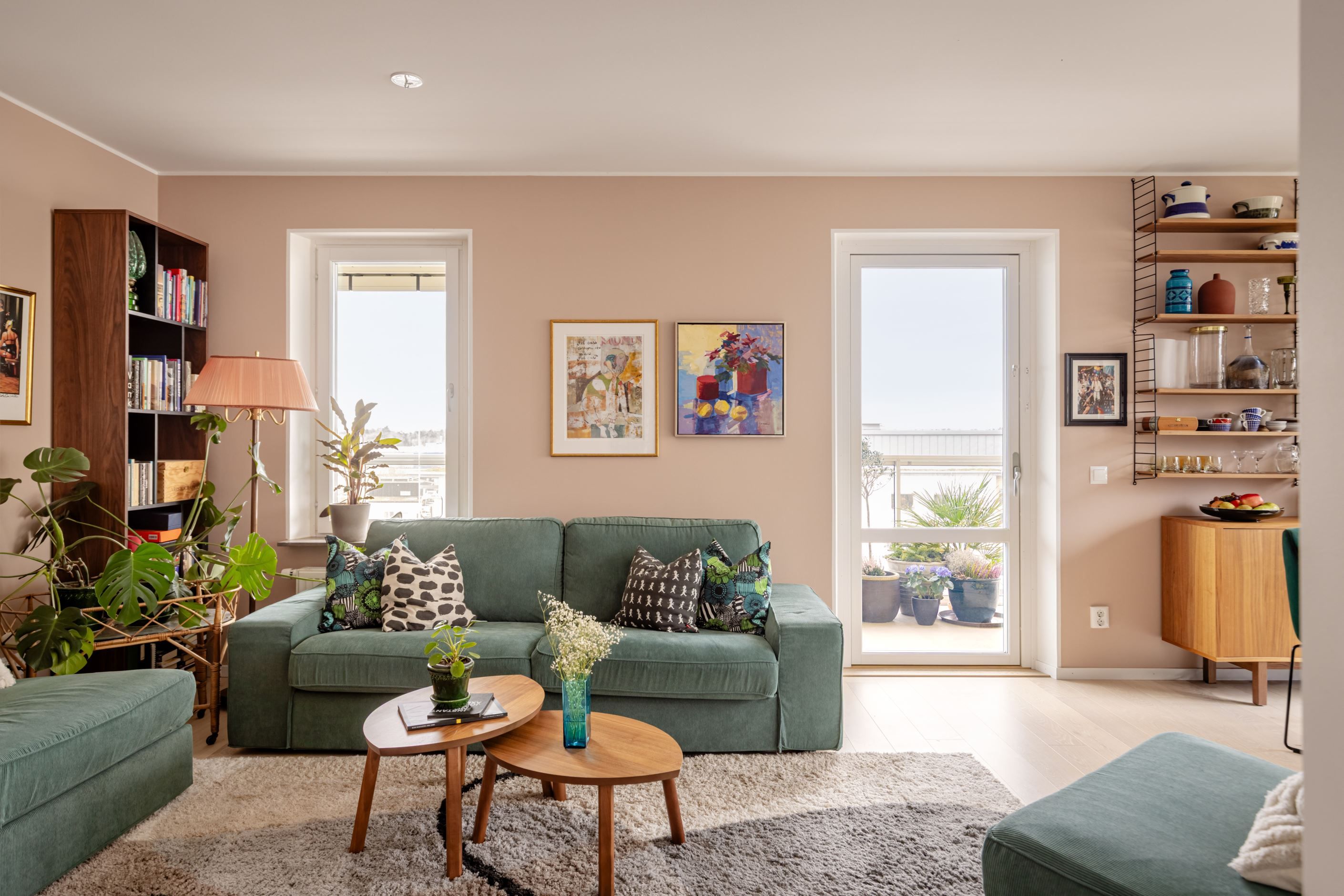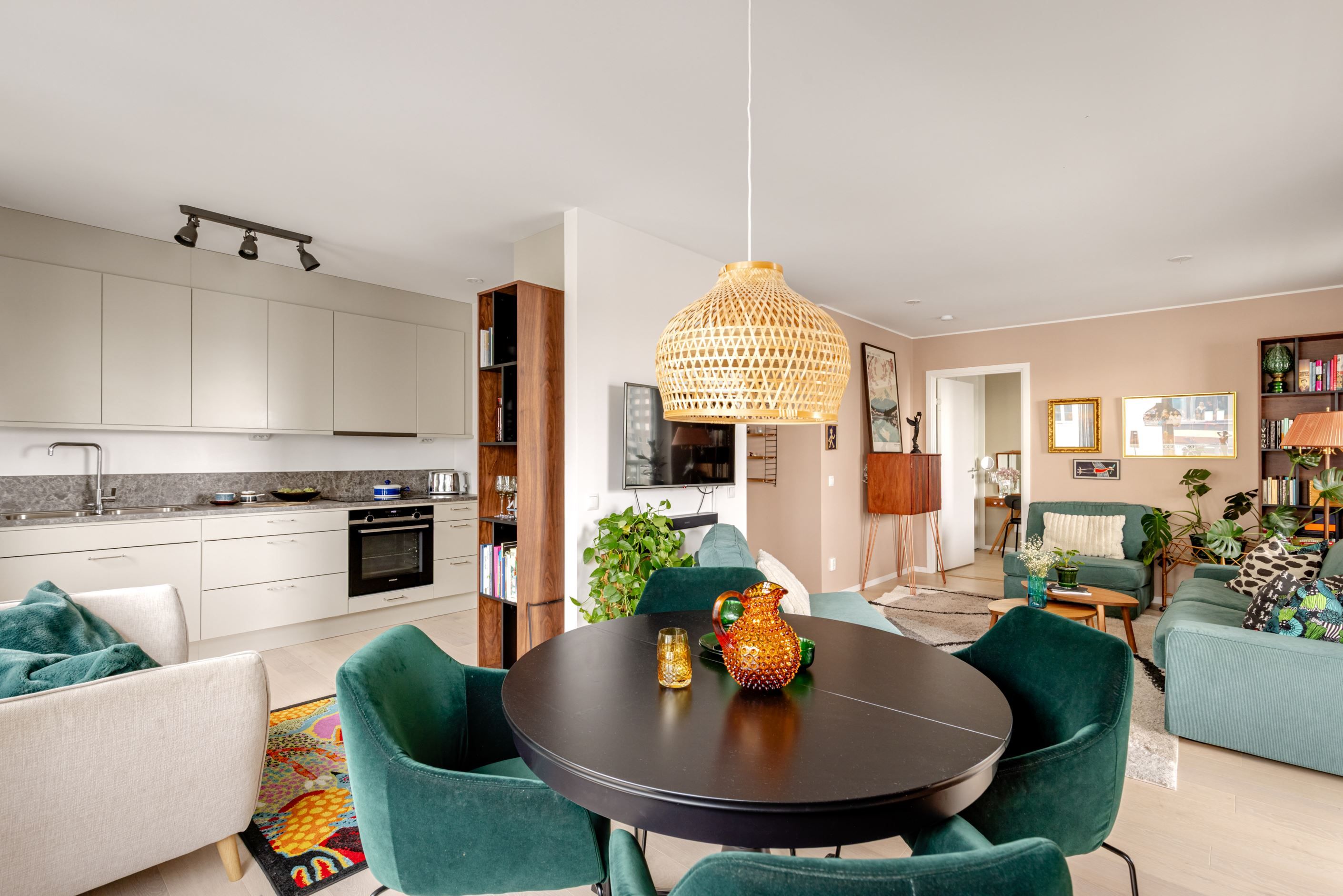 Köket är stilrent och modernt med gott om förvaring såväl som arbetsyta. Här finns självklart full maskinell utrustning med ugn, spis, fläkt, micro samt dubbel kyl och frys. Den öppna planlösningen mellan kök och vardagsrum ger en social och inbjudande miljö, perfekt för både vardagen och middagar med vänner och familj. Vardagsrummet erbjuder generösa ytor som rymmer både en större soffgrupp och matplats utan att tumma på den luftiga känslan. Tack vare fönster i två väderstreck flödar rikligt med naturligt ljus fritt genom rummet vilket skapar en ljus och härlig atmosfär. Härifrån nås även den stora balkongen som utan problem rymmer både loungemöbel och matgrupp, högt belägen i ett trevligt söderläge. För den som önskar finns även möjlighet att dela av vardagsrummet för ytterligare ett sovrum.