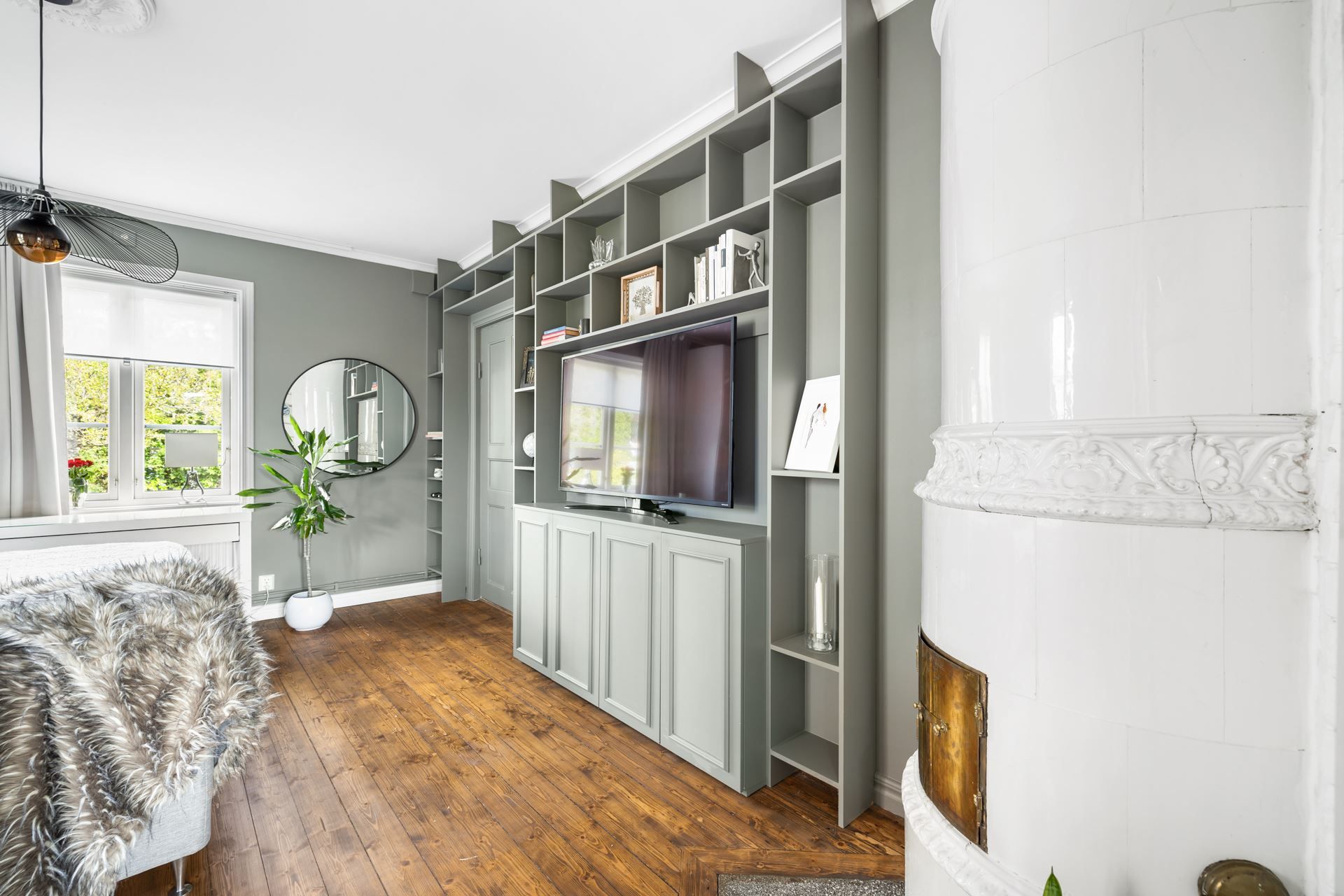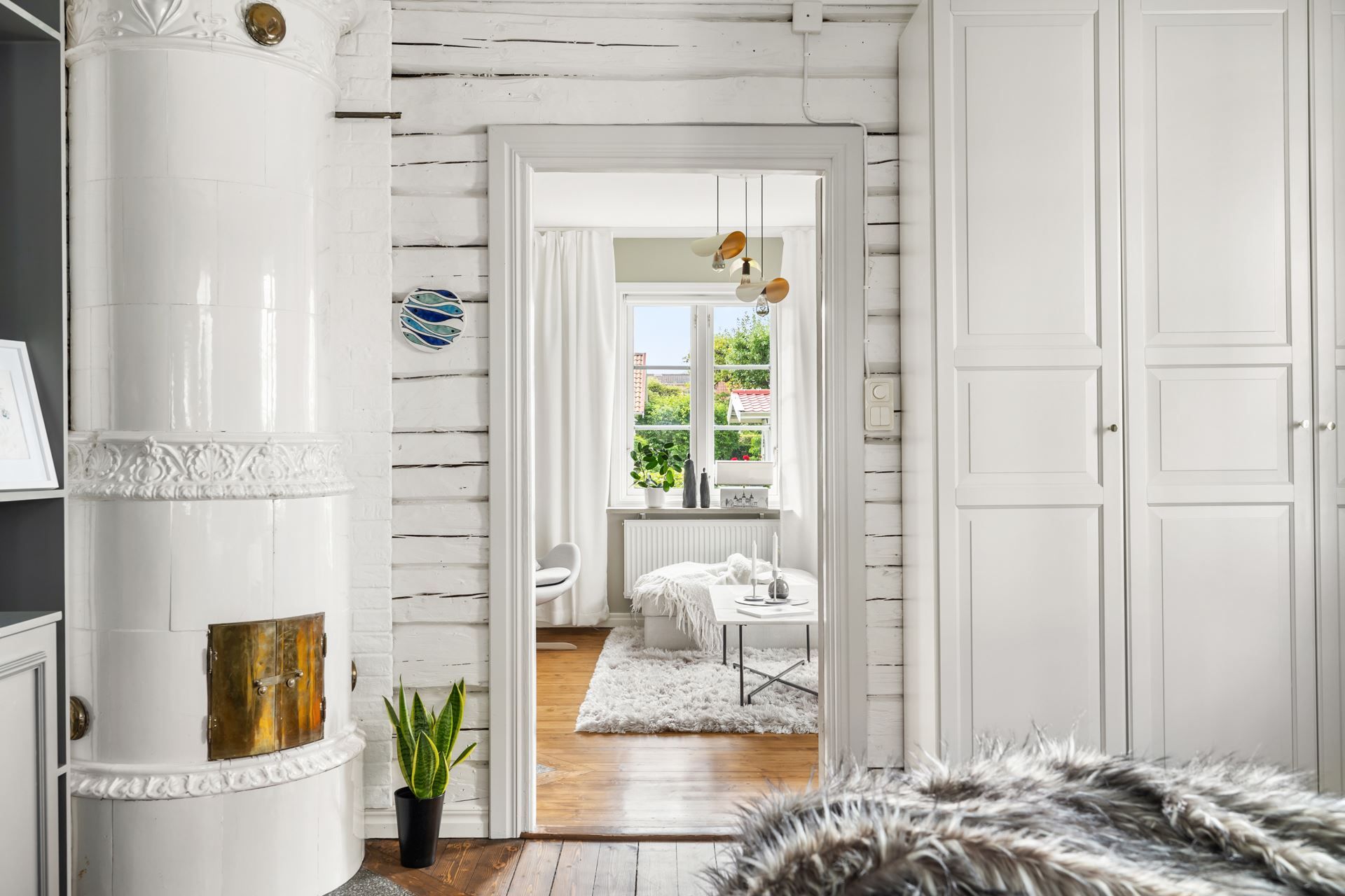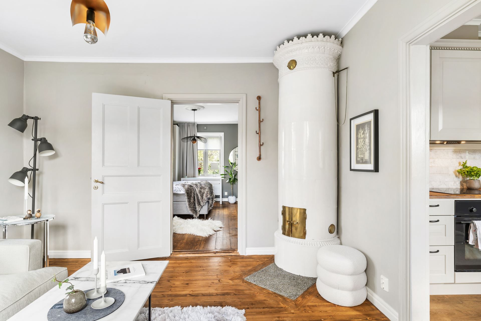 Interiört bjuds en välkomnande hall med bra förvaring, ett helkaklat badrum rakt fram i sobra toner och ett moderniserat kök i tidstypisk stil in till vänster. Vidare når du vardagsrum följt av sovrummet där två kakelugnar stoltserar och är vackra för ögat men som inte är i bruk i dagsläget. Genomgående och genomtänkt är bara förnamnet här. Du har nära ut från sovrummet till förmiddagssolen och att njuta av kaffe invid husväggen. På kvällen njuter du gärna av grill och uteplatser nära din veranda som blir lite som "din egen" och står dig fritt att nyttja tillsammans med övriga bostadsrättsinnehavare men naturligt känns den som din egen och säljaren har använt den som så under innehavstiden.