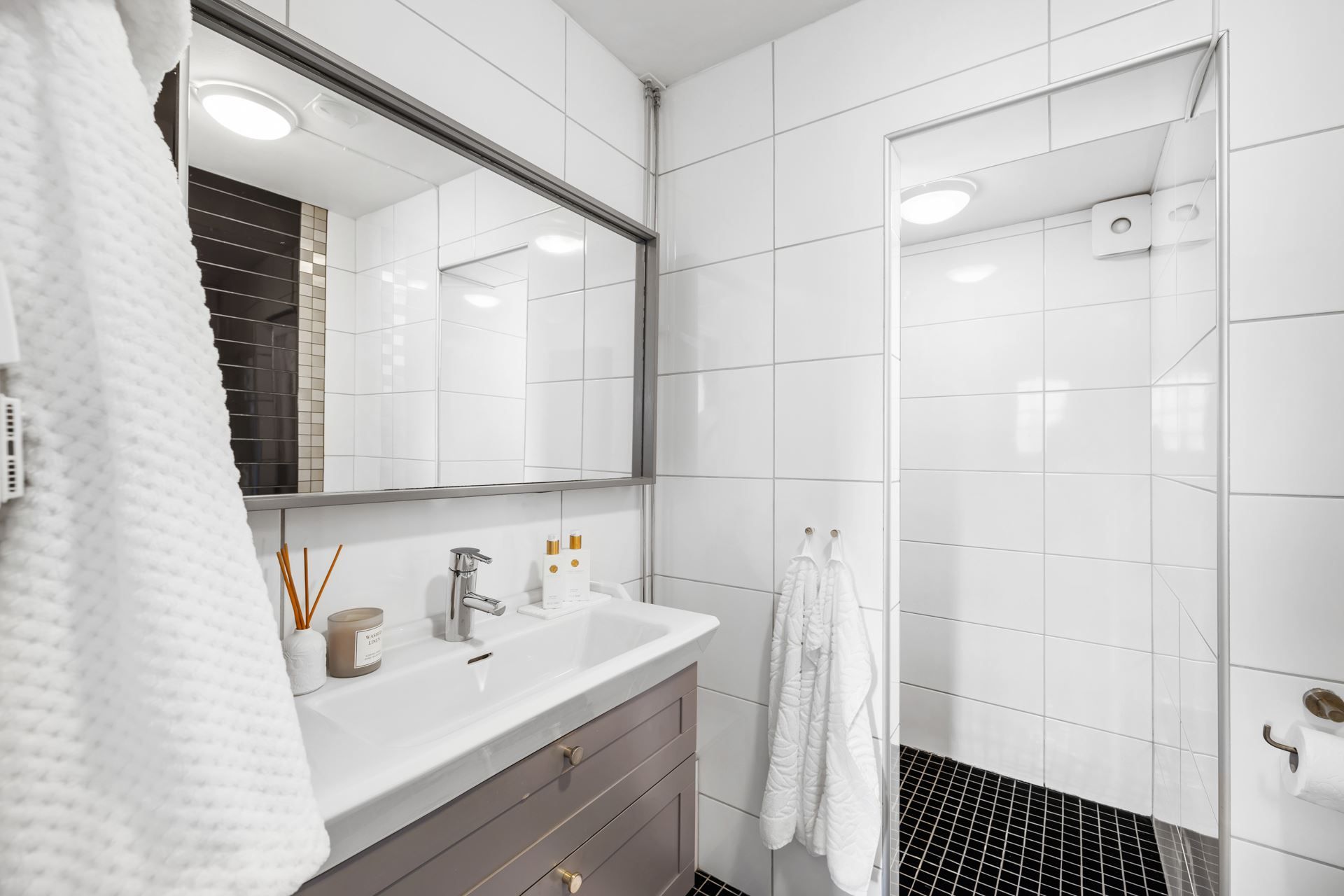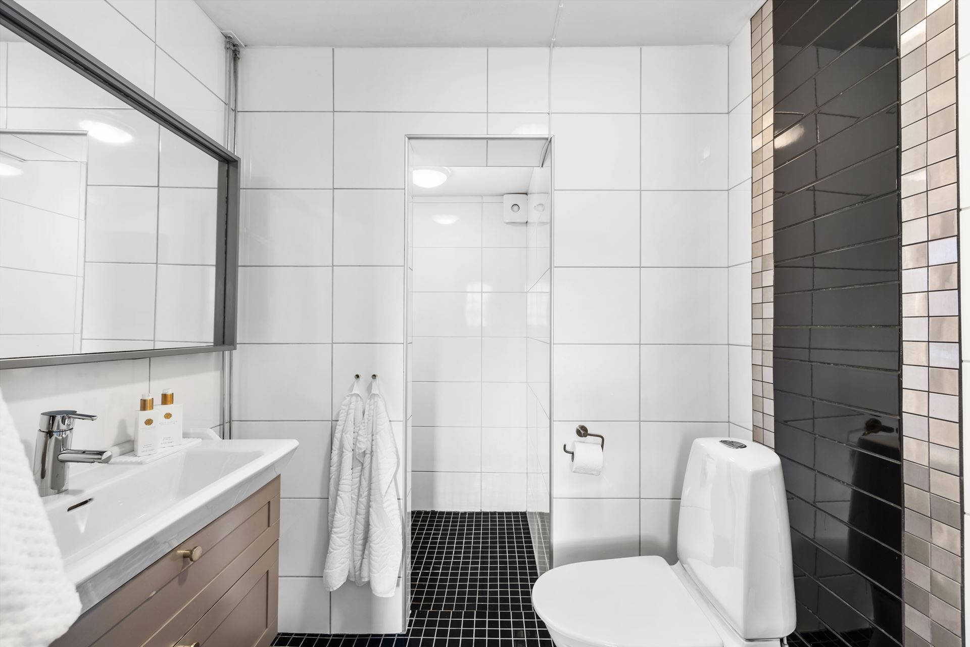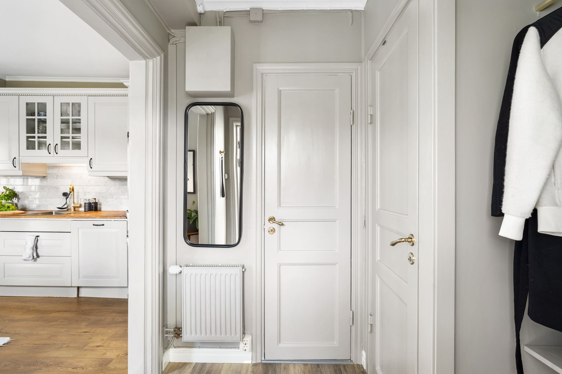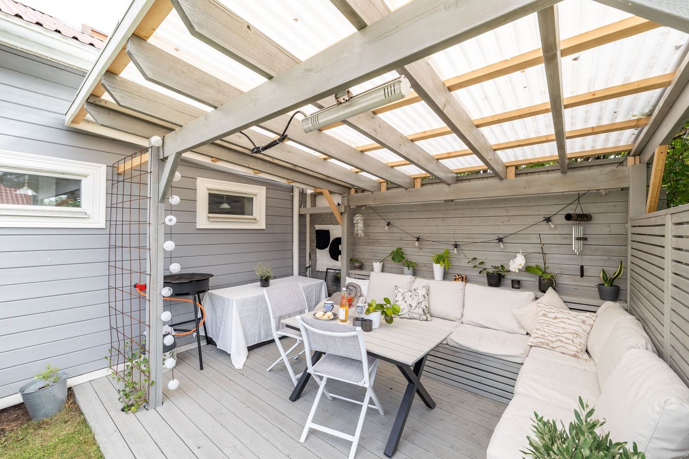 Interiört bjuds en välkomnande hall med bra förvaring, ett helkaklat badrum rakt fram i sobra toner och ett moderniserat kök i tidstypisk stil in till vänster. Vidare når du vardagsrum följt av sovrummet där två kakelugnar stoltserar och är vackra för ögat men som inte är i bruk i dagsläget. Genomgående och genomtänkt är bara förnamnet här. Du har nära ut från sovrummet till förmiddagssolen och att njuta av kaffe invid husväggen. På kvällen njuter du gärna av grill och uteplatser nära din veranda som blir lite som "din egen" och står dig fritt att nyttja tillsammans med övriga bostadsrättsinnehavare men naturligt känns den som din egen och säljaren har använt den som så under innehavstiden.