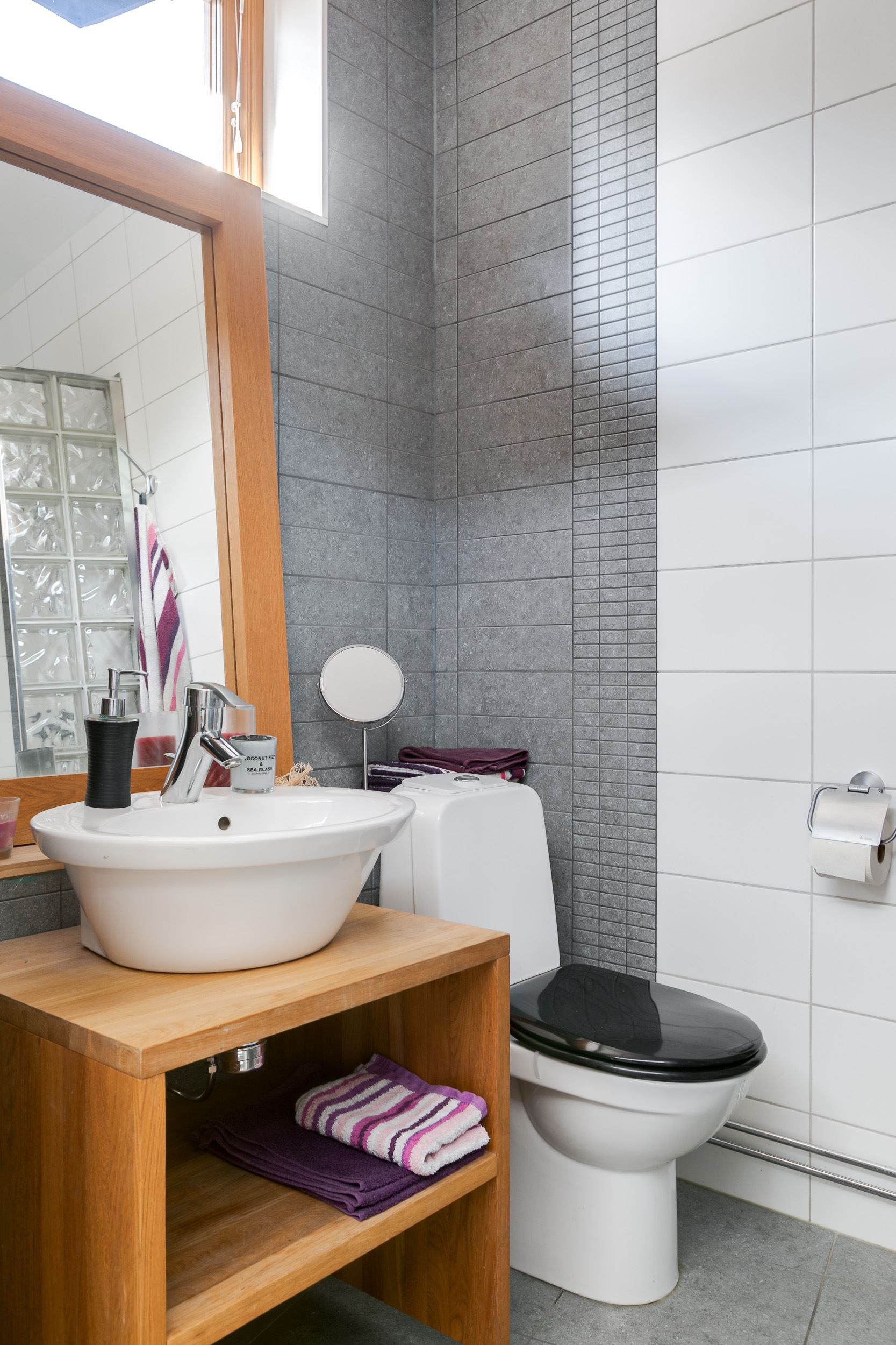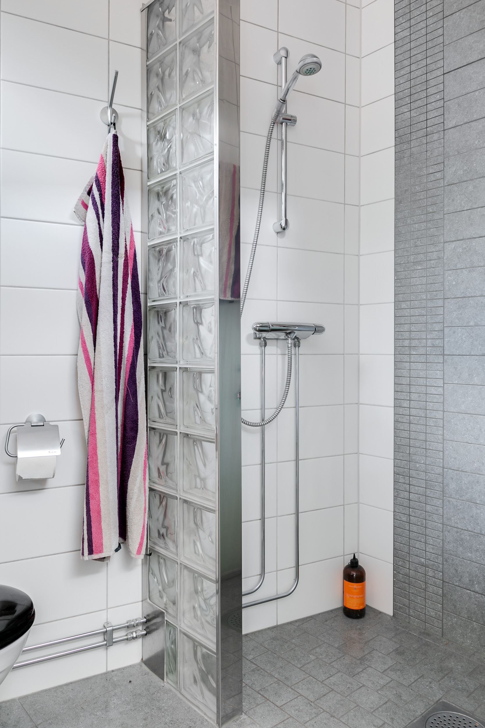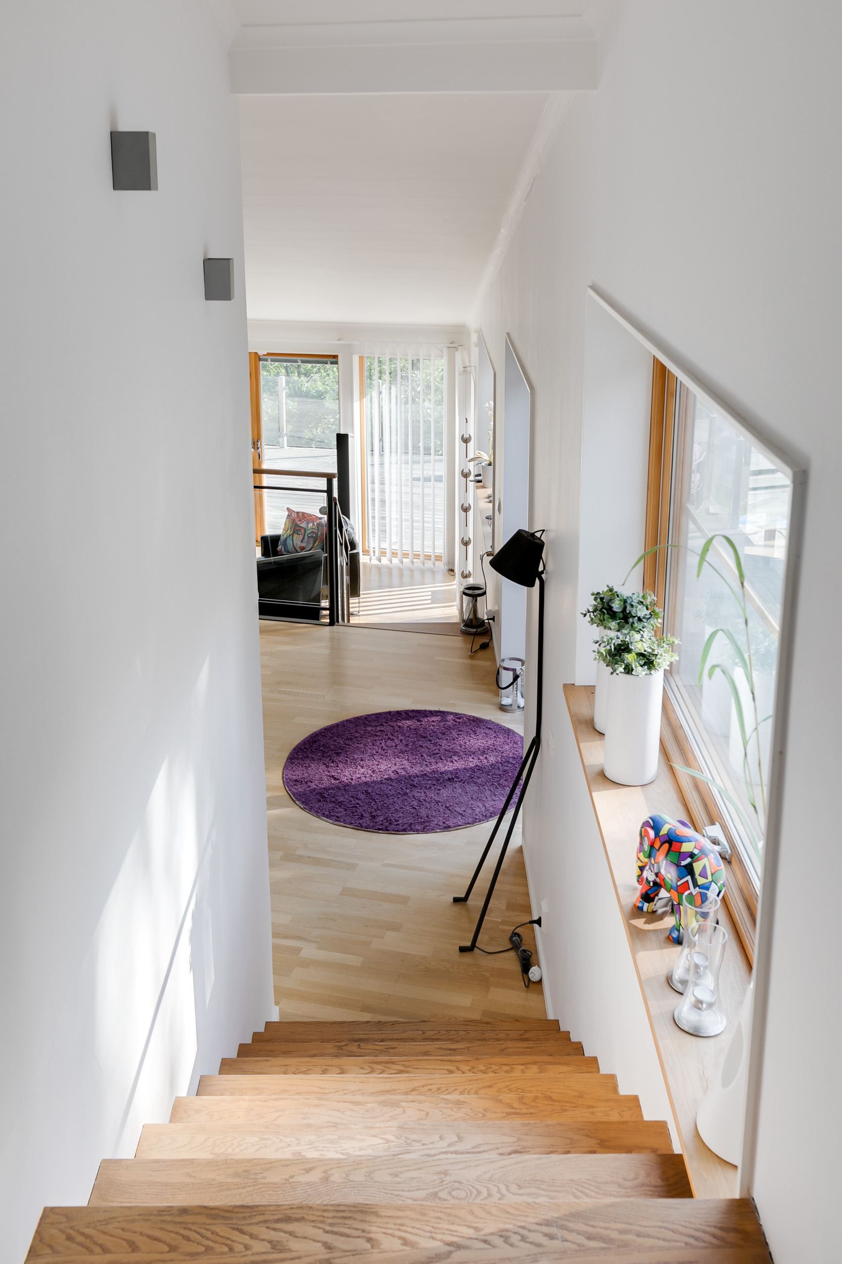 På de övre etaget finner du entré, hall med stor platsbyggd Elfa garderobssystem med tonat/frostade glasdörrar. Tvättstuga/Gym med klinkers golv samt utgång till carport, sovrum/gästrum och master bedroom med en vidsträckt utsikt och utgång till den vedeldade tunnan. På mellanplanet hittar ni kök/matplats, köksö med gasspis och glasdörrar ut till en av altanerna, Badrum och ett sovrum med platsbyggd 140 cm loftsäng samt förråd.