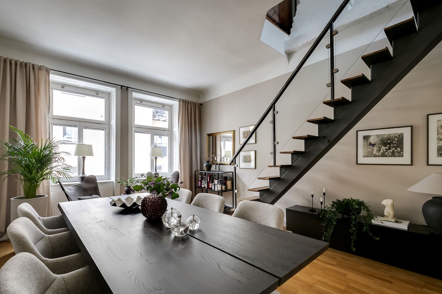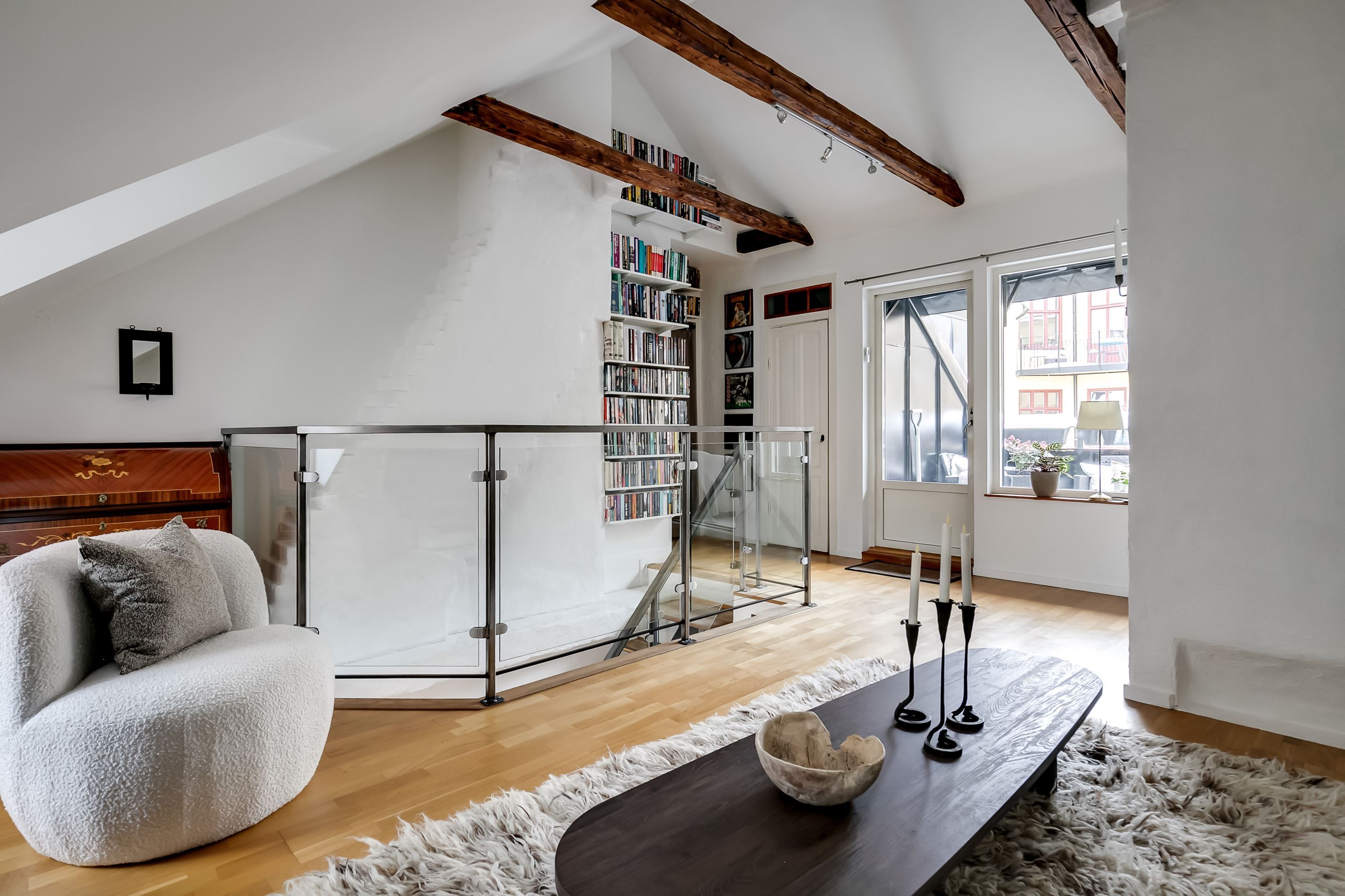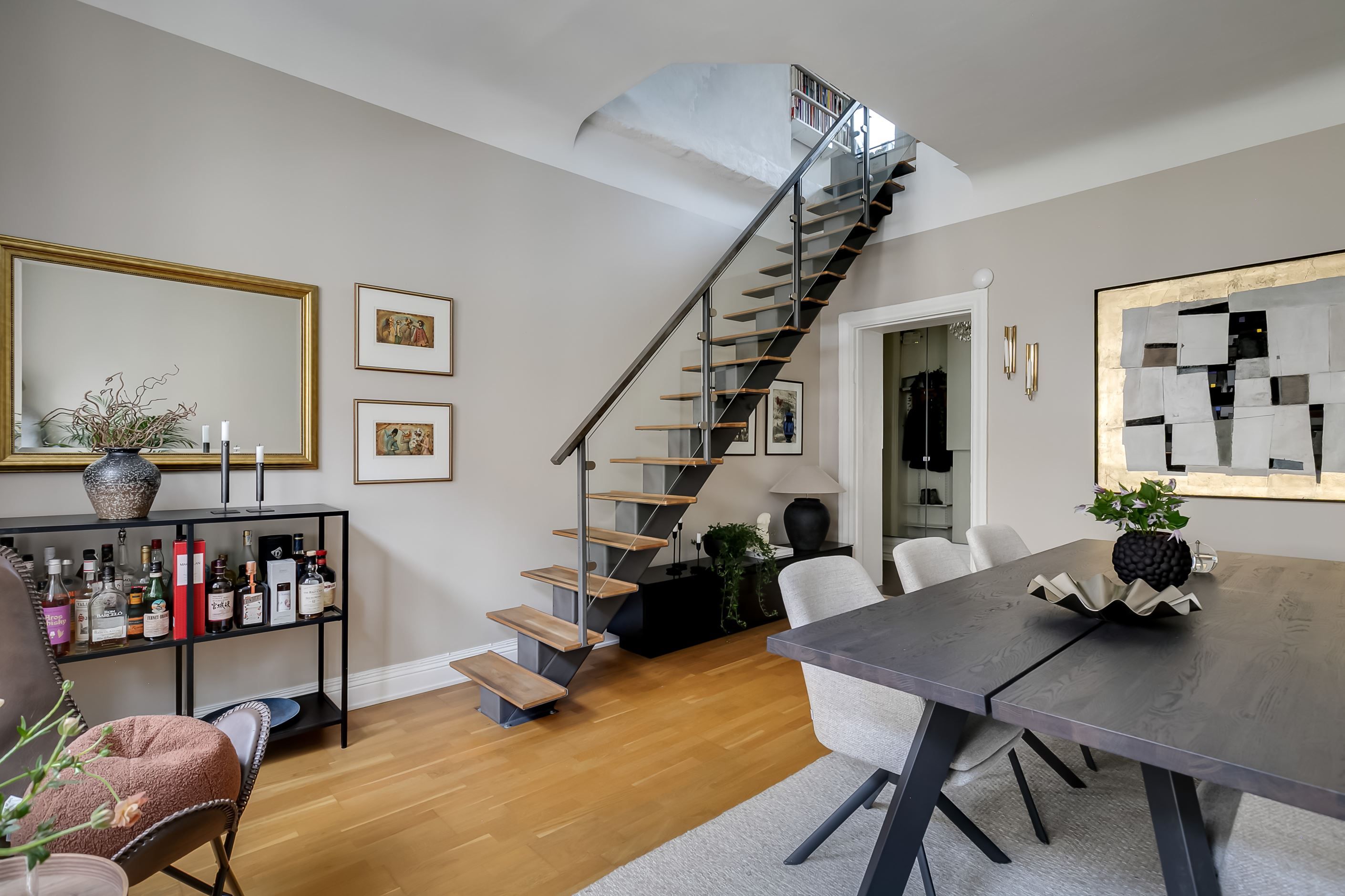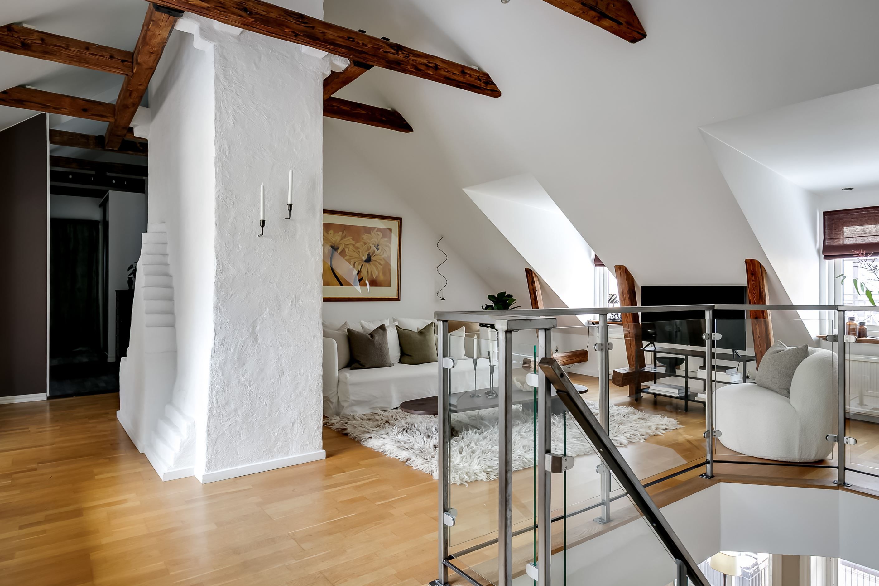 Våningen erbjuder två välplanerade och genomtänka våningsplan där entréplanet har välbevarad sekelskiftscharm med ett stort kök, badrum och sällskapsrum. Det övre planet nås via en stilren trappa och här är vindskaraktären tydlig med synliga takbjälkar och vitslammade murar. Den generösa takhöjden med cirka 3,8 m upp i nock tillsammans med ett härligt ljusinsläpp från takfönstren skapar rymd . Detta plan inrymmer terrass, sällskapsdel, två sovrum samt gäst-wc.