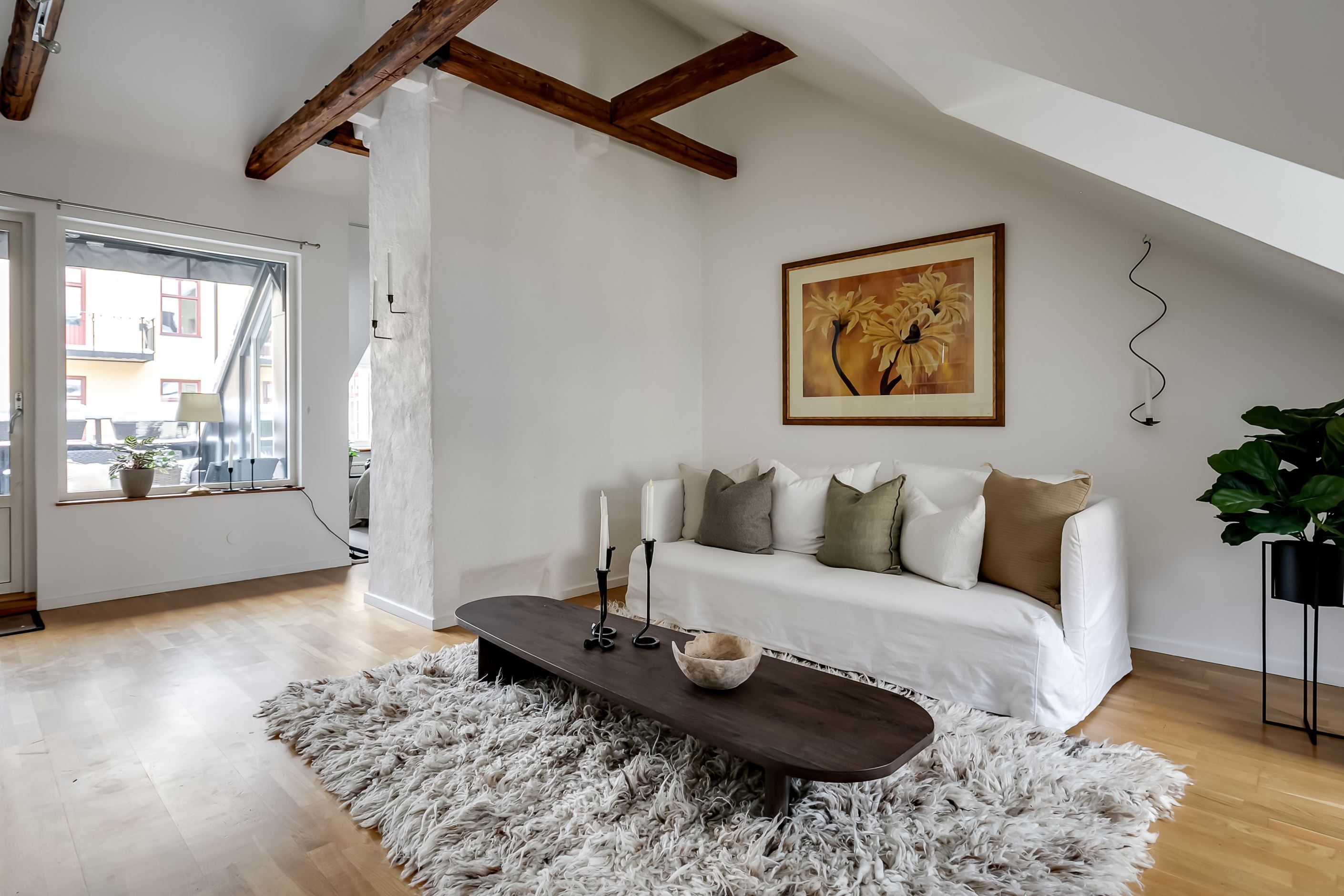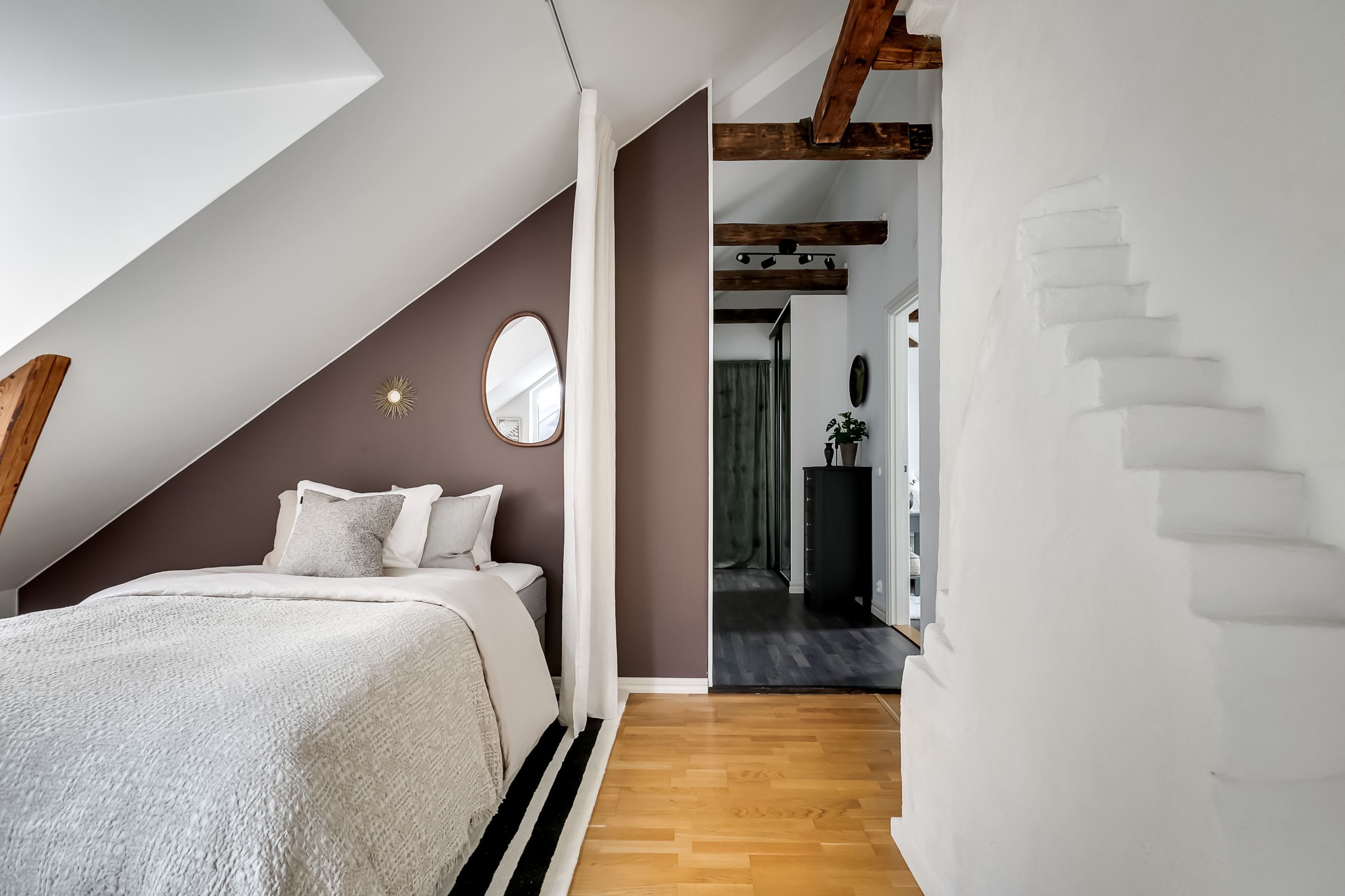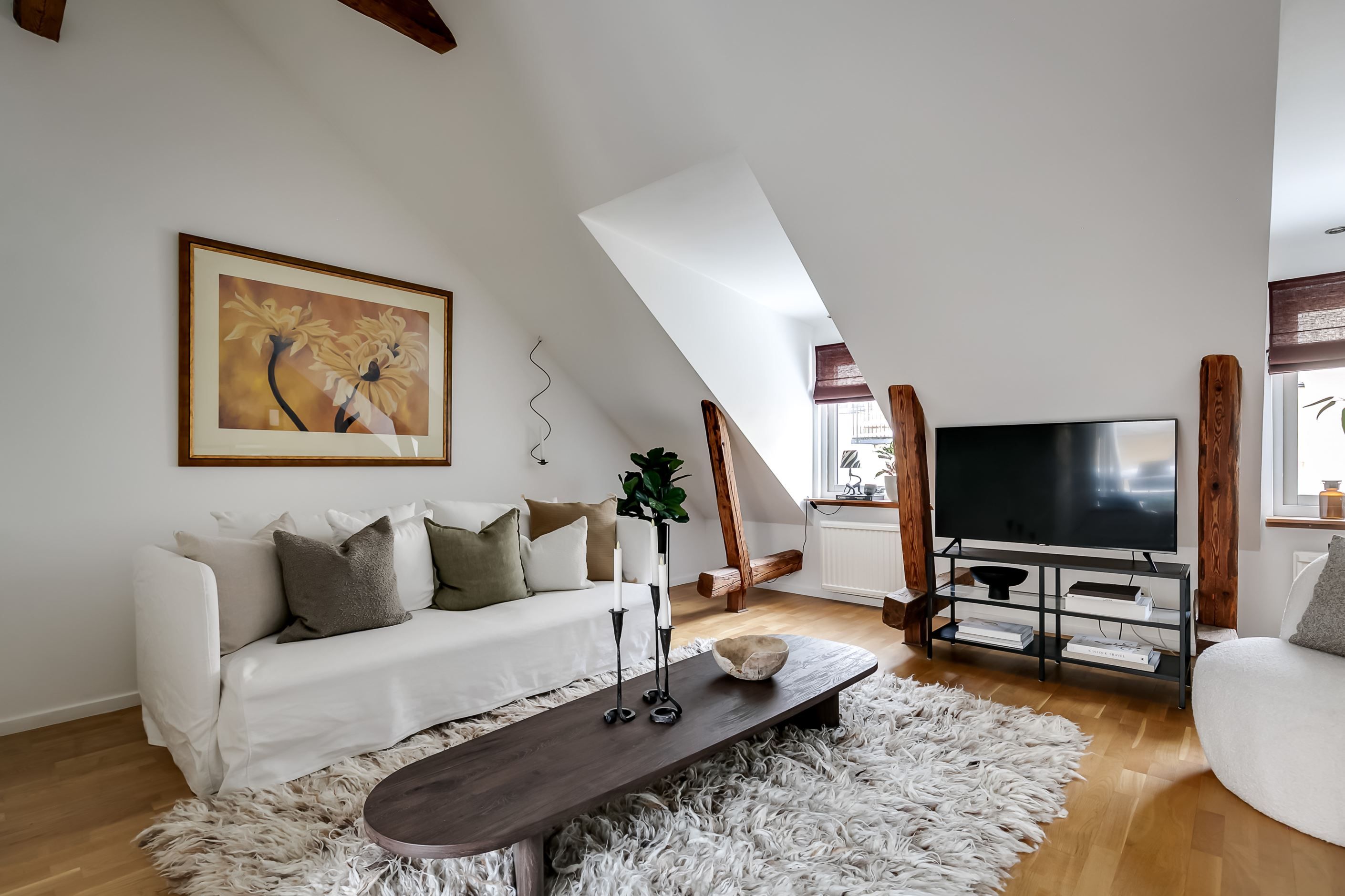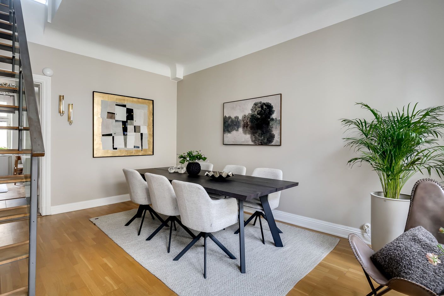 Våningen erbjuder två välplanerade och genomtänka våningsplan där entréplanet har välbevarad sekelskiftscharm med ett stort kök, badrum och sällskapsrum. Det övre planet nås via en stilren trappa och här är vindskaraktären tydlig med synliga takbjälkar och vitslammade murar. Den generösa takhöjden med cirka 3,8 m upp i nock tillsammans med ett härligt ljusinsläpp från takfönstren skapar rymd . Detta plan inrymmer terrass, sällskapsdel, två sovrum samt gäst-wc.