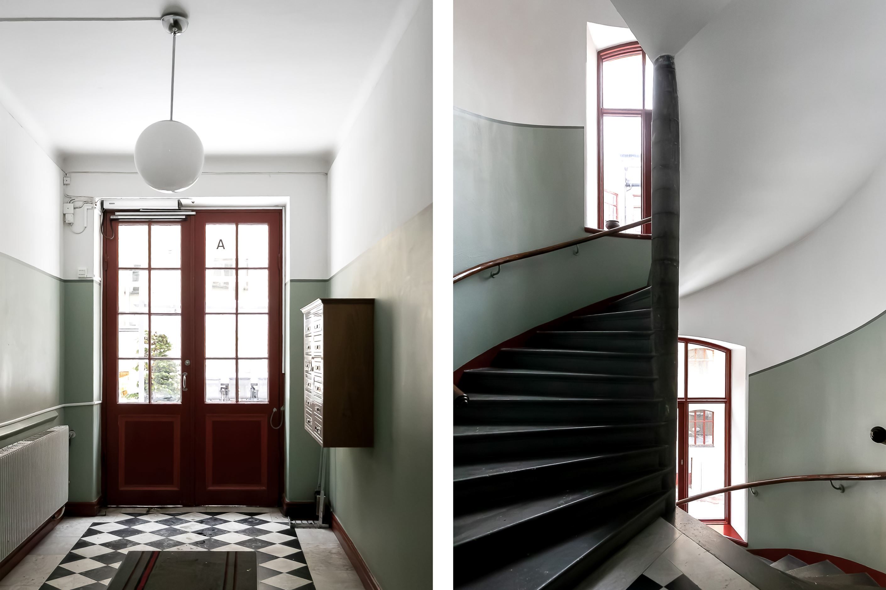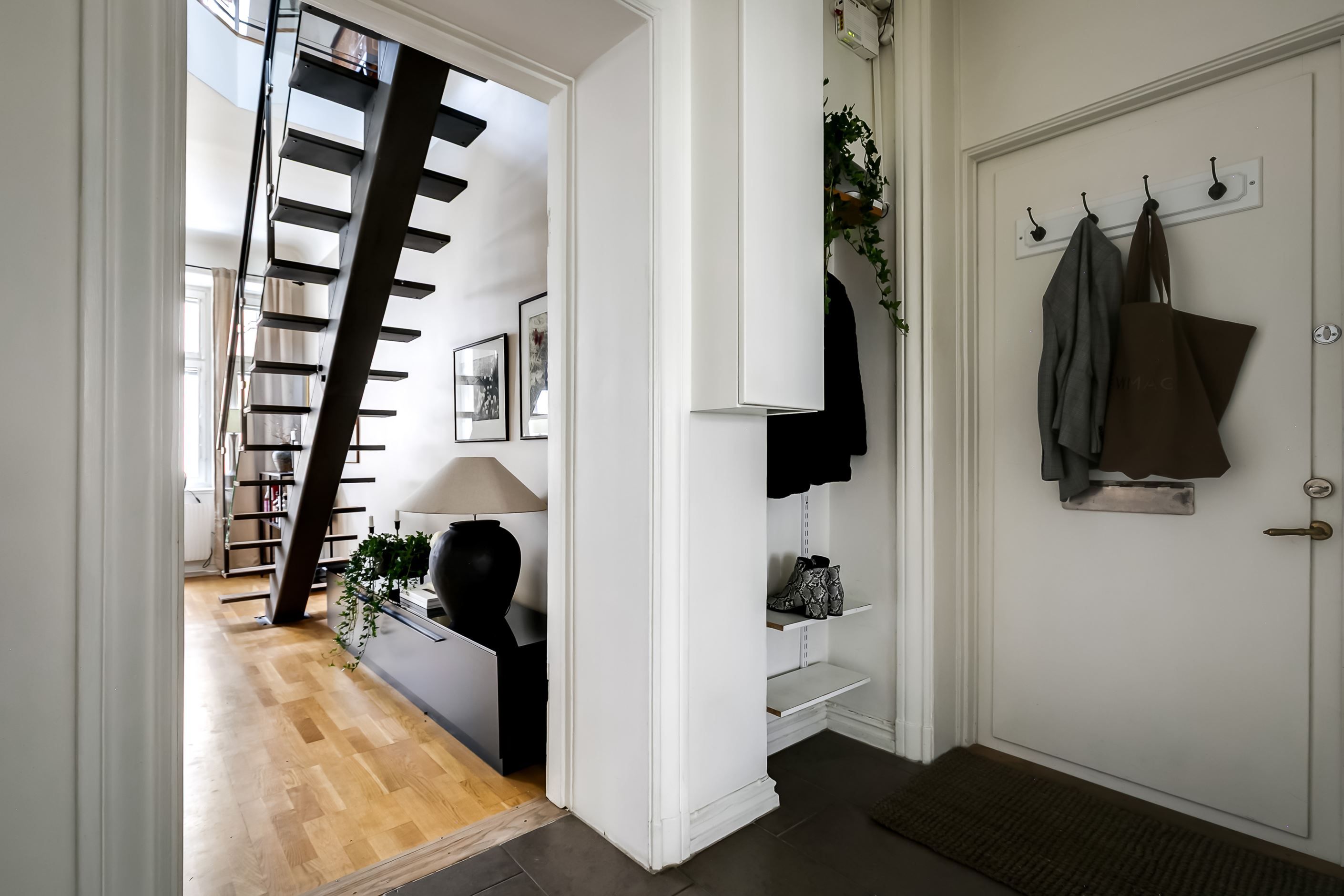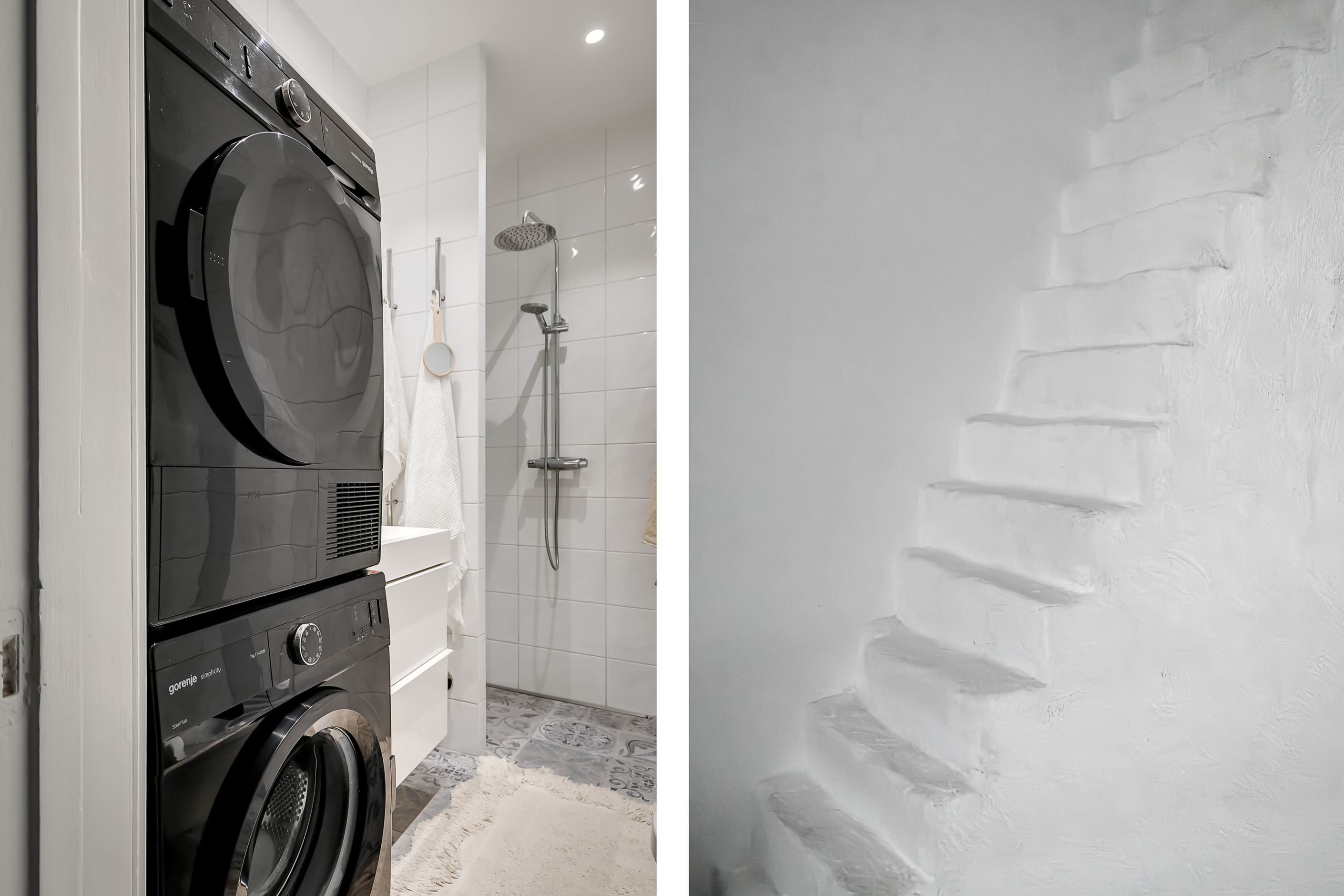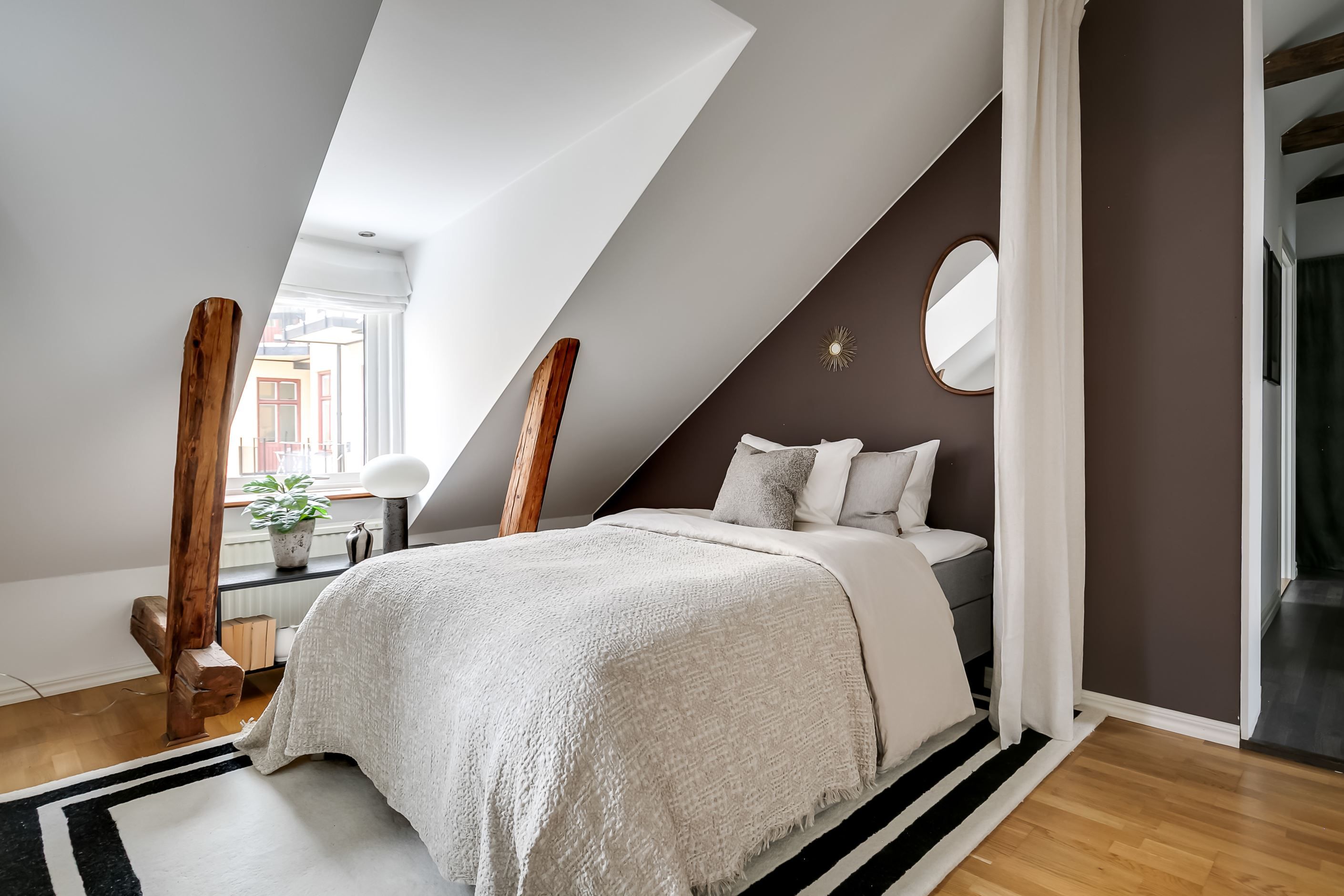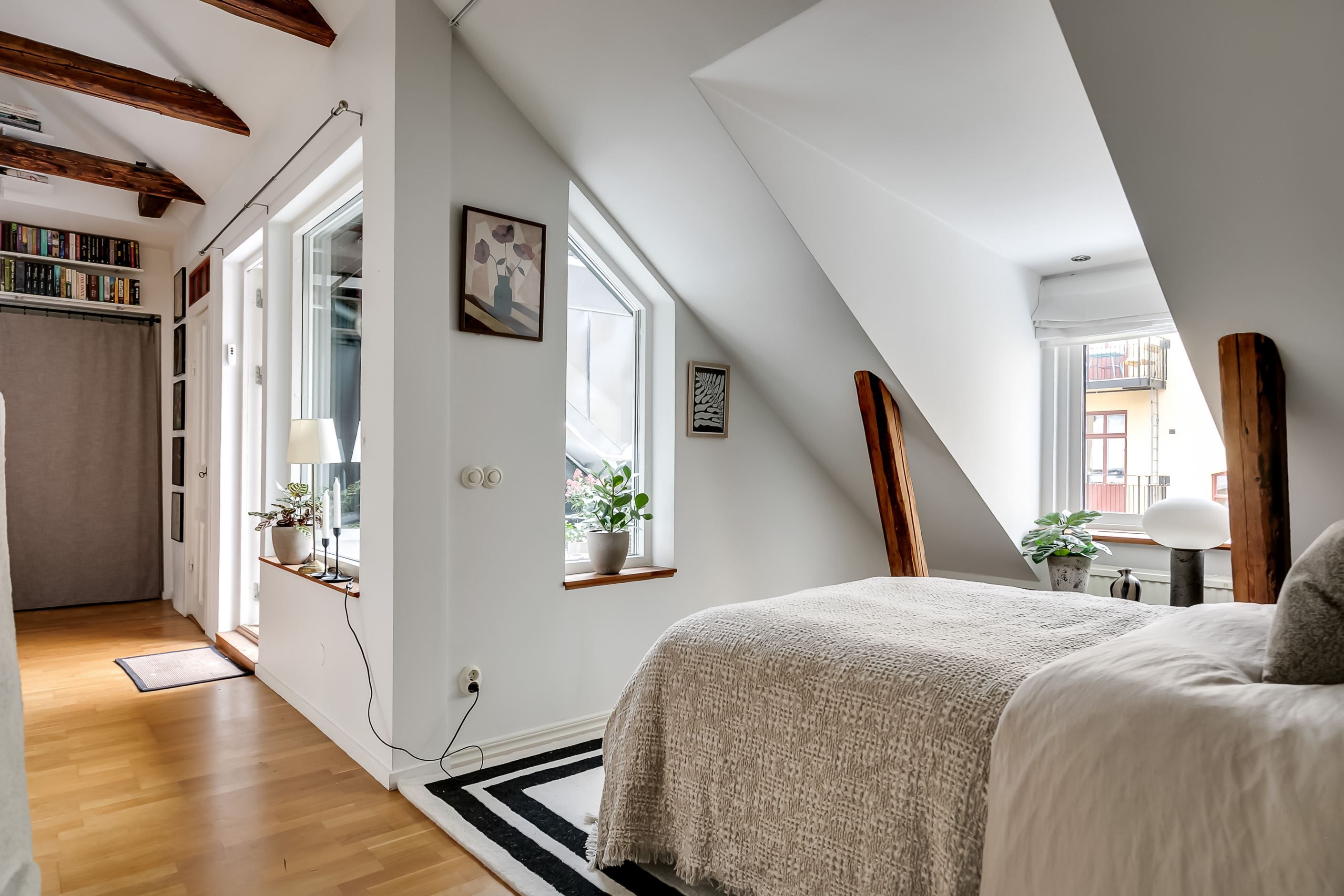 Våningen erbjuder två välplanerade och genomtänka våningsplan där entréplanet har välbevarad sekelskiftscharm med ett stort kök, badrum och sällskapsrum. Det övre planet nås via en stilren trappa och här är vindskaraktären tydlig med synliga takbjälkar och vitslammade murar. Den generösa takhöjden med cirka 3,8 m upp i nock tillsammans med ett härligt ljusinsläpp från takfönstren skapar rymd . Detta plan inrymmer terrass, sällskapsdel, två sovrum samt gäst-wc.