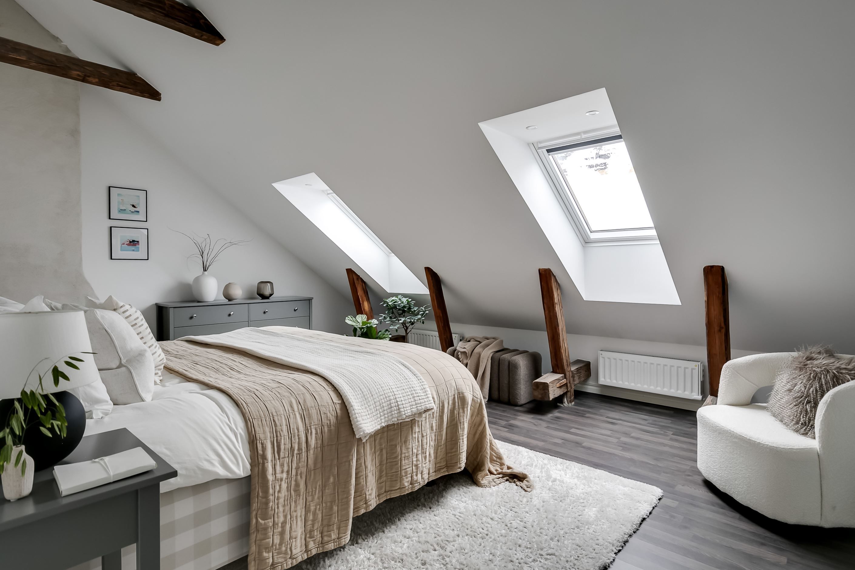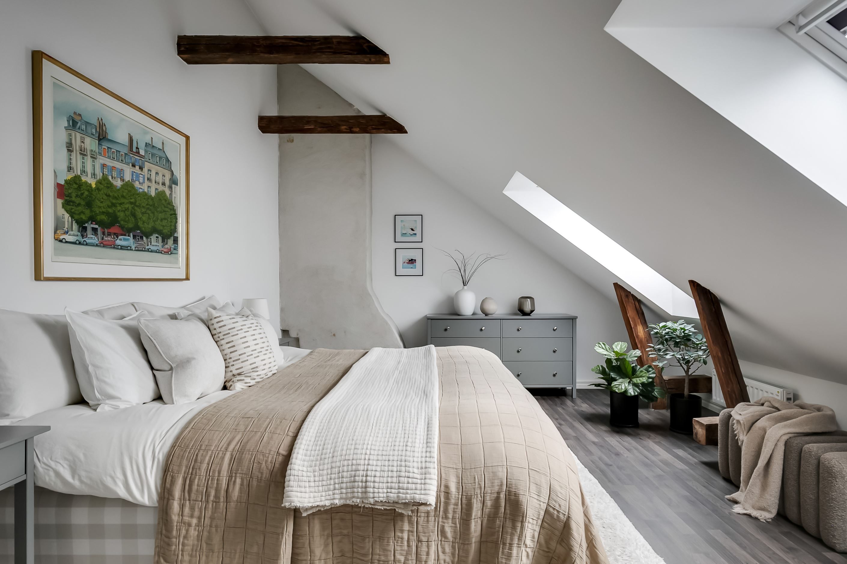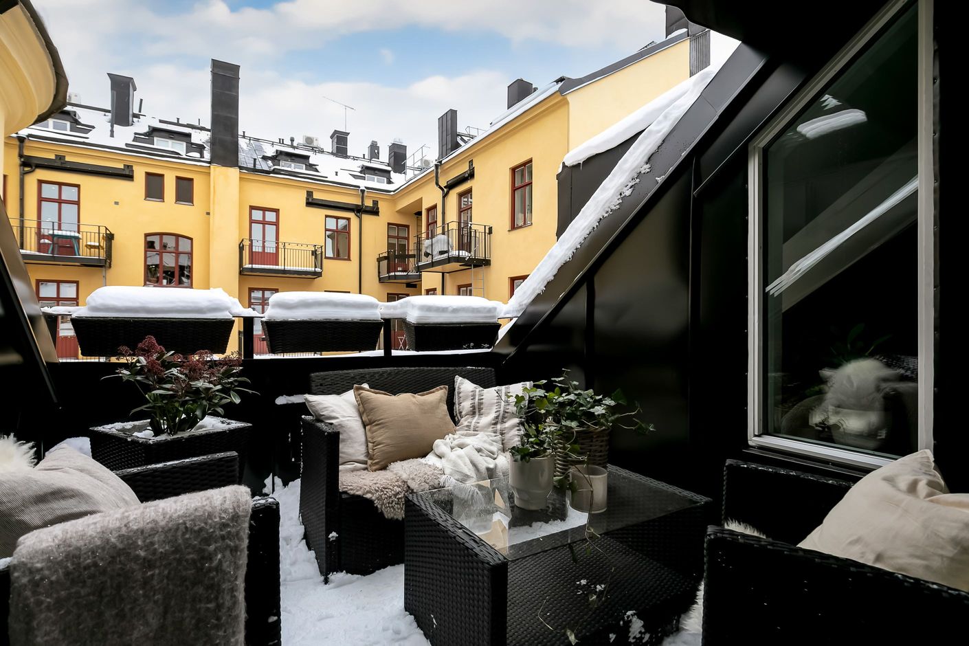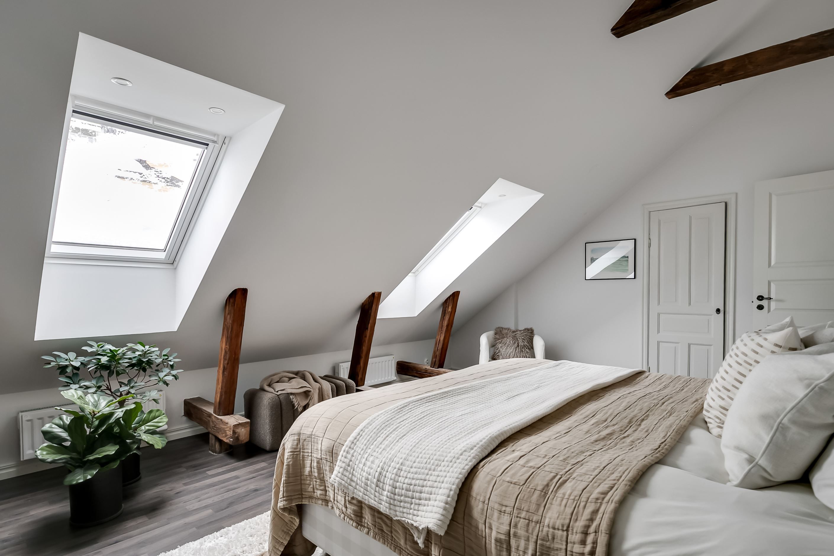 Våningen erbjuder två välplanerade och genomtänka våningsplan där entréplanet har välbevarad sekelskiftscharm med ett stort kök, badrum och sällskapsrum. Det övre planet nås via en stilren trappa och här är vindskaraktären tydlig med synliga takbjälkar och vitslammade murar. Den generösa takhöjden med cirka 3,8 m upp i nock tillsammans med ett härligt ljusinsläpp från takfönstren skapar rymd . Detta plan inrymmer terrass, sällskapsdel, två sovrum samt gäst-wc.