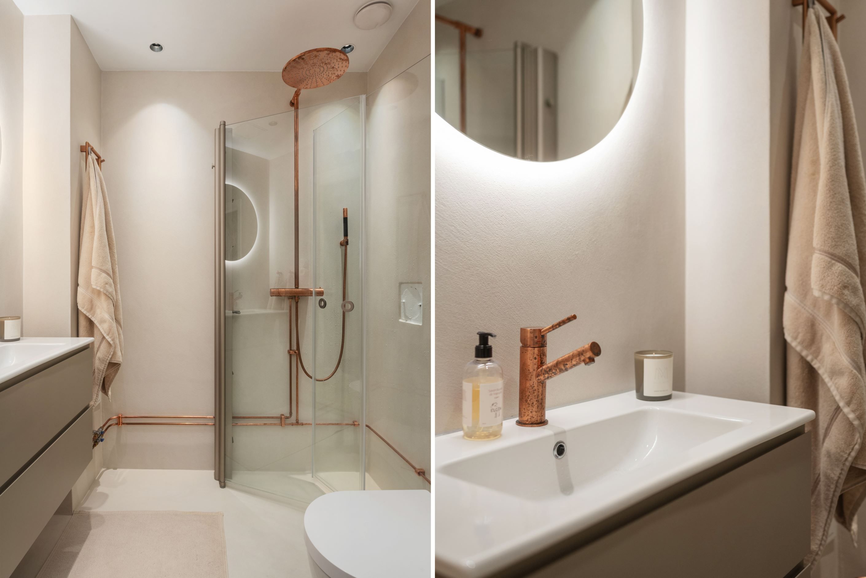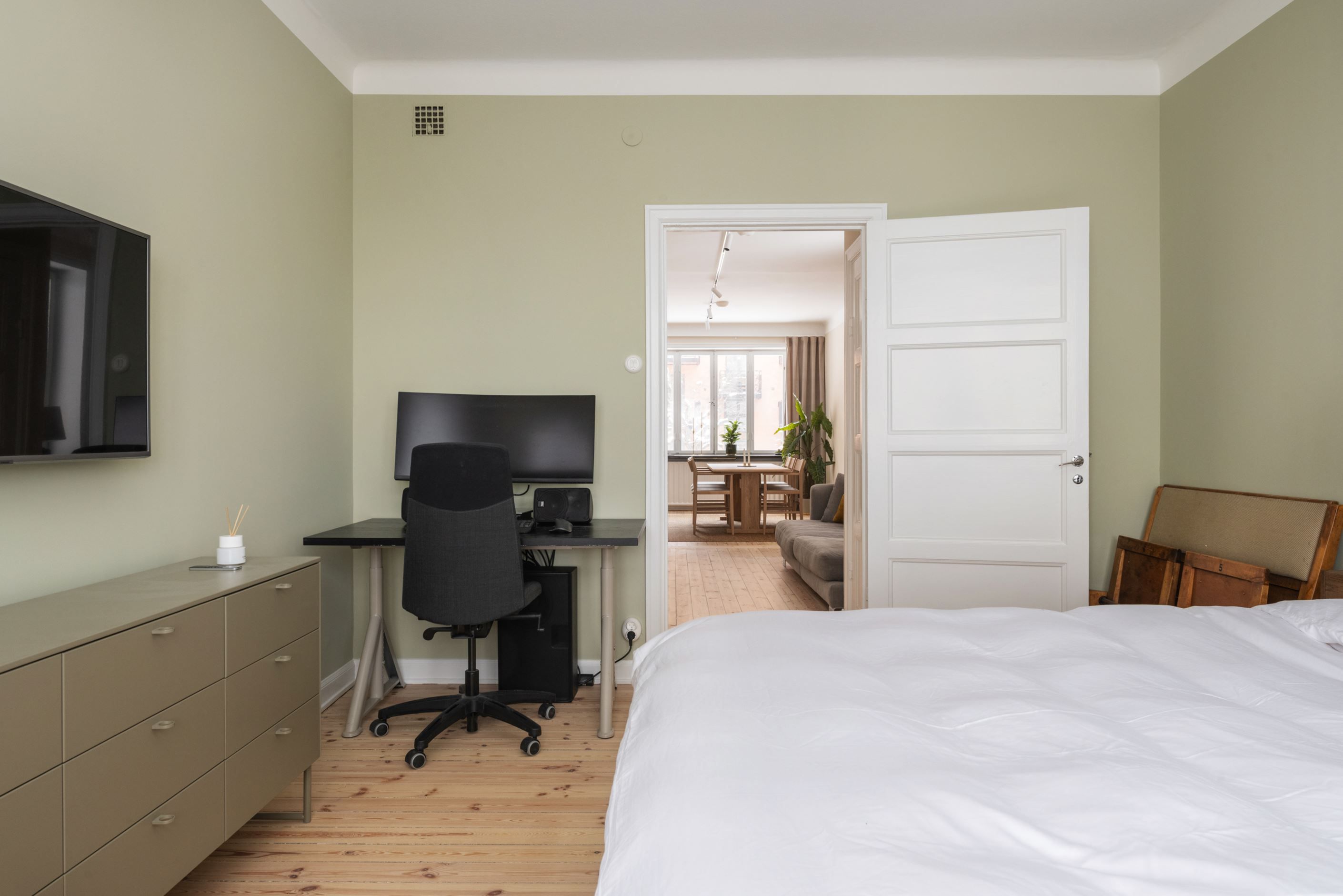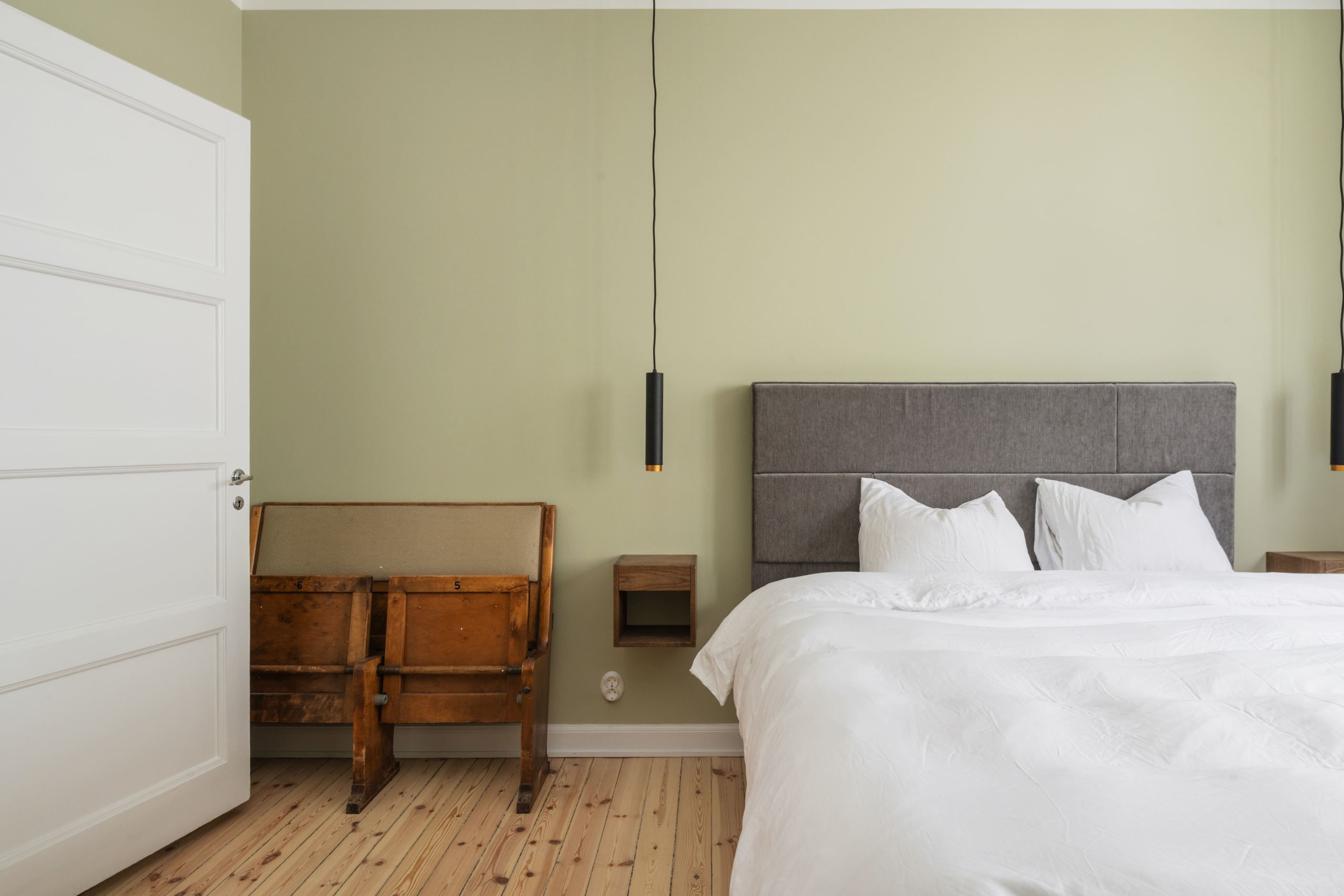 Det stora sovrummet är beläget i ett tyst och rofyllt läge och rymmer med lätthet dubbelsäng, sängbord och skrivbord. Det fräscha badrummet är stilrent inrett och utrustat med en duschhörna.