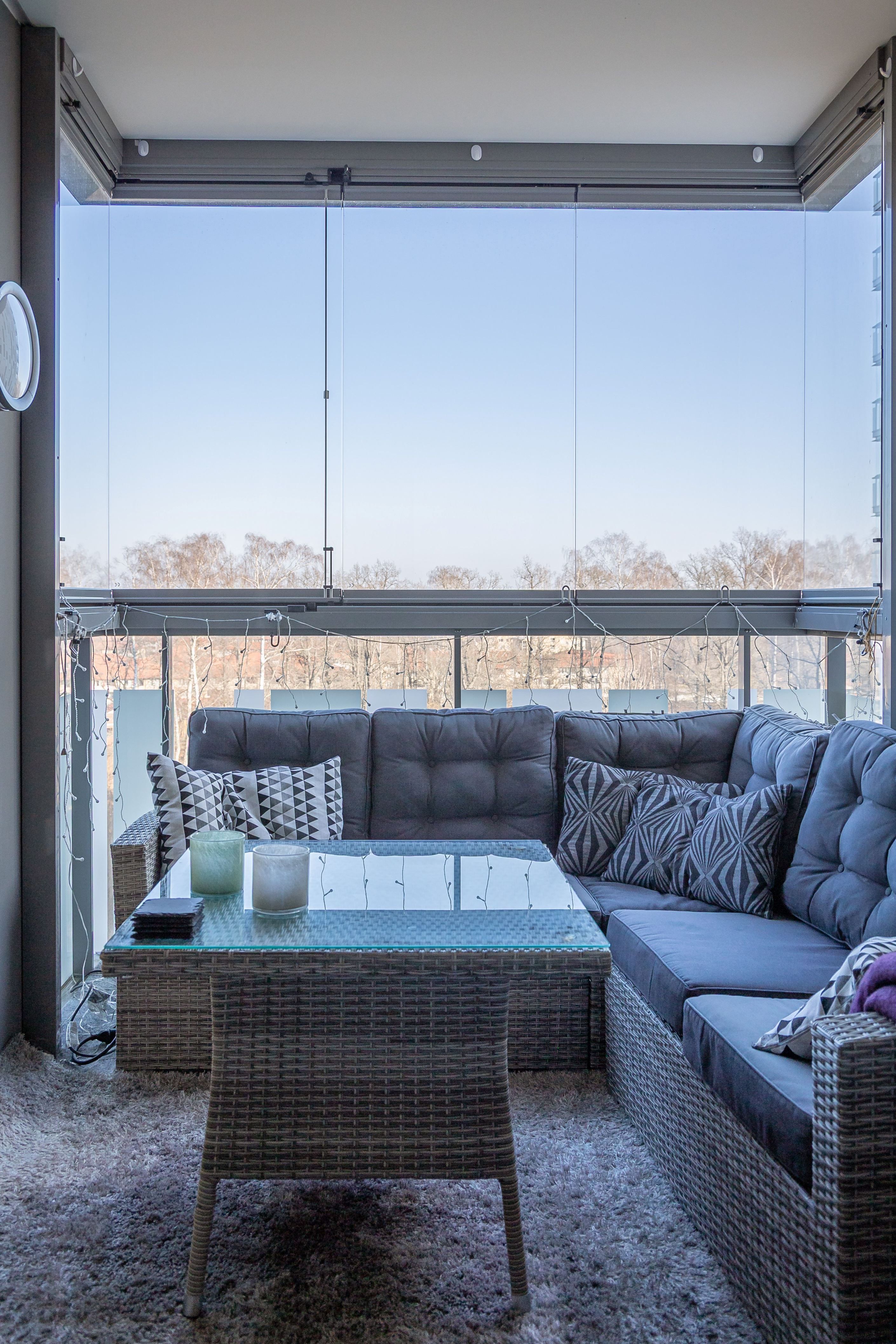 Vardagsrum med härligt fönsterparti mot den inglasade balkongen. Soffhörna och matplats. Inglasad balkong med skjutbara glaspartier i östläge där du kan uppleva de bästa soluppgångarna!
