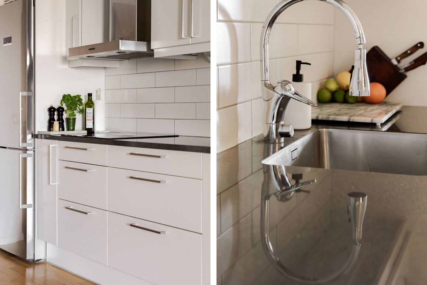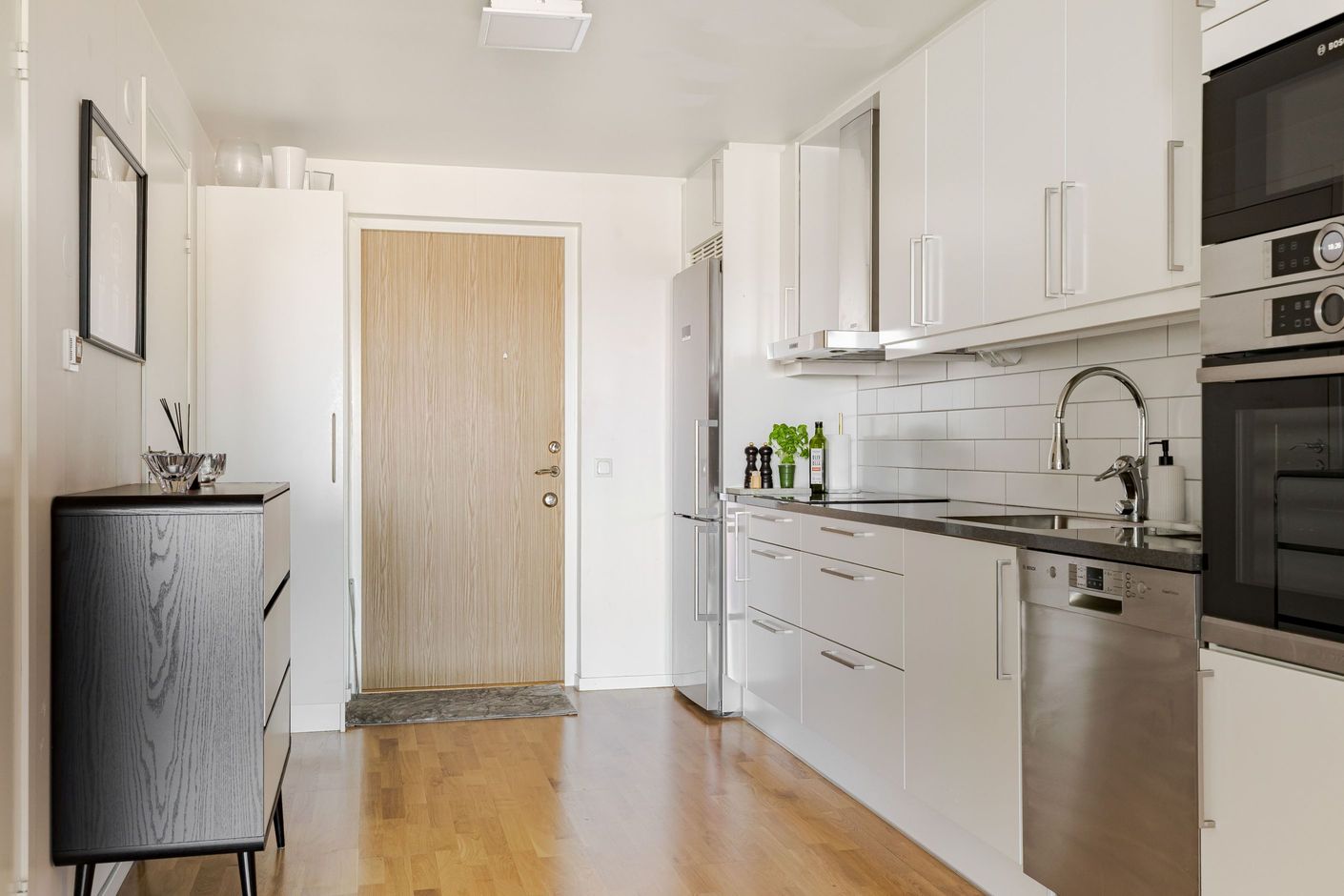 Stilrent kök i vitt med snygg bänkskiva och kakel. Köket är utrustat med spis, ugn, inbyggd mikrovågsugn fläkt, kyl/frys och diskmaskin. Bra matplats intill köket.
