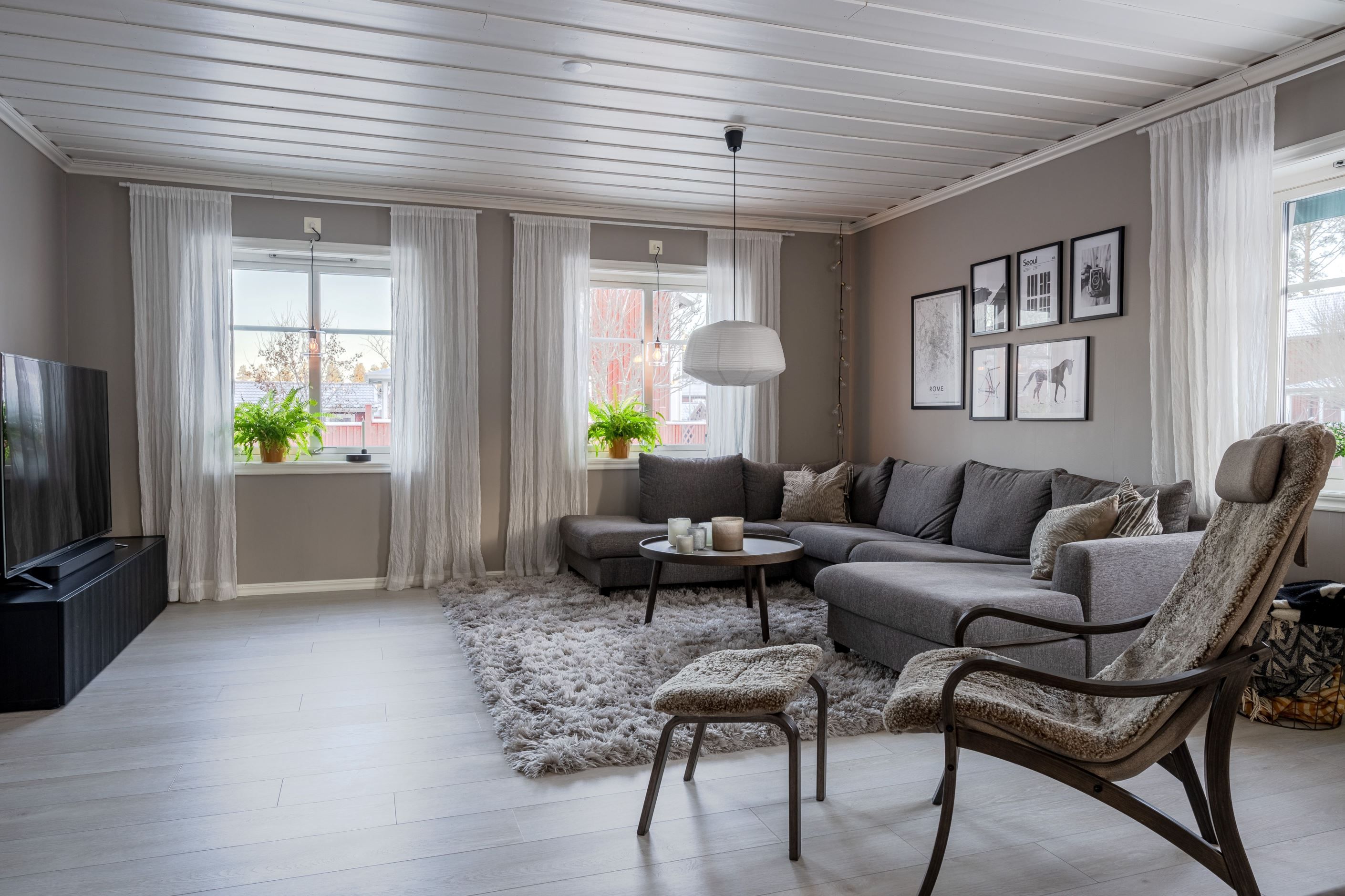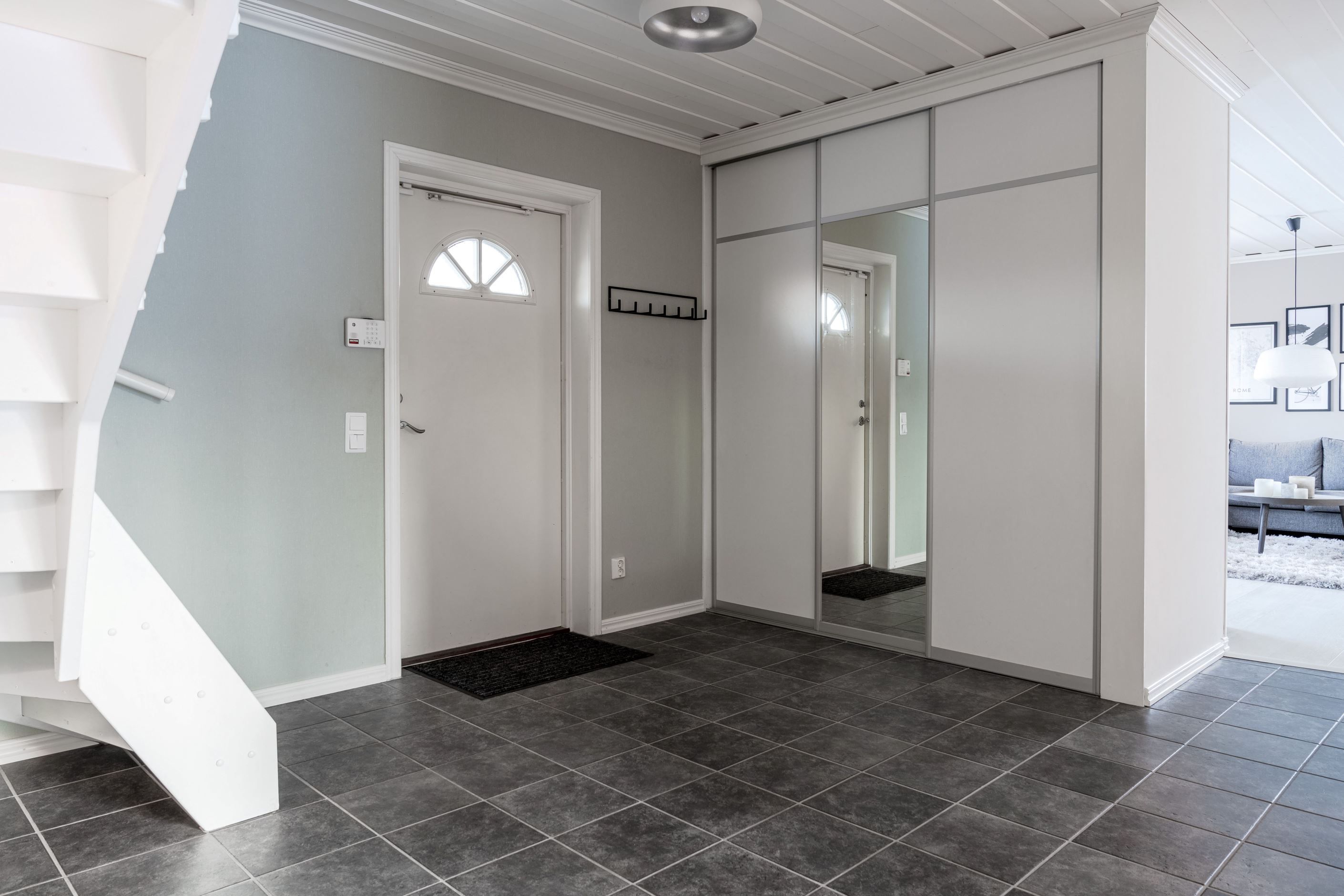 Redan i entrén märks omsorgen om huset. Golv, ytskikt och dörrar är genomgående i mycket gott skick och färgsättningen skapar en varm och modern känsla. Det stora vardagsrummet badar i ljus från flera fönster och rymmer både matplats och flera möbleringsalternativ, perfekt för både vardagsliv och större sällskap.