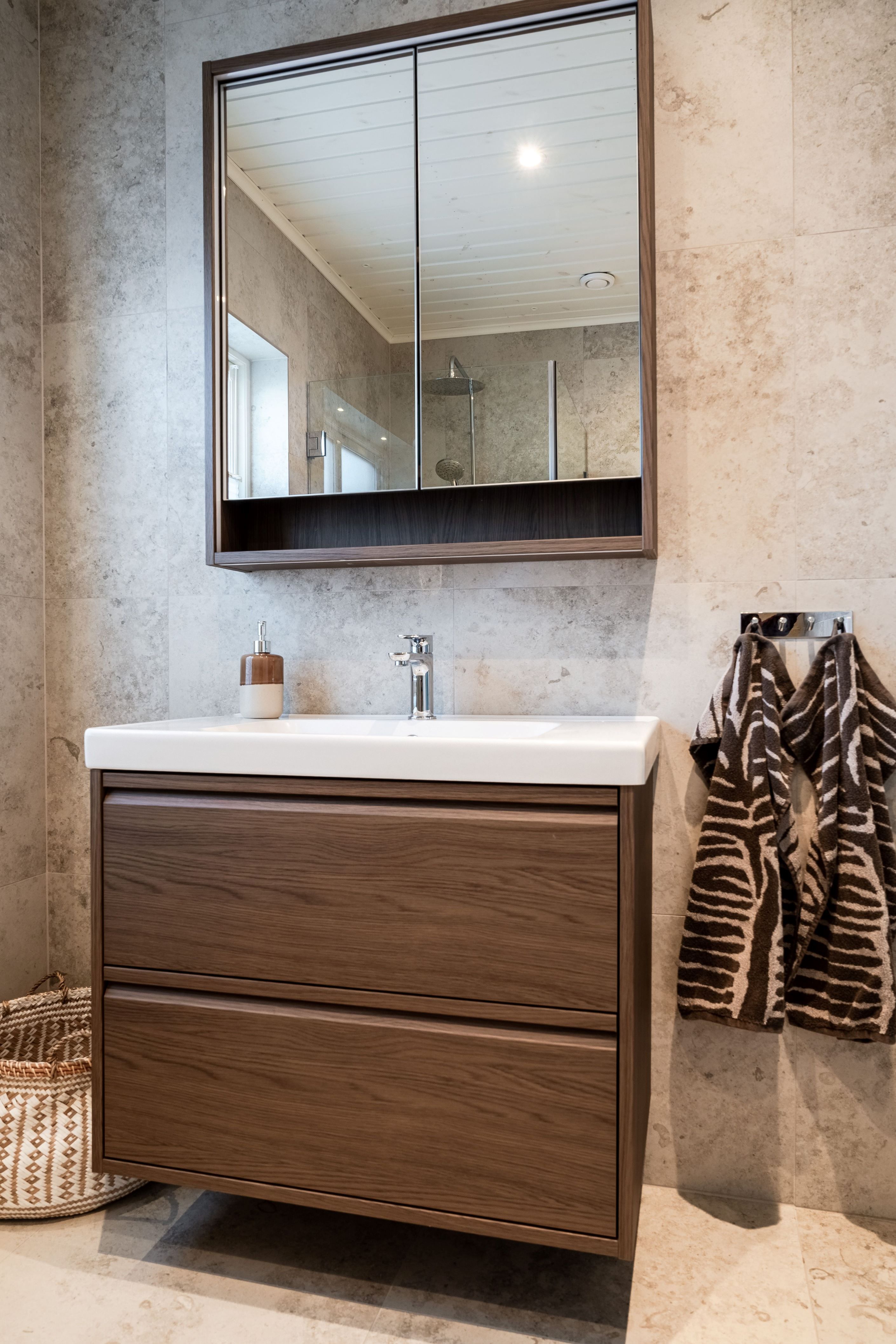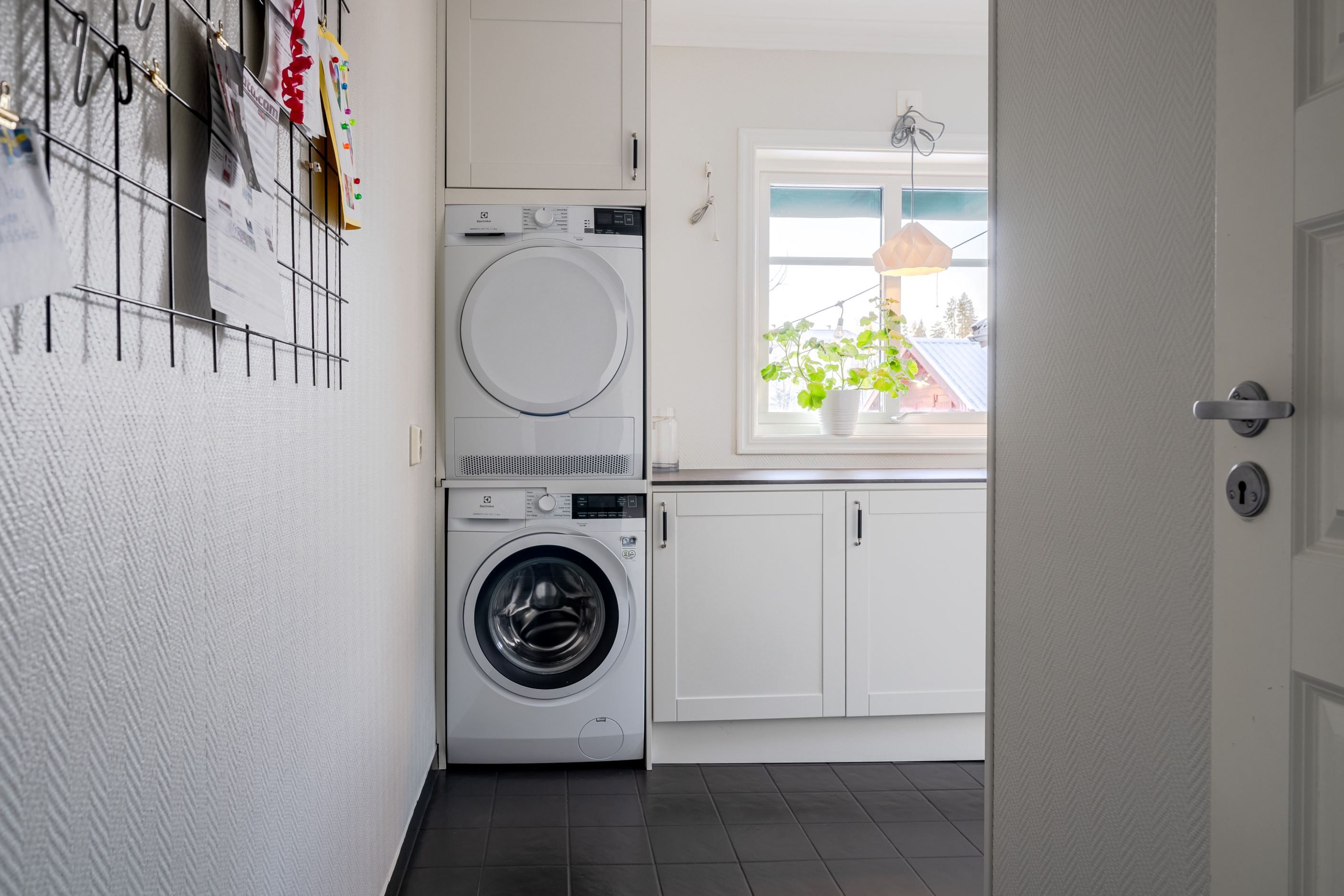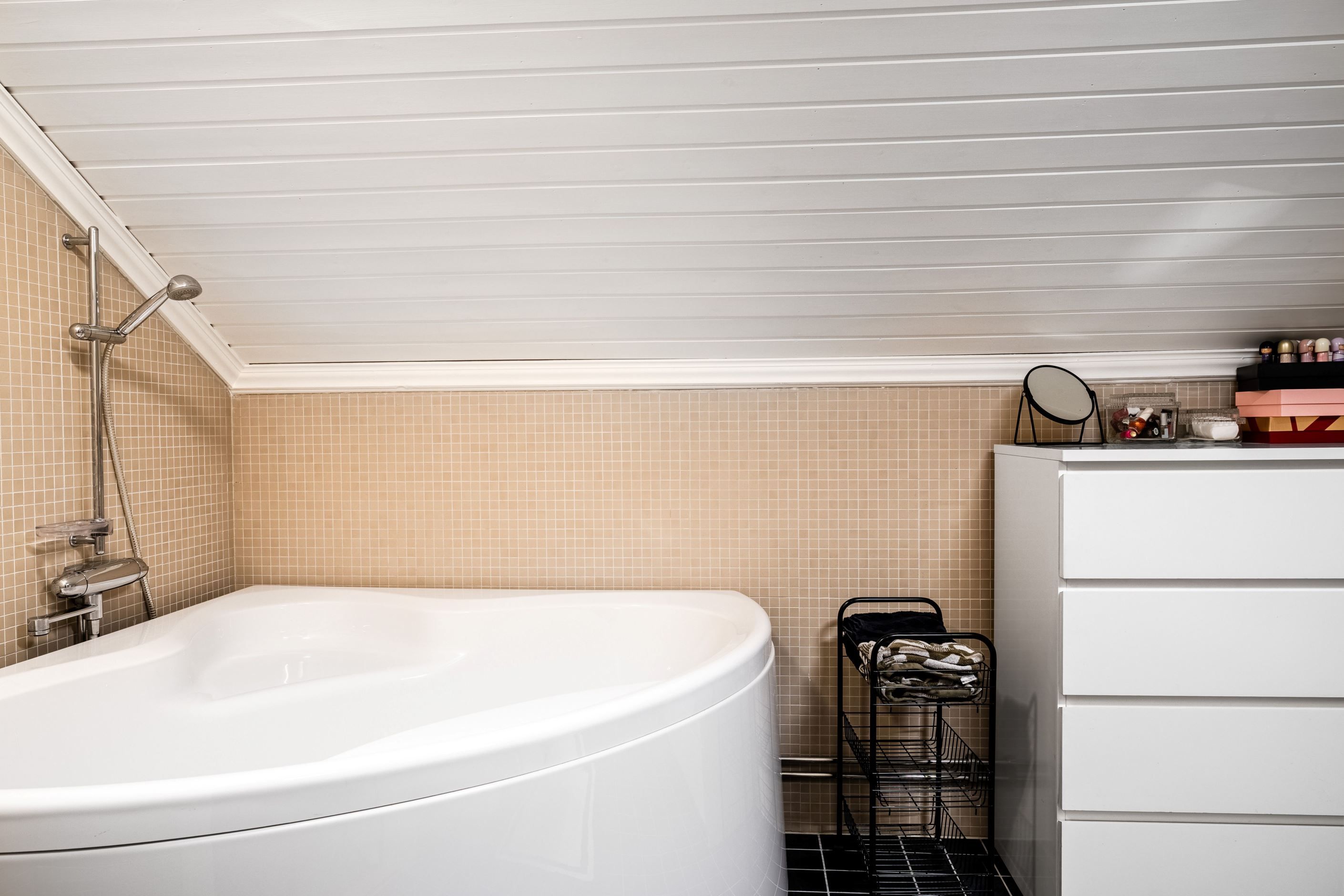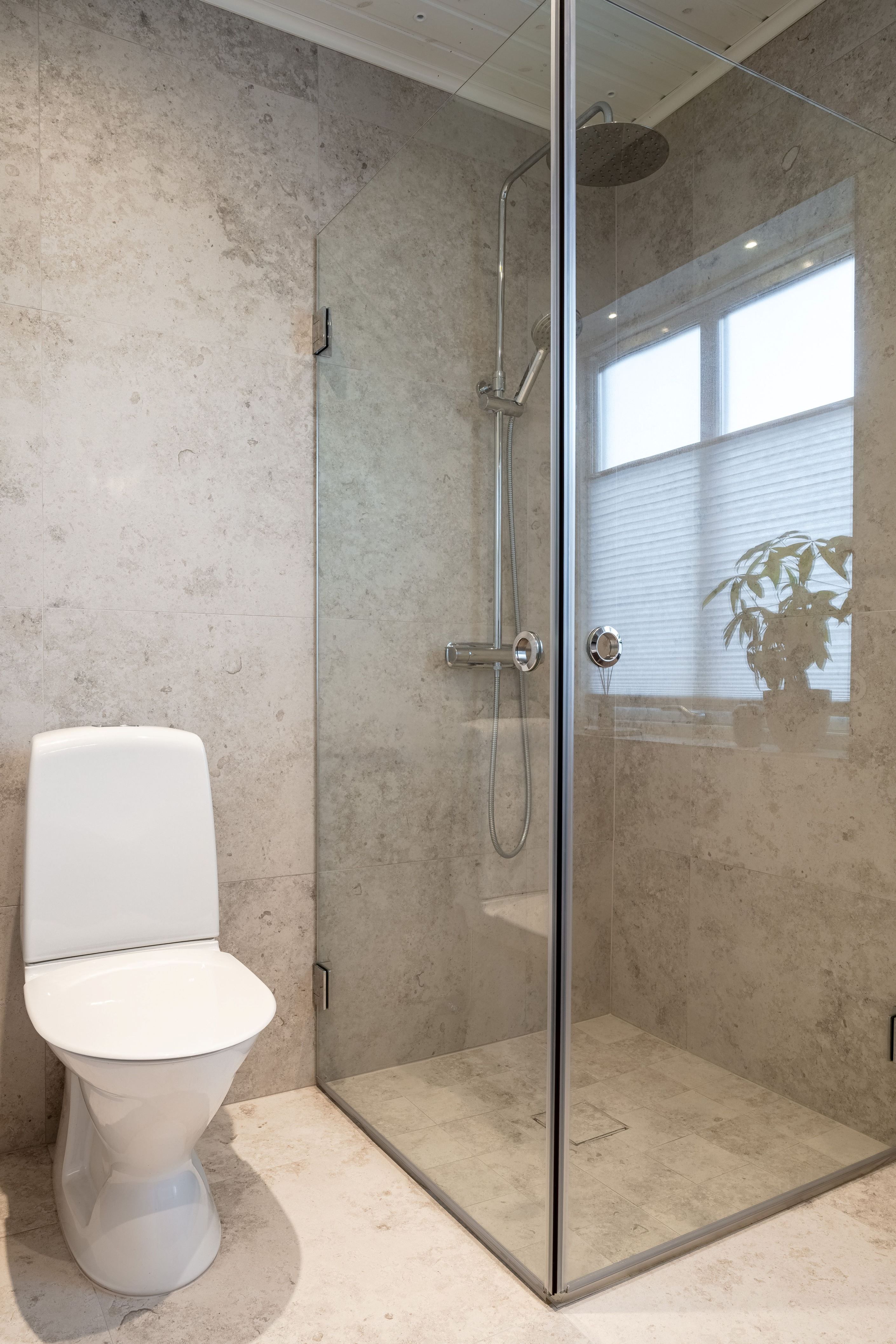 Entréplanets badrum genomgick en totalrenovering 2024 och håller en sober, hotellinspirerad standard. Här finns dusch, stilfull kommod och golvvärme för extra komfort. Samma år renoverades även tvättstugan och övre plan fick en helt ny WC.