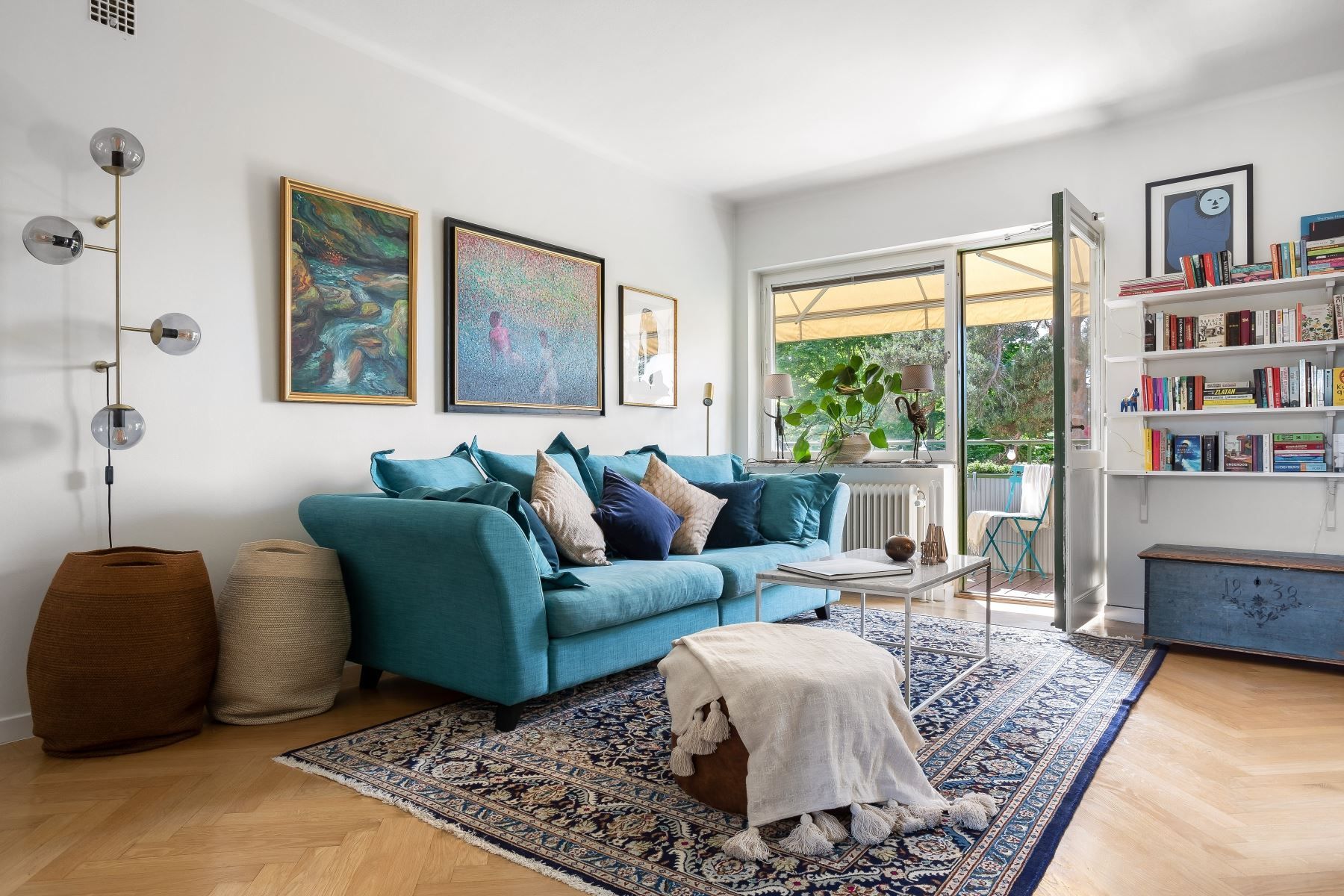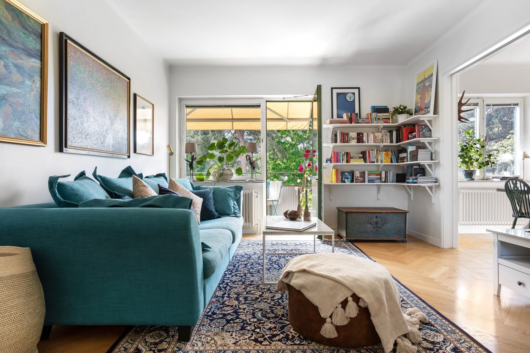 Välhållen och kulturmärkt fastighet anno 1942 med tillgång till en härlig, inbjudande innergård och fin inramning av Äppelvikens stillsamma villakvarter och grönskande allmänningar. Läget är perfekt, närhet till Alviks Torgs utbud av butiker, restauranger och kommunikationer, men ändå tillräckligt långt ifrån för att känna av Västerleds harmoniska atmosfär. Nära natur, bad och sköna promenadstråk, men ändå bara ca 10 minuters pendelavstånd till City. En känsla av att vara på landet och i "stan" på samma gång. Bättre läge är svårt att hitta! Trivsam och ljus lägenhet högst upp i huset med härlig funkis atmosfär och generös takhöjd. Stilfullt renoverad med ljusa materialval och vackra golv. Ett tillfälle för den som vill kunna flytta in utan nödvändiga renoveringar. Bekymmersfritt boende med charmig inramning.