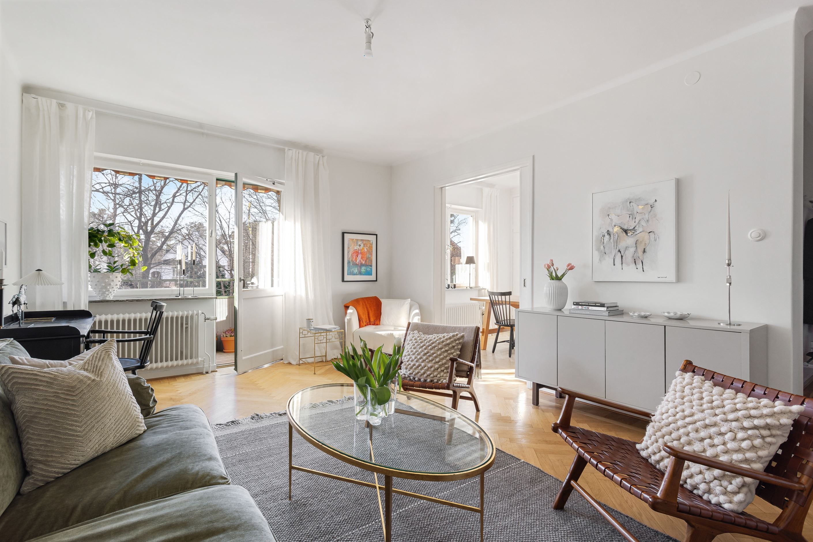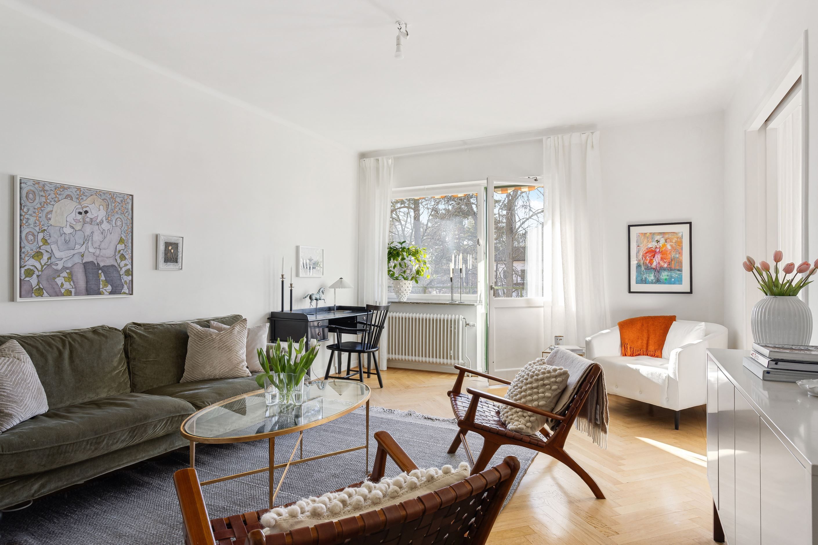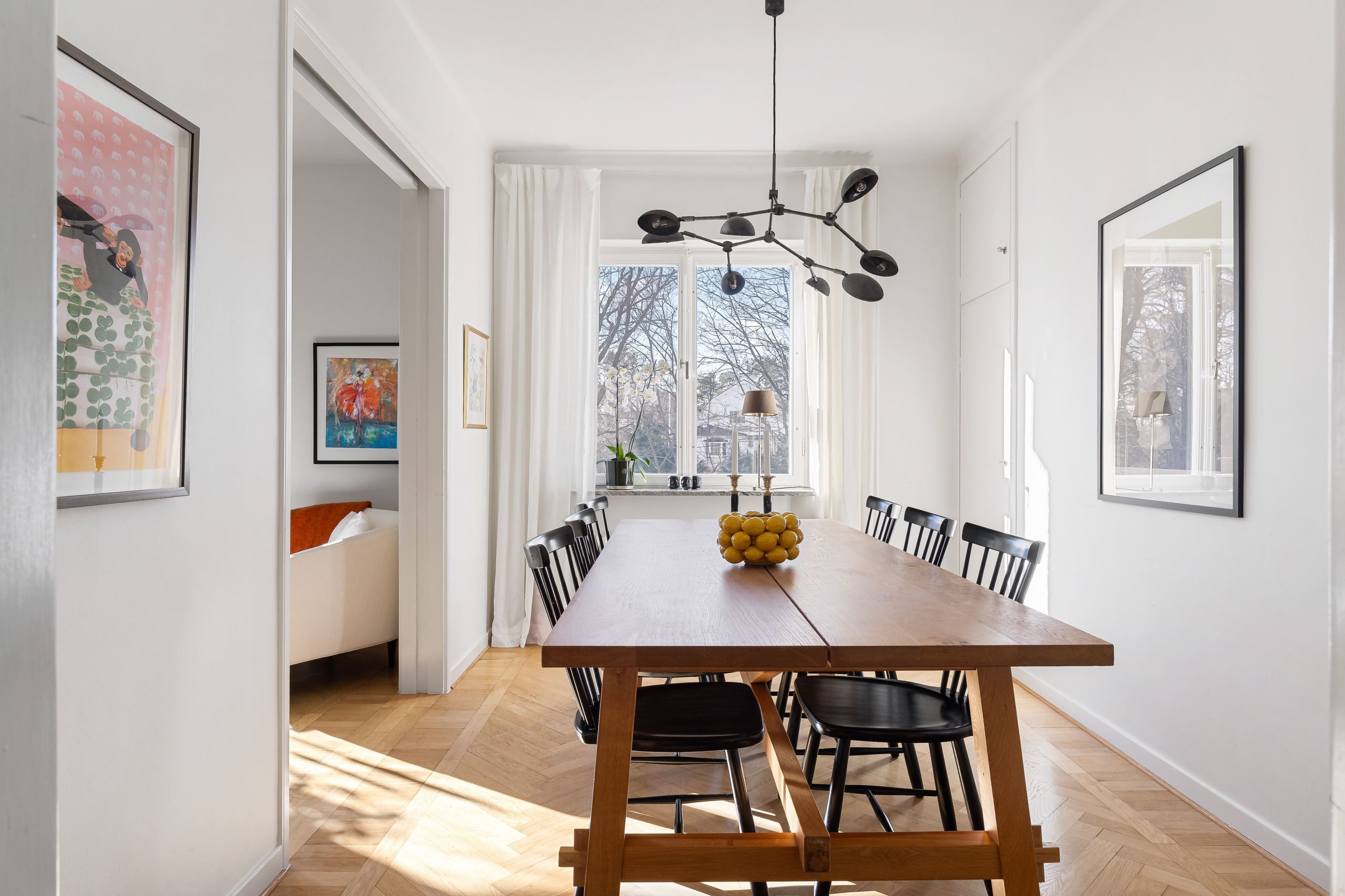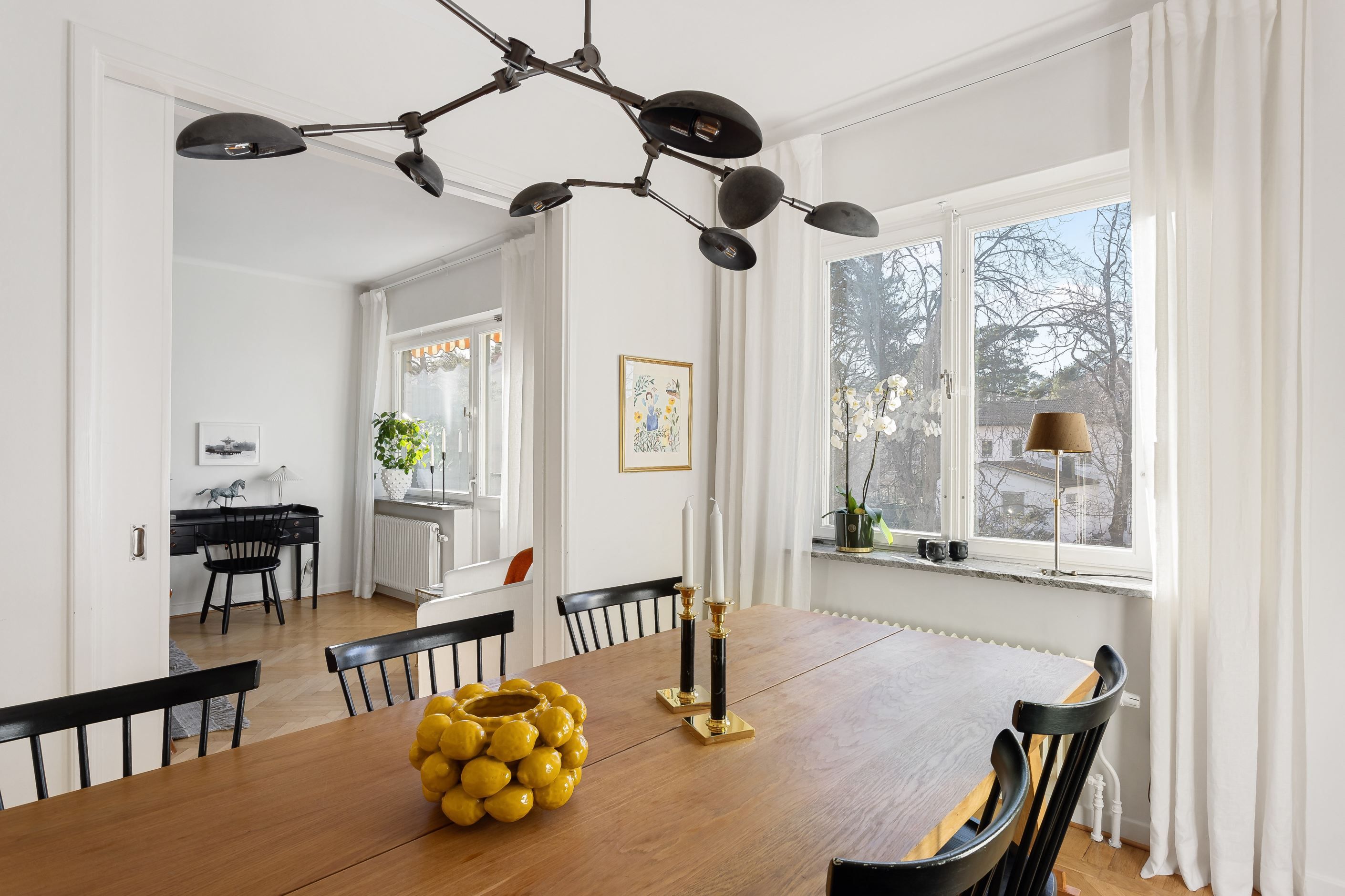 Stilfullt renoverad lägenhet i lugn Äppelviksidyll med fin vy mot grönska från den härliga balkongen. Vackra grannfastigheter från sekelskiftet utgör även de ett fint blickfång och lite "Bullerbykänsla". Unikt drömboende som erbjuder allt man kan önska sig såsom stilrent kök och bevarade originaldetaljer som det vackra parkettgolvet. Högt till tak, vilket ger fin rymd i samtliga rum.