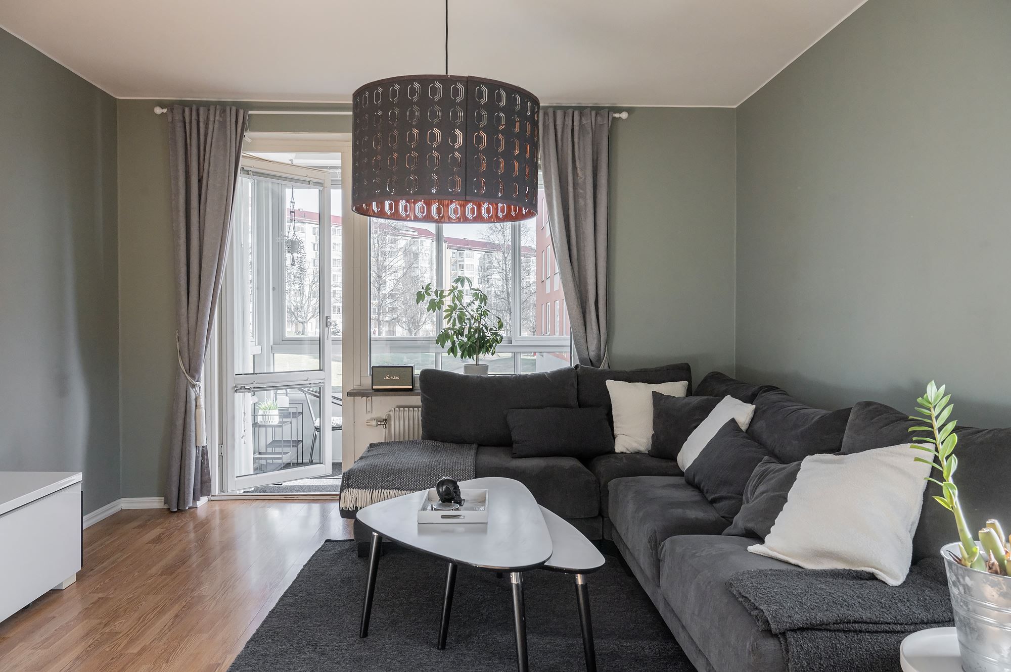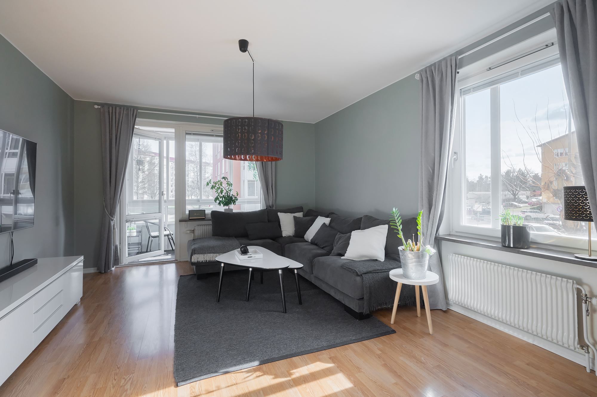 Köket ljust och rymmer både mycket köksredskap och matbord för 4-6 personer. Vardagsrummet är luftigt och kan möbleras på flera sätt, med ljusflöde från både balkongen och fönstren i 2 håll.