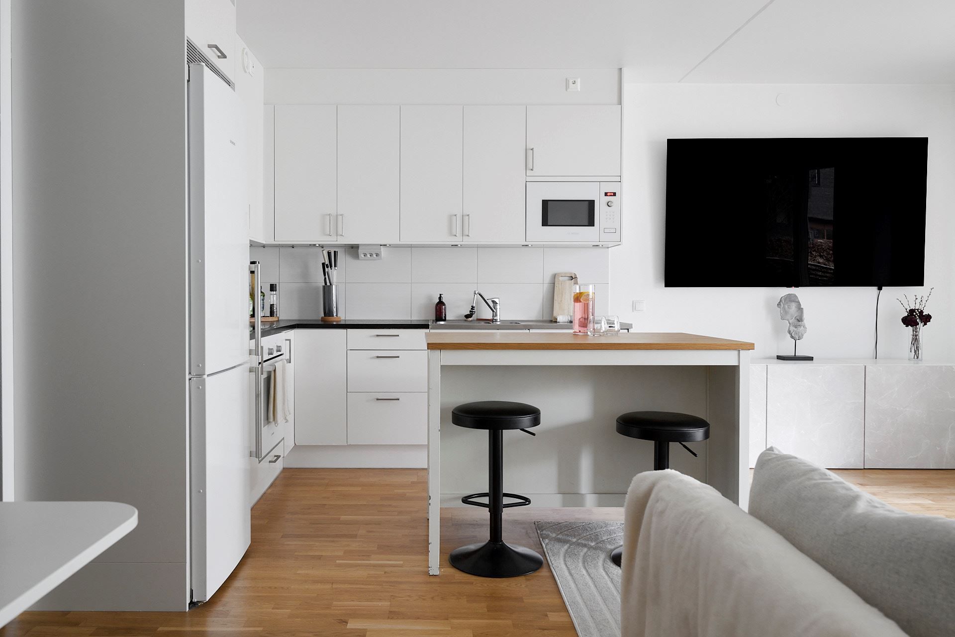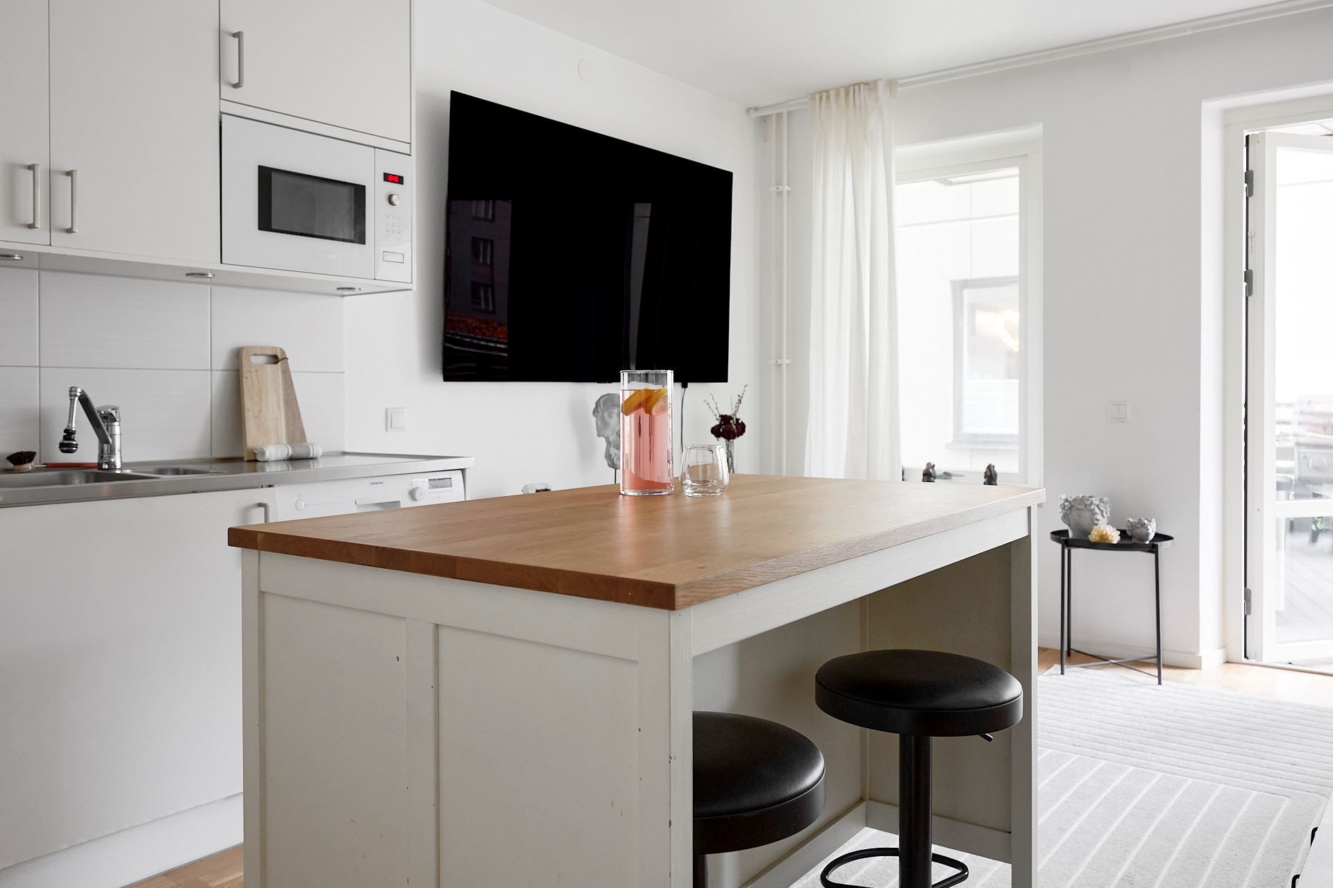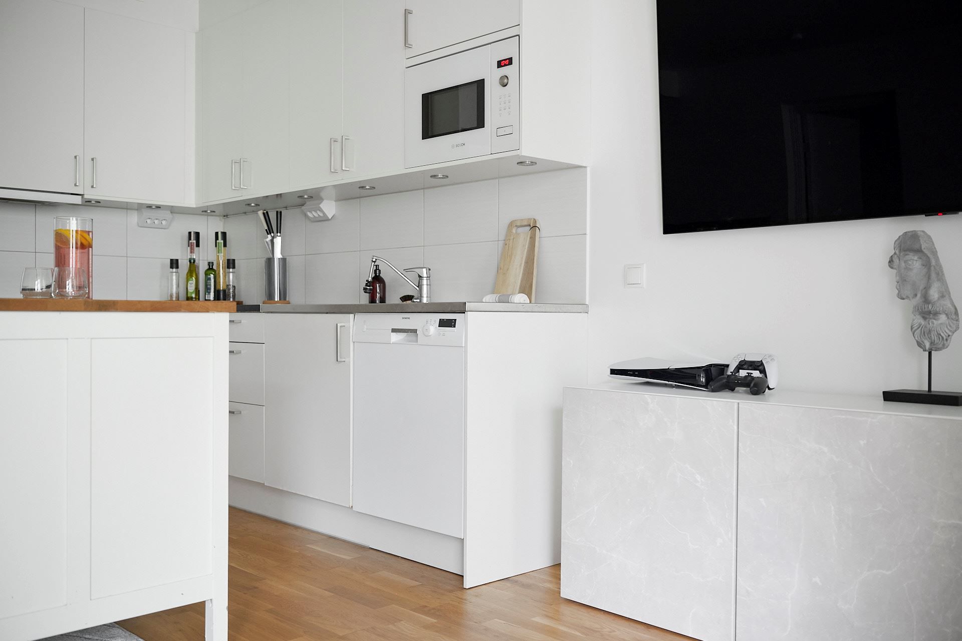 Köket är stilrent utrustat med integrerade vitvaror och bra arbetsytor. I direkt anslutning ligger vardagsrummet som rymmer både matgrupp och soffdel. I dagsläget är de insatt en köksö som ger ännu mer arbetsyta och förvaring. Härifrån kliver du ut på den rymliga balkongen som blir en härlig plats för sommarens måltider, kvällshäng eller lugna stunder i solen.
