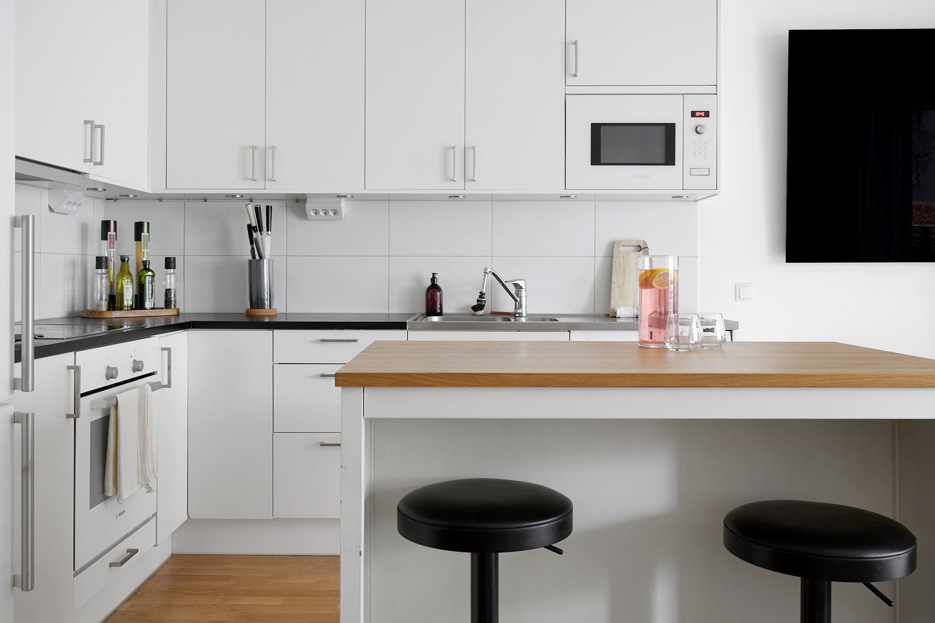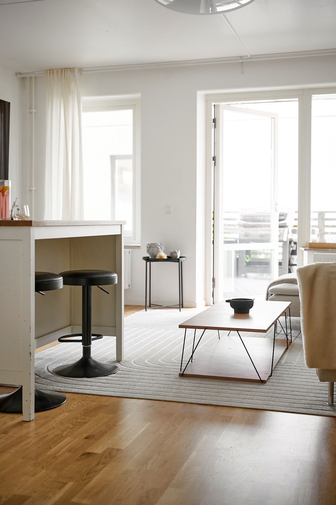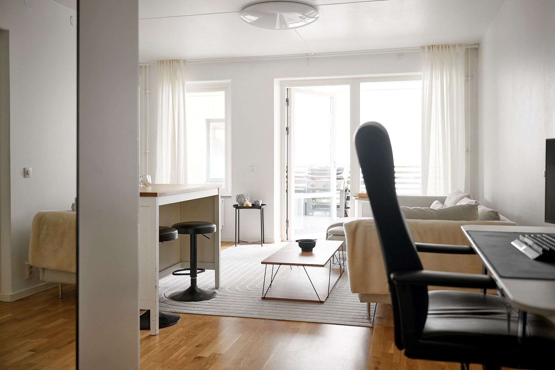 Köket är stilrent utrustat med integrerade vitvaror och bra arbetsytor. I direkt anslutning ligger vardagsrummet som rymmer både matgrupp och soffdel. I dagsläget är de insatt en köksö som ger ännu mer arbetsyta och förvaring. Härifrån kliver du ut på den rymliga balkongen som blir en härlig plats för sommarens måltider, kvällshäng eller lugna stunder i solen.