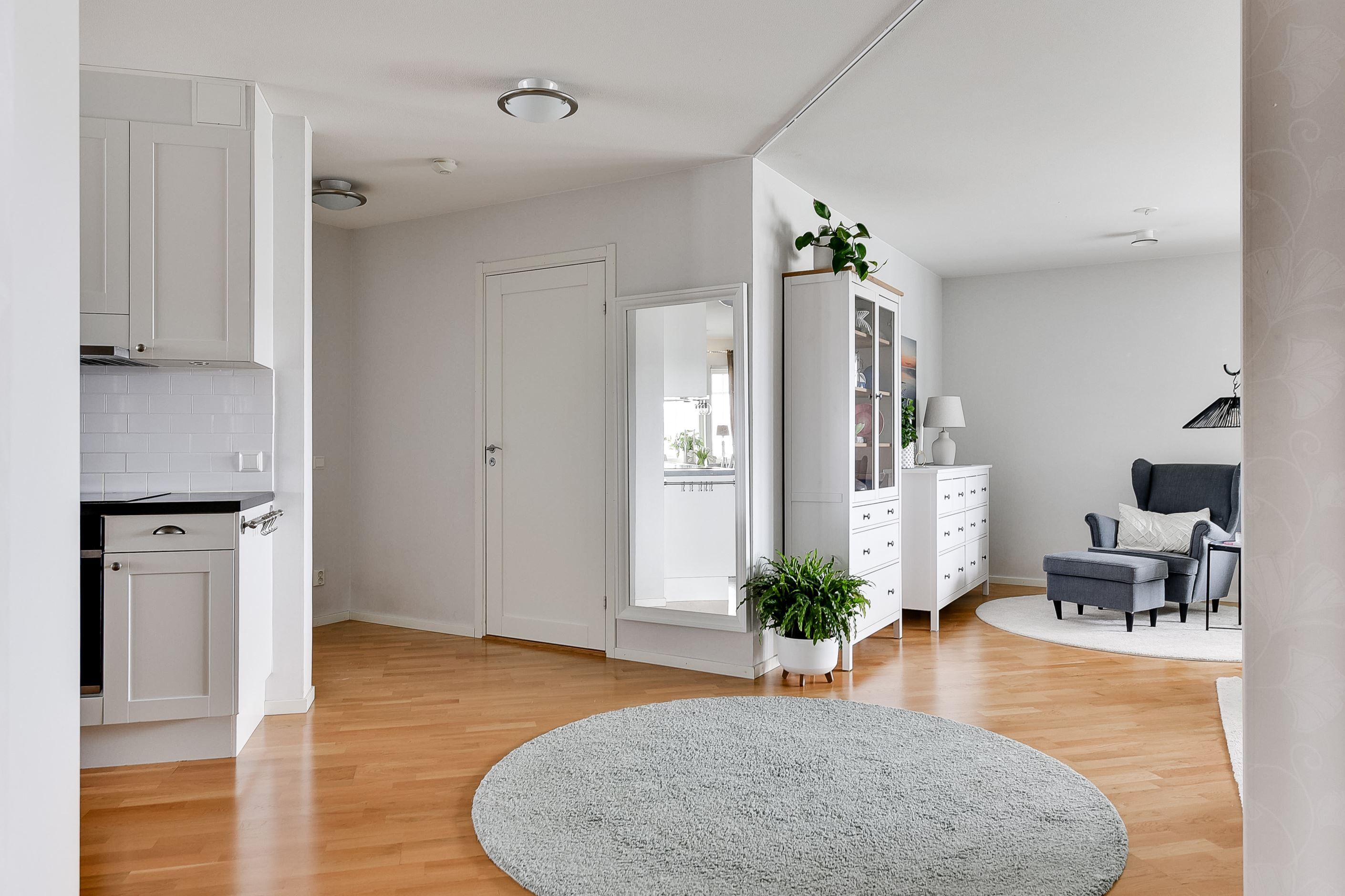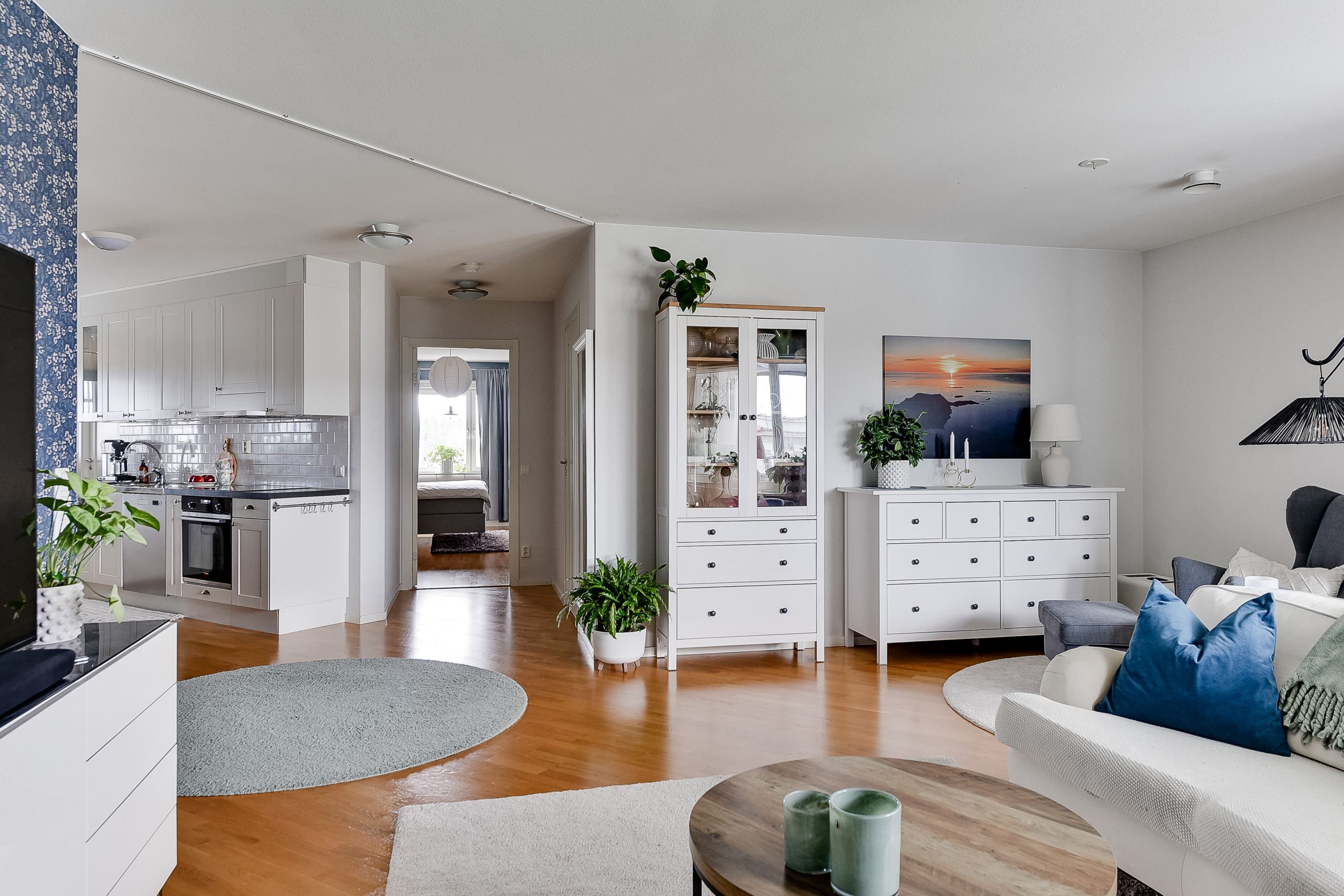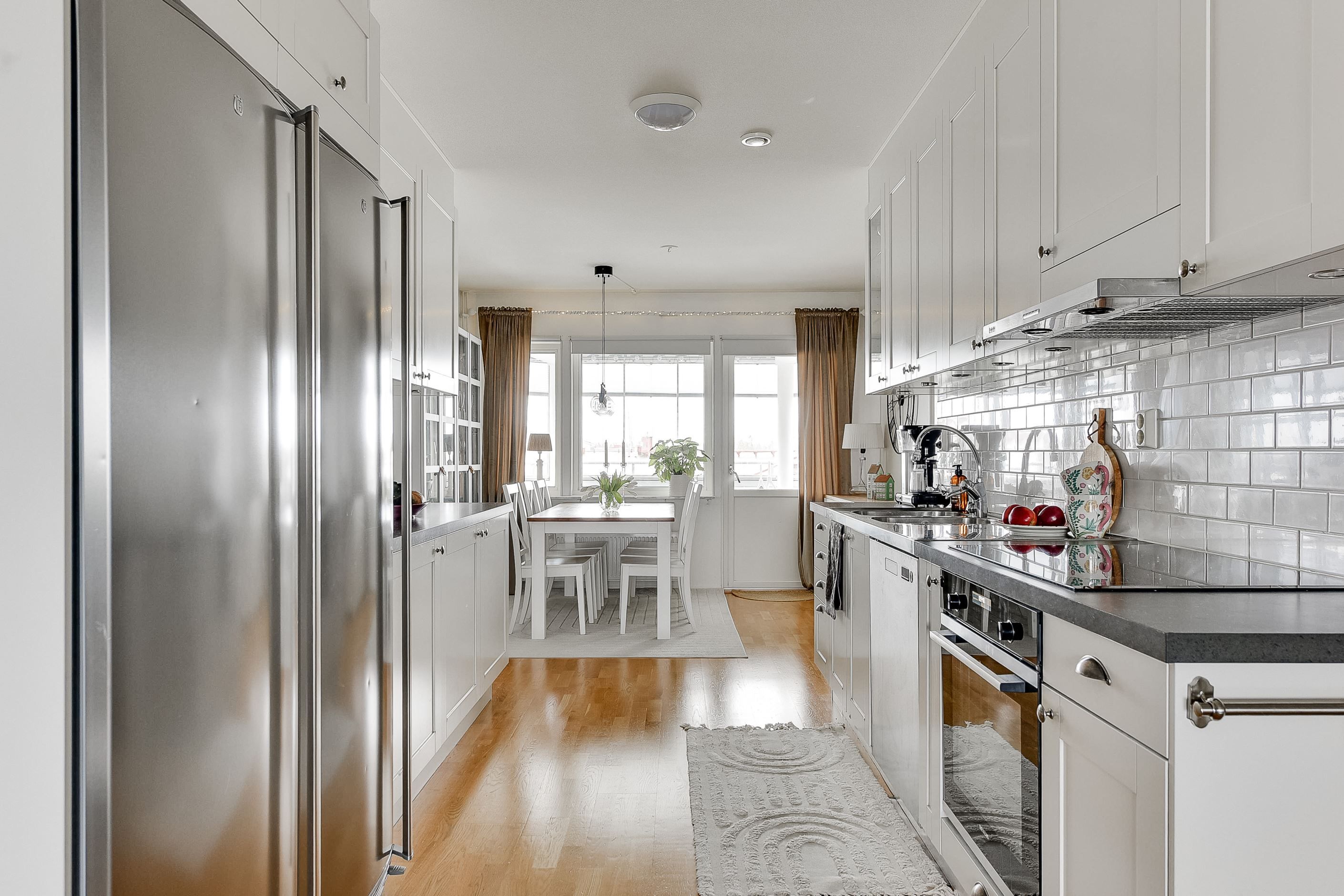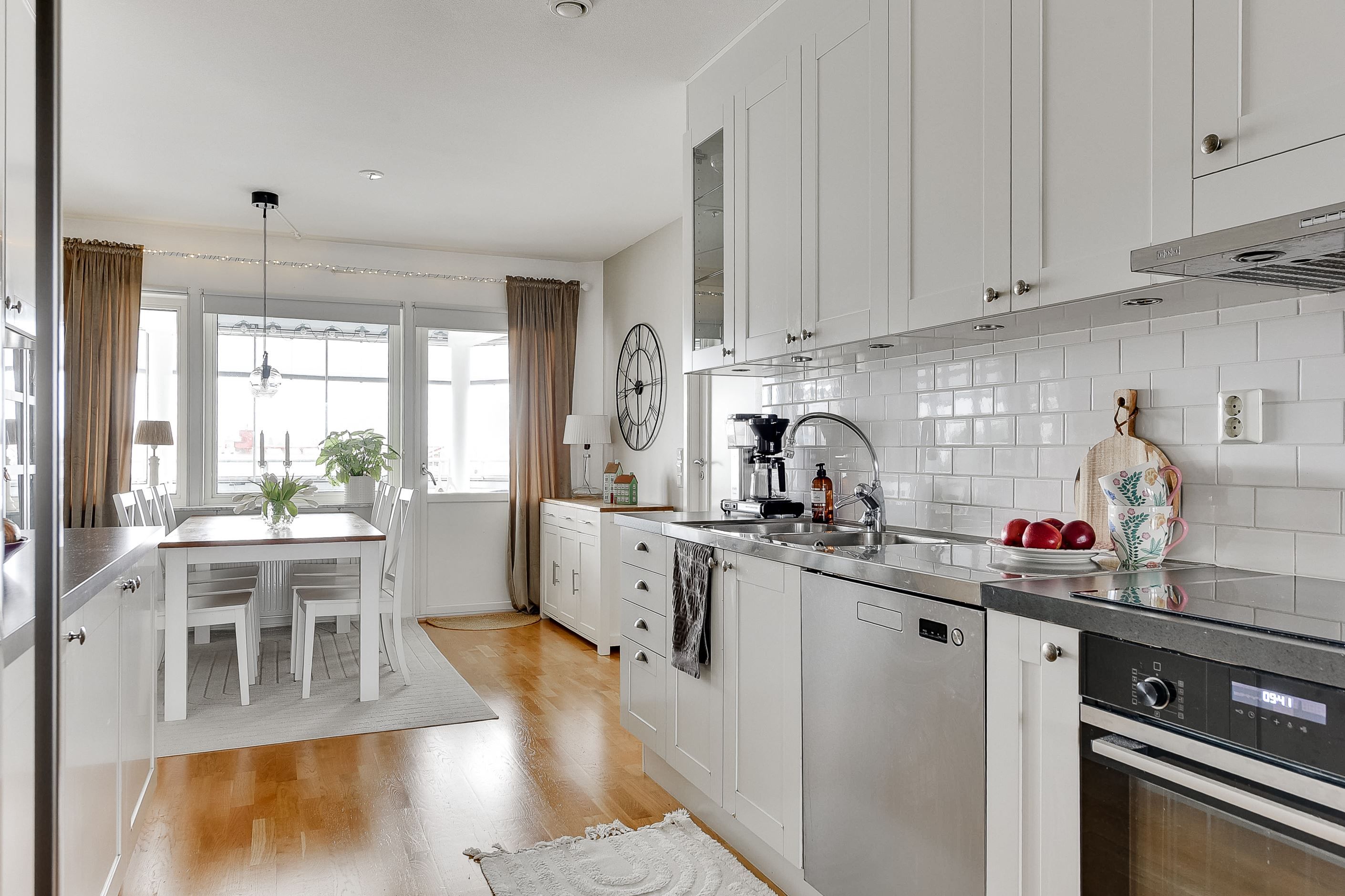 Den öppna planlösningen mellan kök och vardagsrum skapar en inbjudande samlingspunkt för både familjeliv och umgänge. De ljusa ytskikten, ekparketten och stora fönsterpartierna ger hemmet en tidlös och harmonisk känsla.