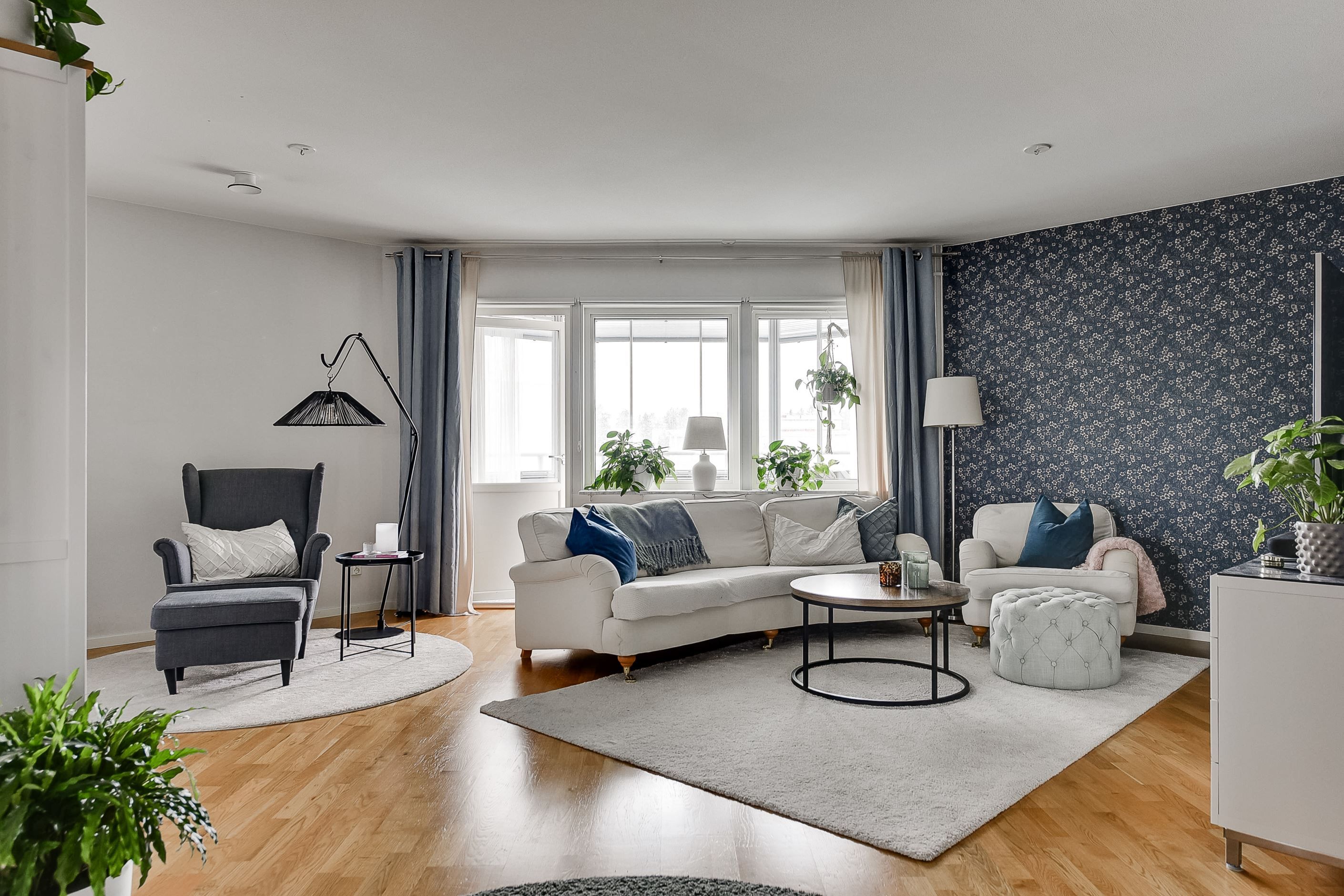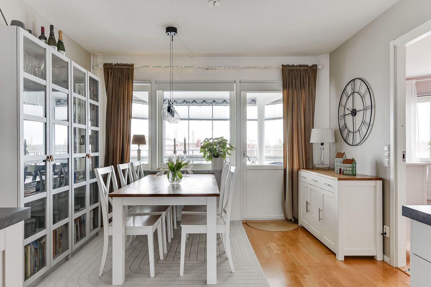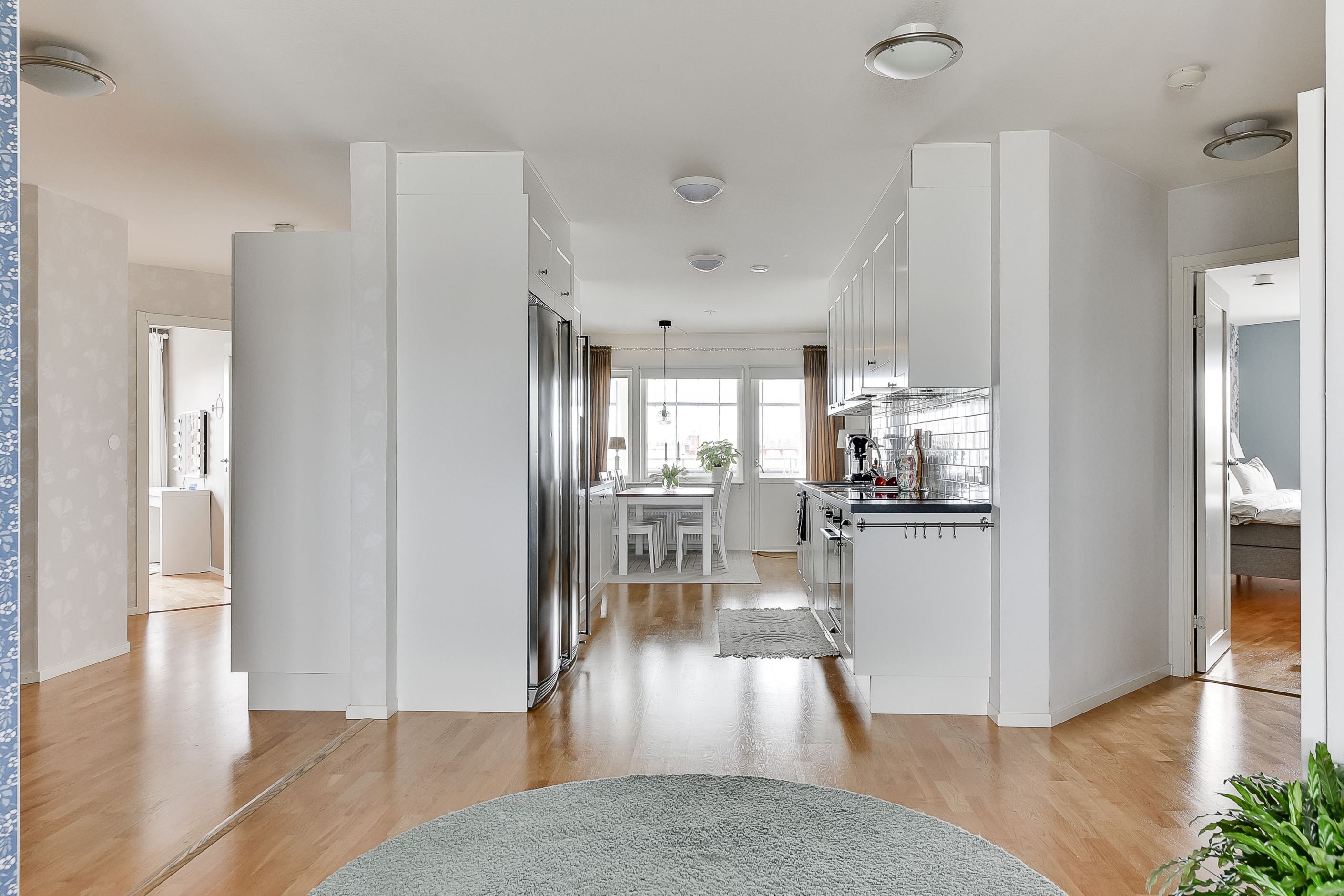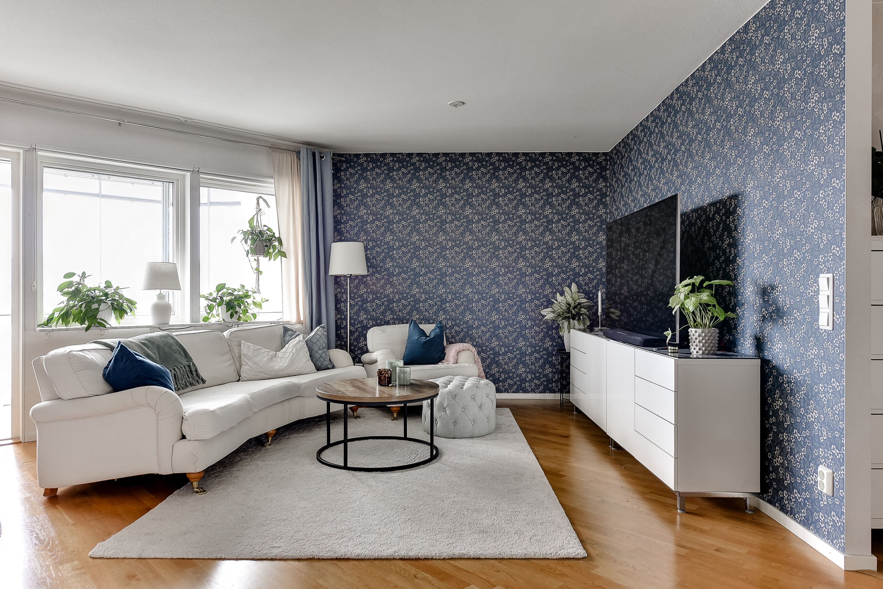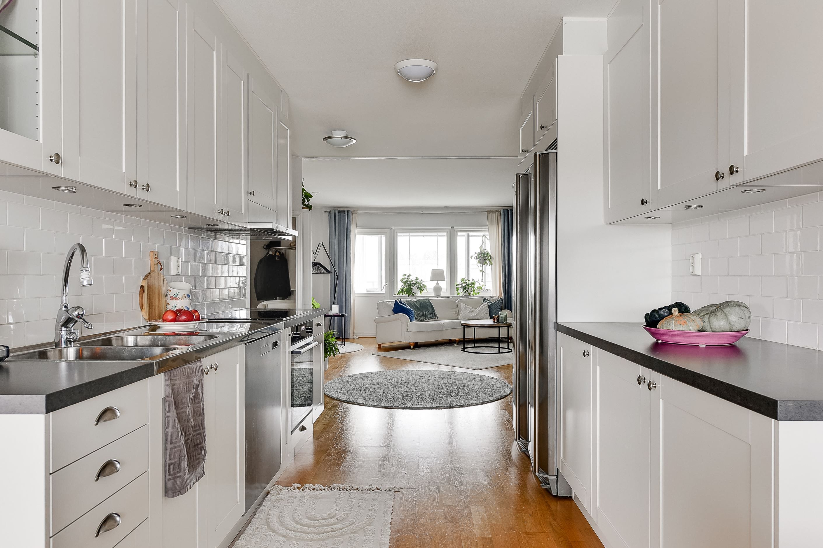 Den öppna planlösningen mellan kök och vardagsrum skapar en inbjudande samlingspunkt för både familjeliv och umgänge. De ljusa ytskikten, ekparketten och stora fönsterpartierna ger hemmet en tidlös och harmonisk känsla.