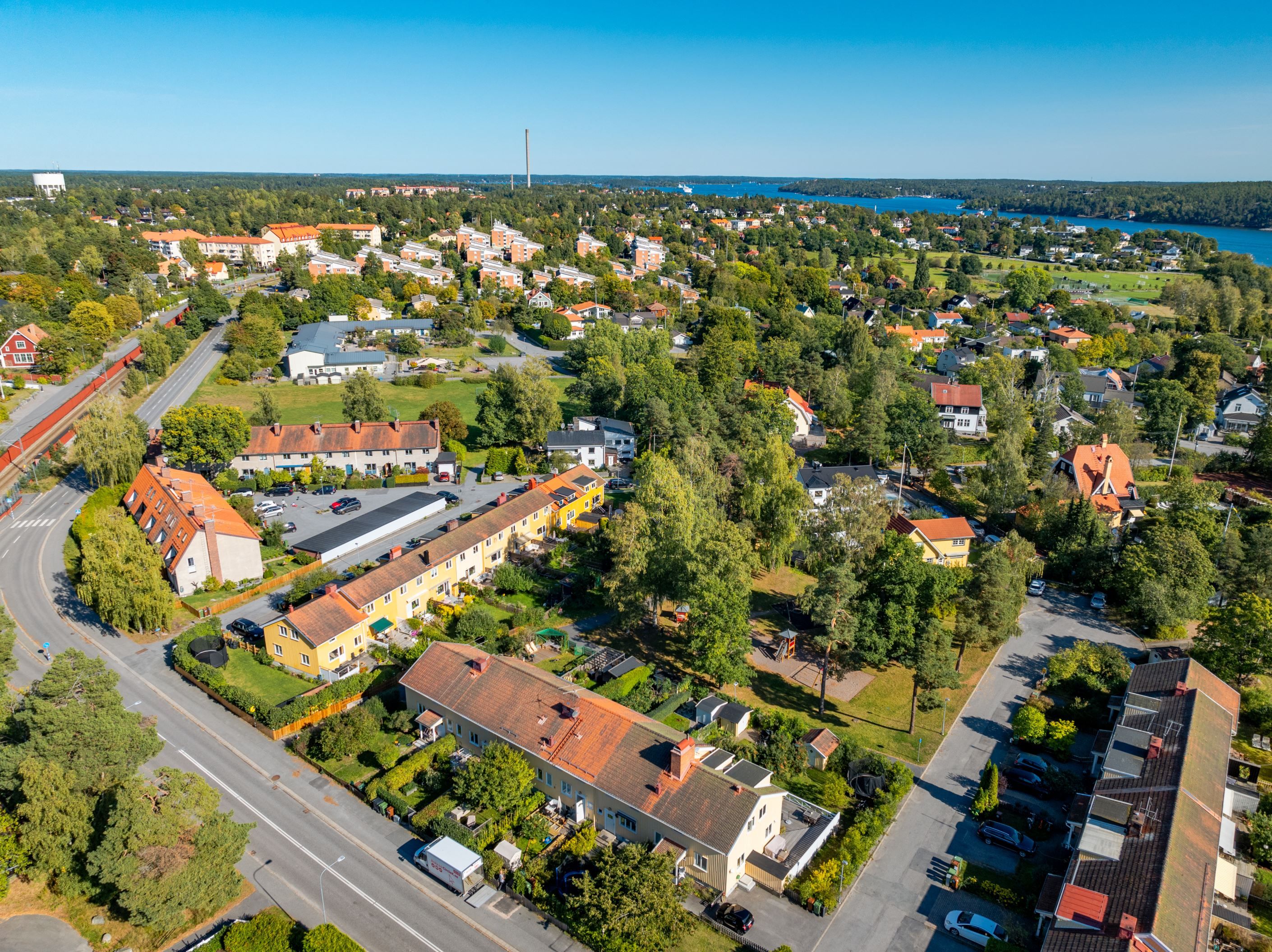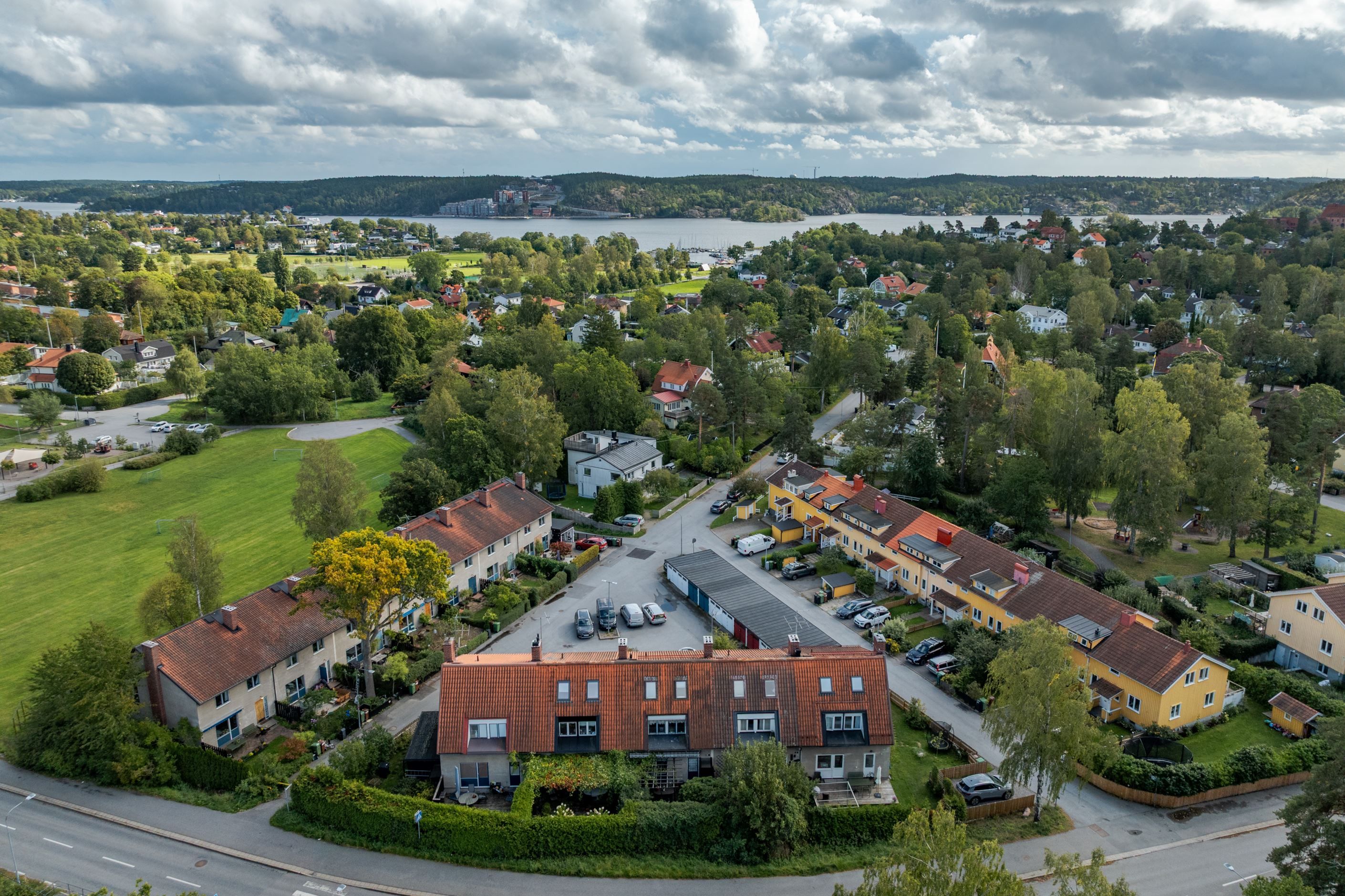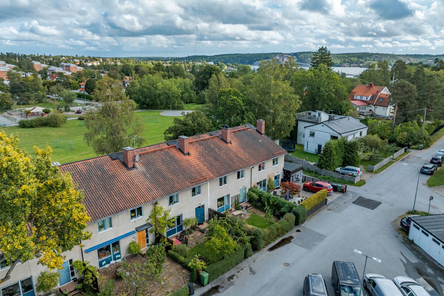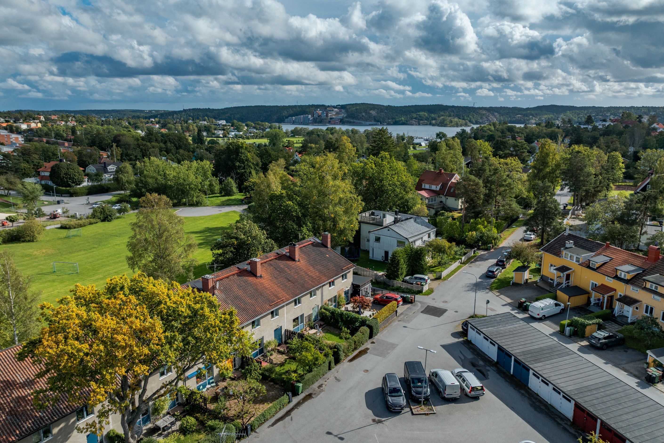 Den charmiga radhuslängan ligger i det riktigt rofyllda området Brevik, en lummig och uppvuxen idyll på östra delen av södra Lidingön. Breviks Båtsällskap ligger 700 meter bort, här är det nära till vatten, bad och vackra promenadstråk längs strandpromenader och utsiktsplatser. Här finns också gott om lekplatser, fotbollsplaner och tennisbanor. I direkt närhet finns också ett mindre centrum med mataffär, café, bageri och restaurang. Från huset är det gångavstånd till fantastiska Kottlasjön med mysiga vattenverket och härliga Breviksbadet intill. På Lidingöns västra sida ligger Millesgården med en gedigen utställningsverksamhet, och ön huserar också Nyckelviksskolan som har årliga konstutställningar. Området har bra kommunikationer med Lidingöbanan ett par minuter bort, och därmed snabb förbindelse med tunnelbana i Ropsten. Härifrån tar du dig enkelt vidare kollektivt också med många bussförbindelser mot stan.