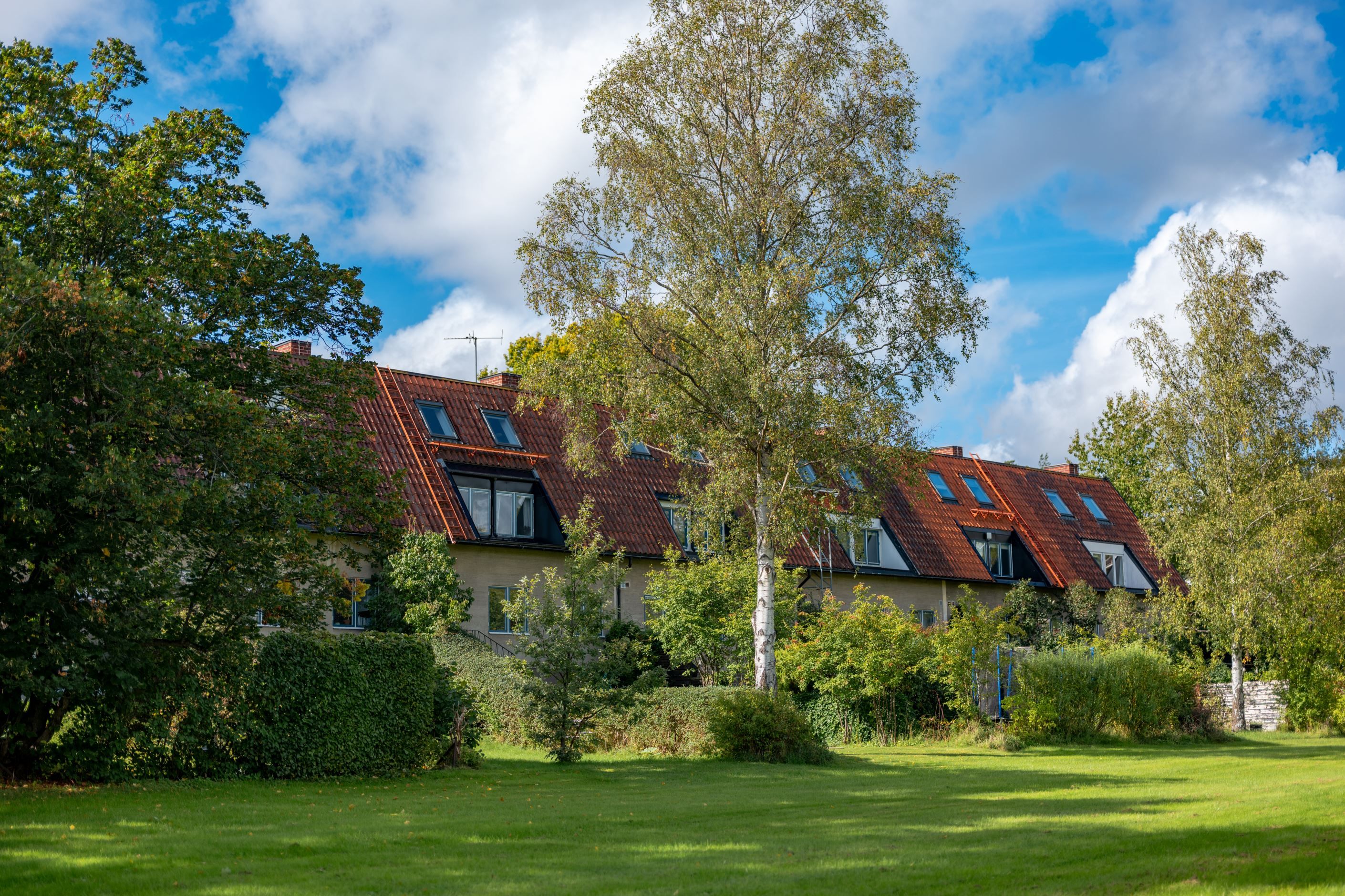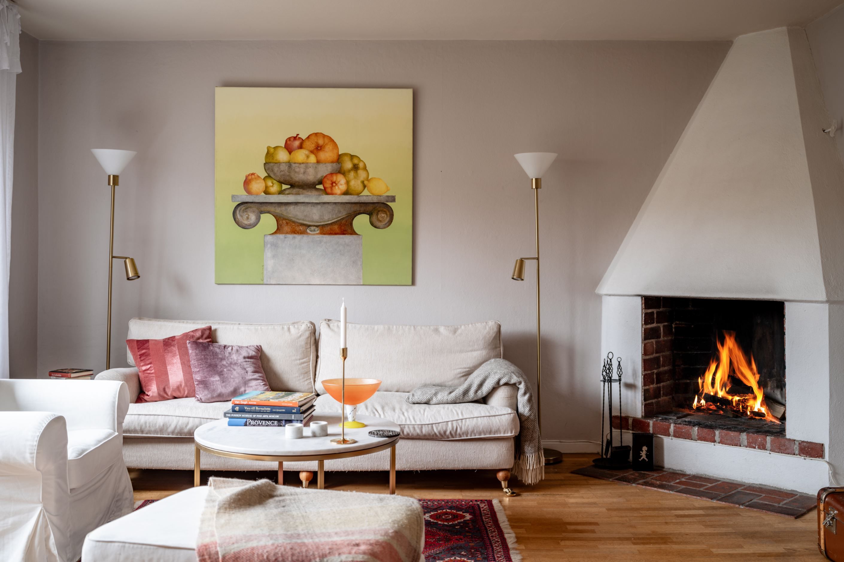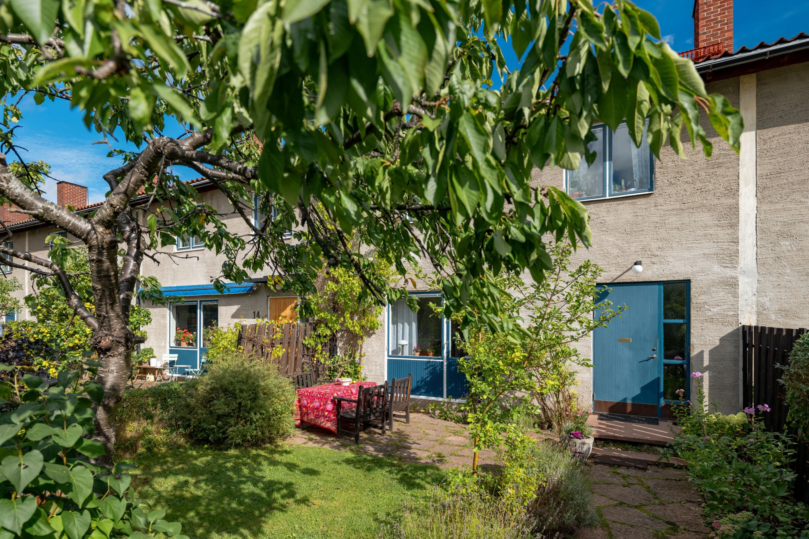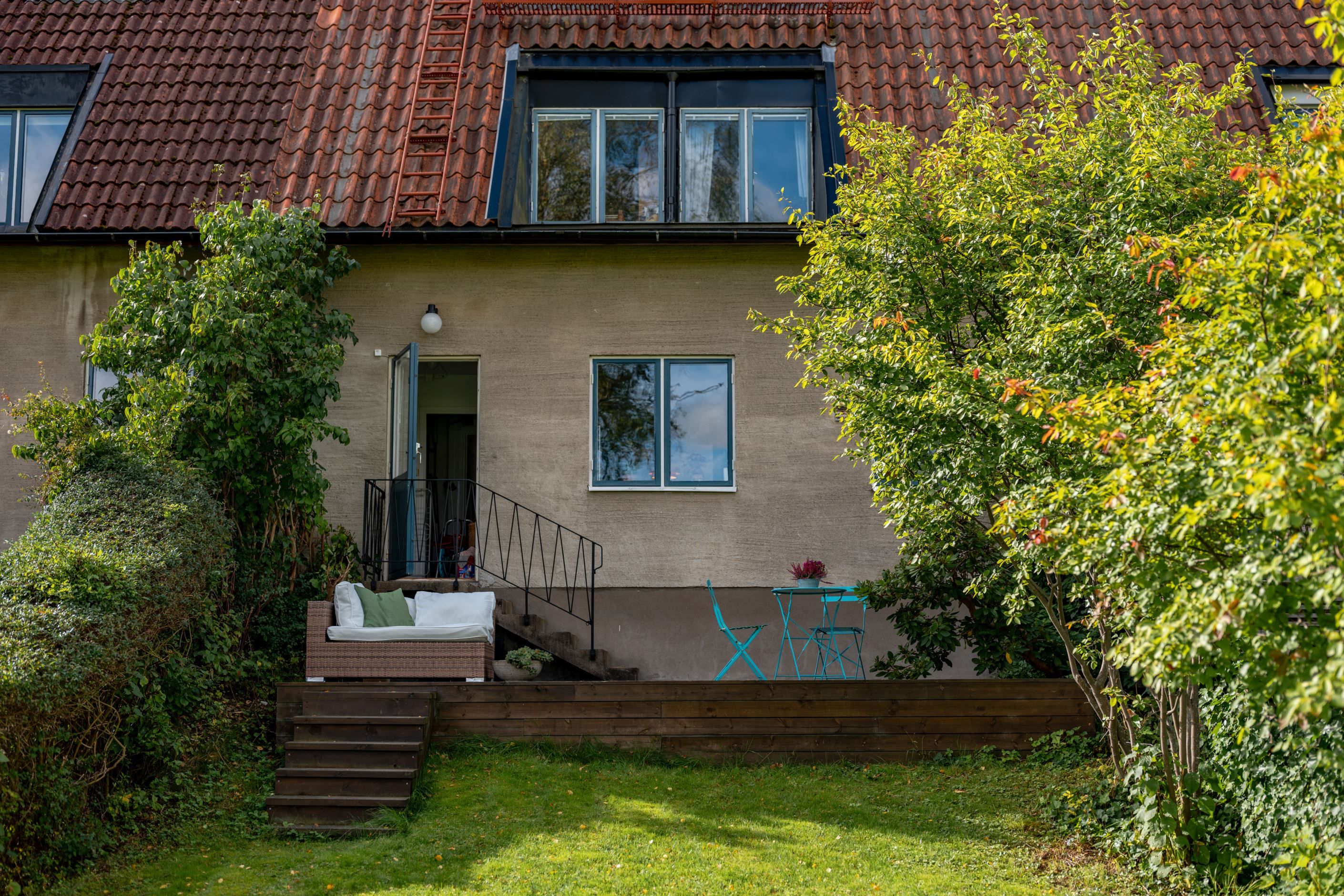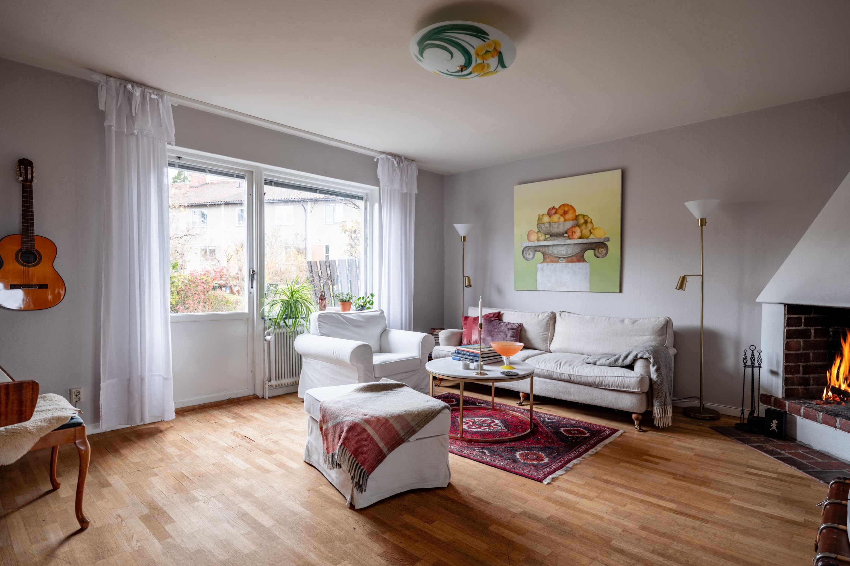 Interiört finner vi trivsamma bostäder med stora sällskapsytor och detaljer som öppen spis, parkett och en funktionell trappa mellan våningsplanen.
