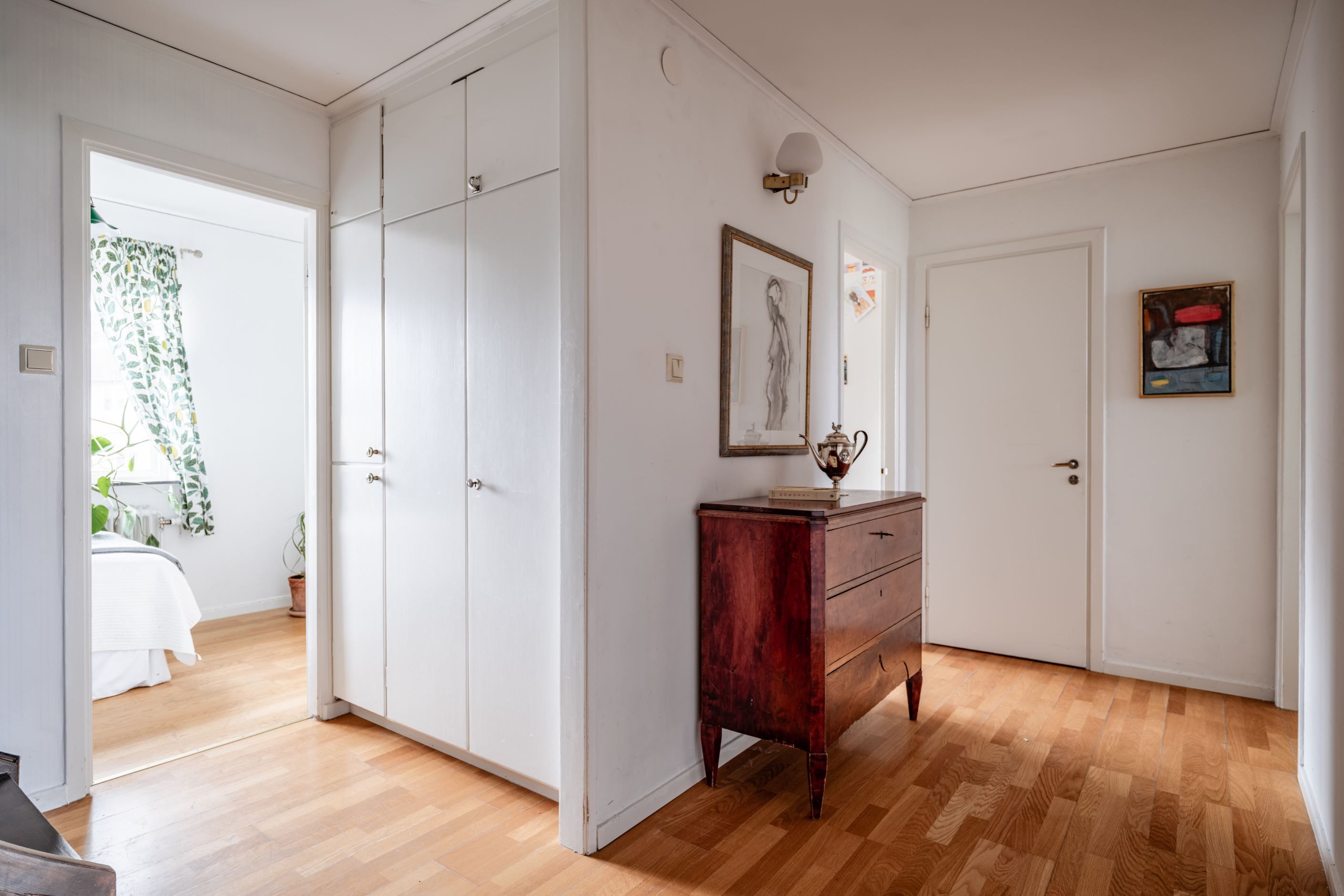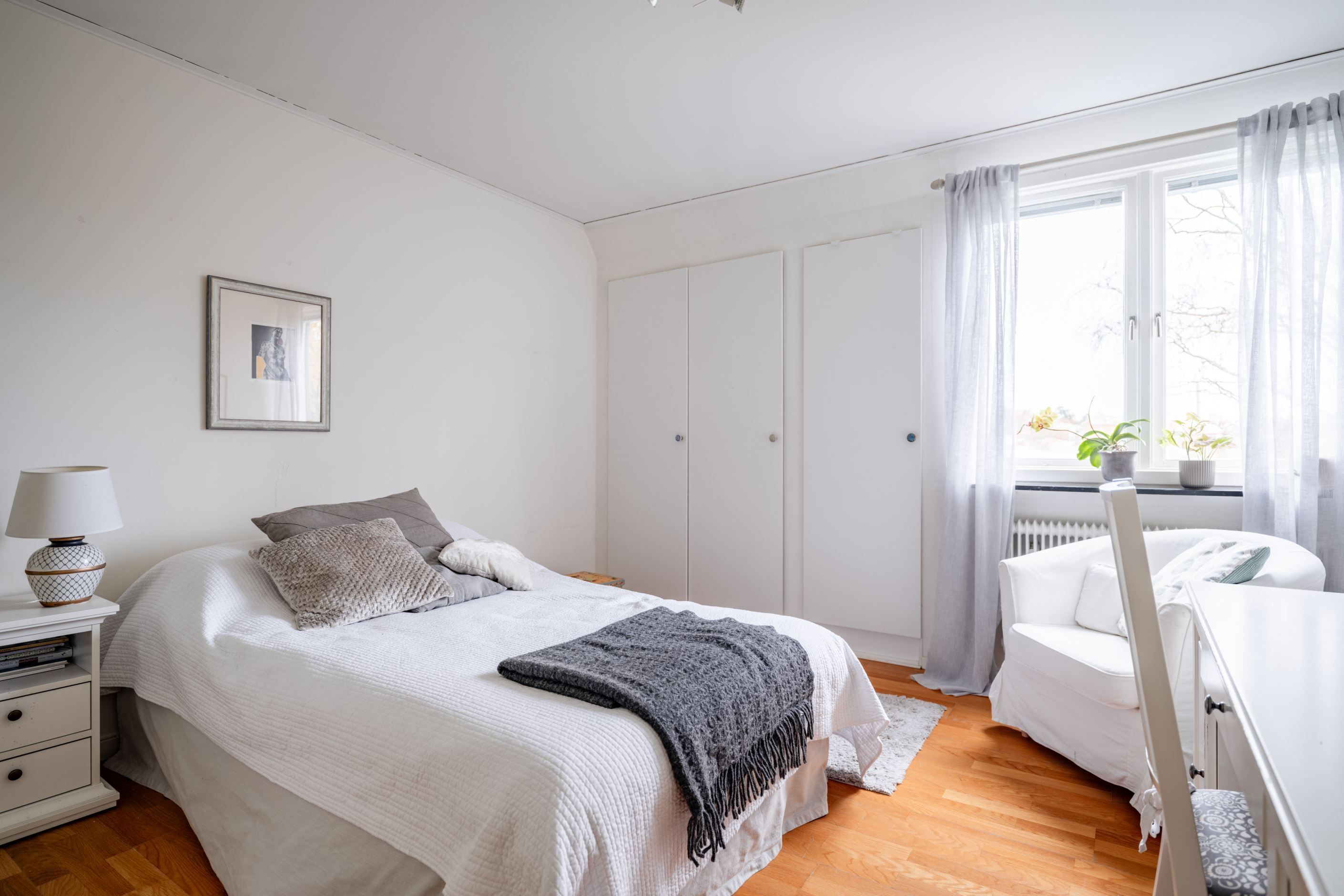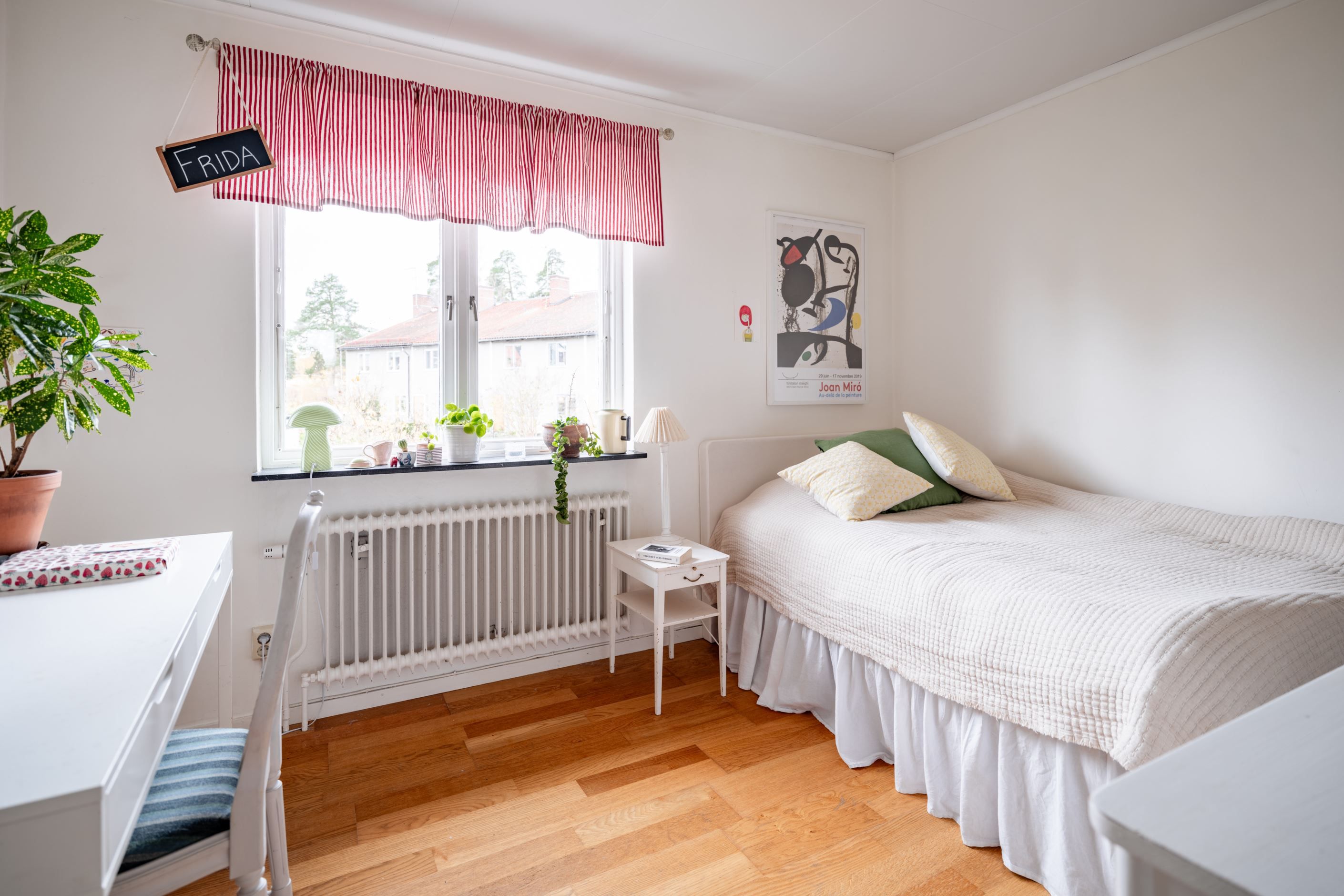 En trappa upp inreddes fyra sovrum samt ett förhållandevis rymligt badrum med badkar. I många av radhusen intill har man öppnat upp planlösningen även på övervåningen men på Sälgstigen 12 finns de fyra sovrummen kvar med gott om inbyggda skåp och garderober. Det finns ytterligare inbyggda skåp och garderober liksom ett vindsutrymme högst upp.