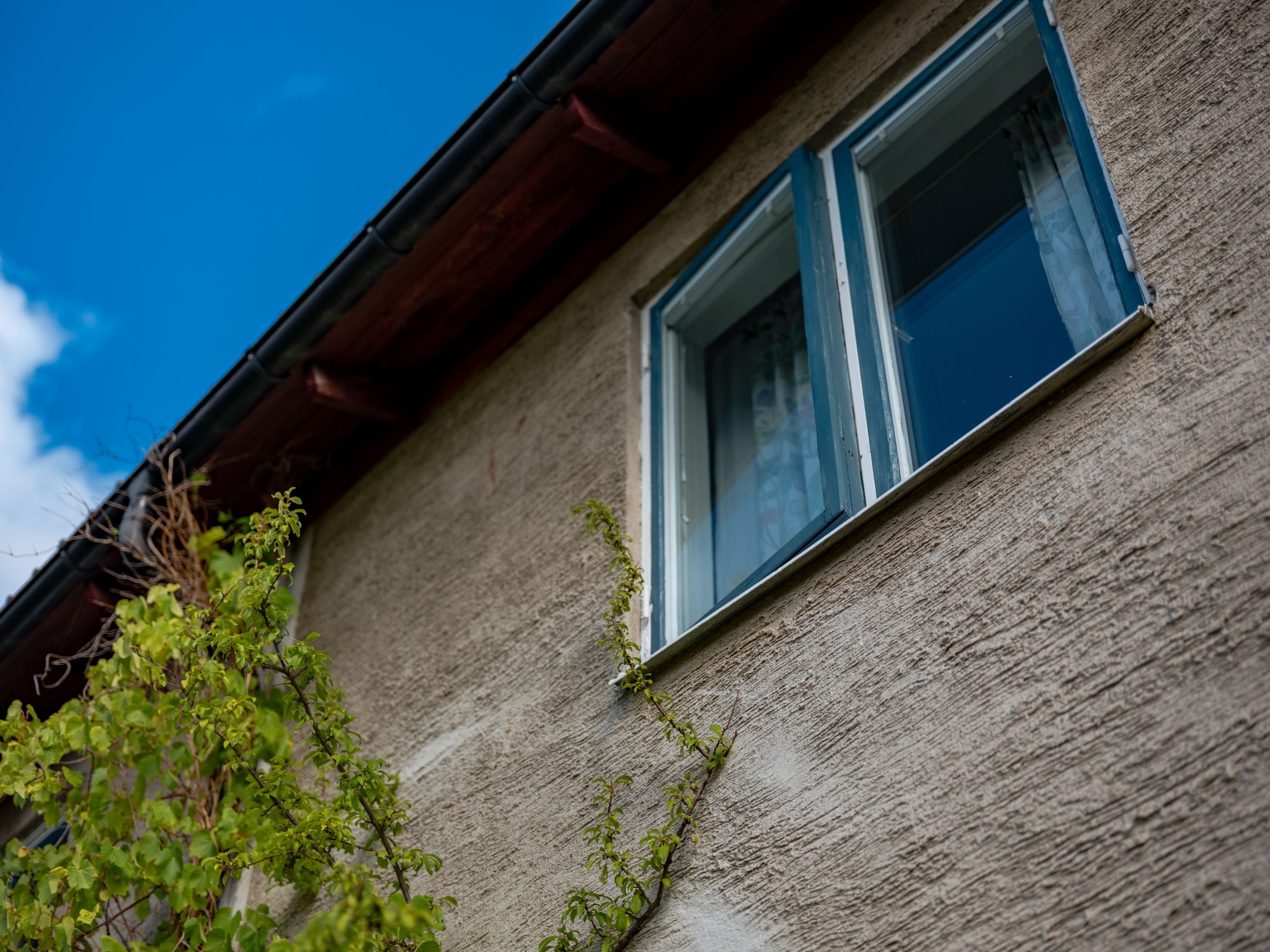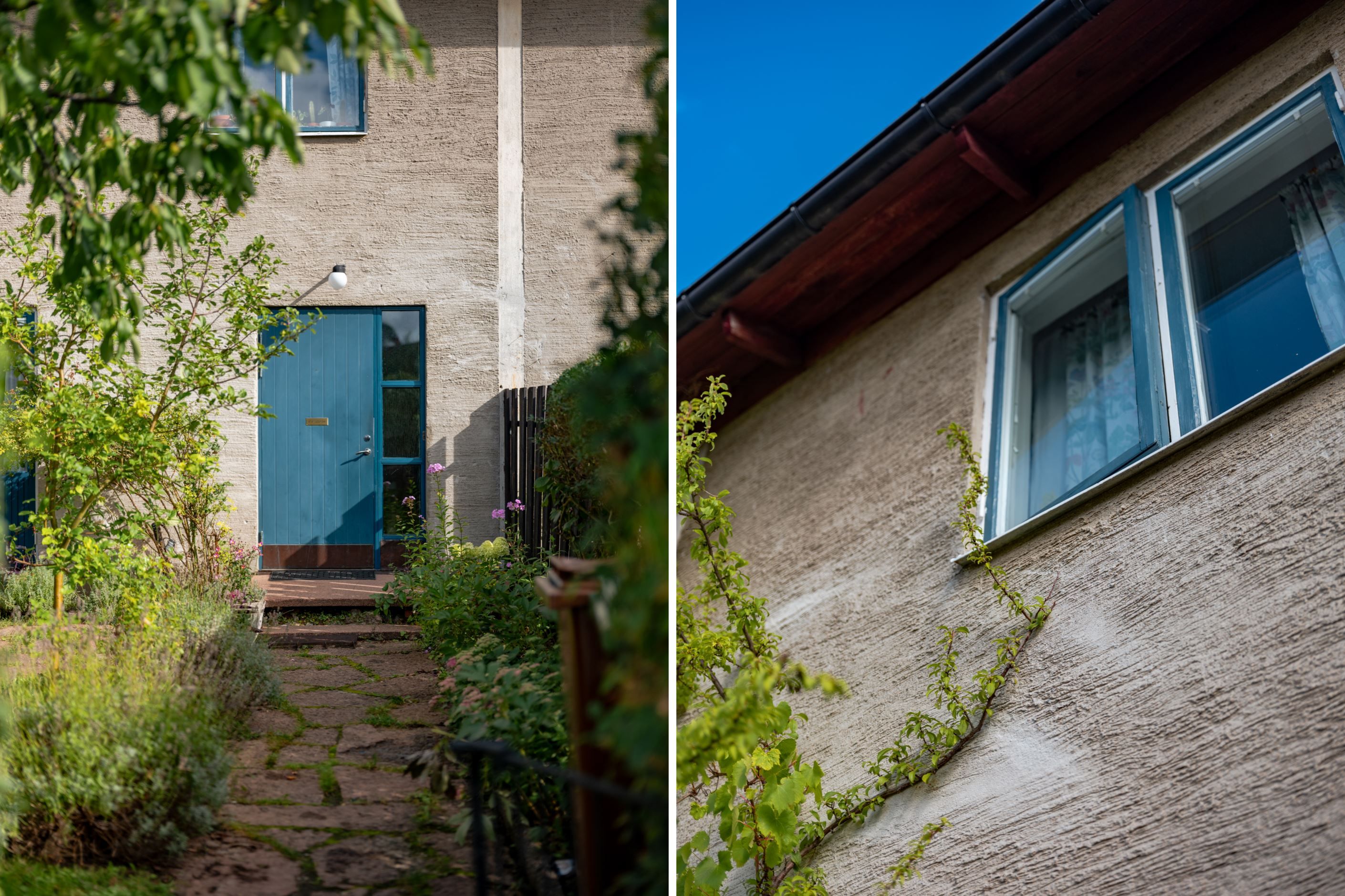 Fasaderna är putsade i grått och avskiljs från varandra medelst ett smalt putsat band i en vitbeige nyans. Fönstren har vitmålade karmar och fönsterbågarna är målade i blått, vilket är både dekorativt och gör att fönstren ser smäckrare ut. Ytterdörrarna är klädda med stående eller liggande panel som antingen fernissats eller målats i blått. Intill dörrarna finns ett glasparti som släpper in ljus i kapprummet. Bröstningen under vardagsrumsfönstren är också den panelklädd och blåmålad.