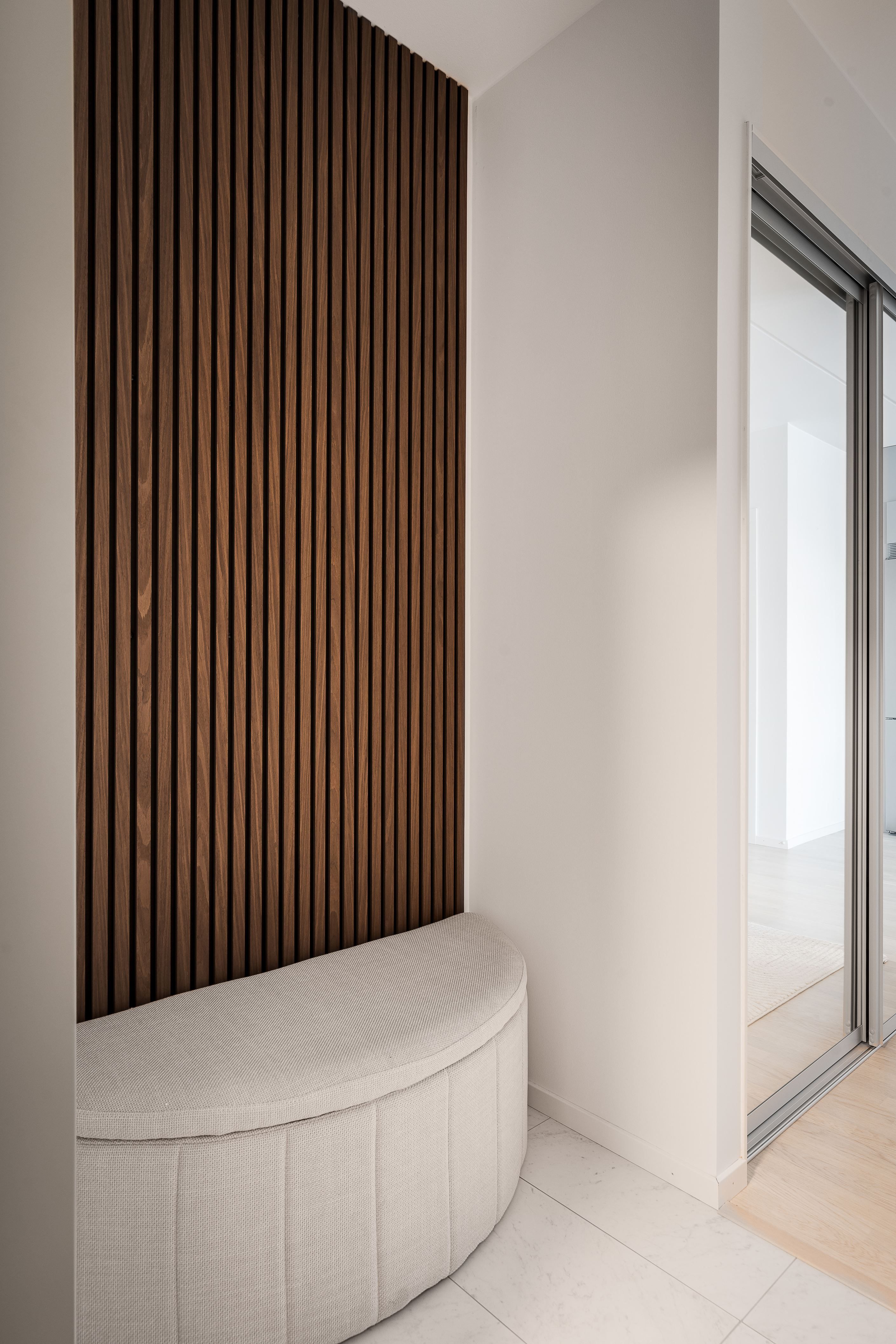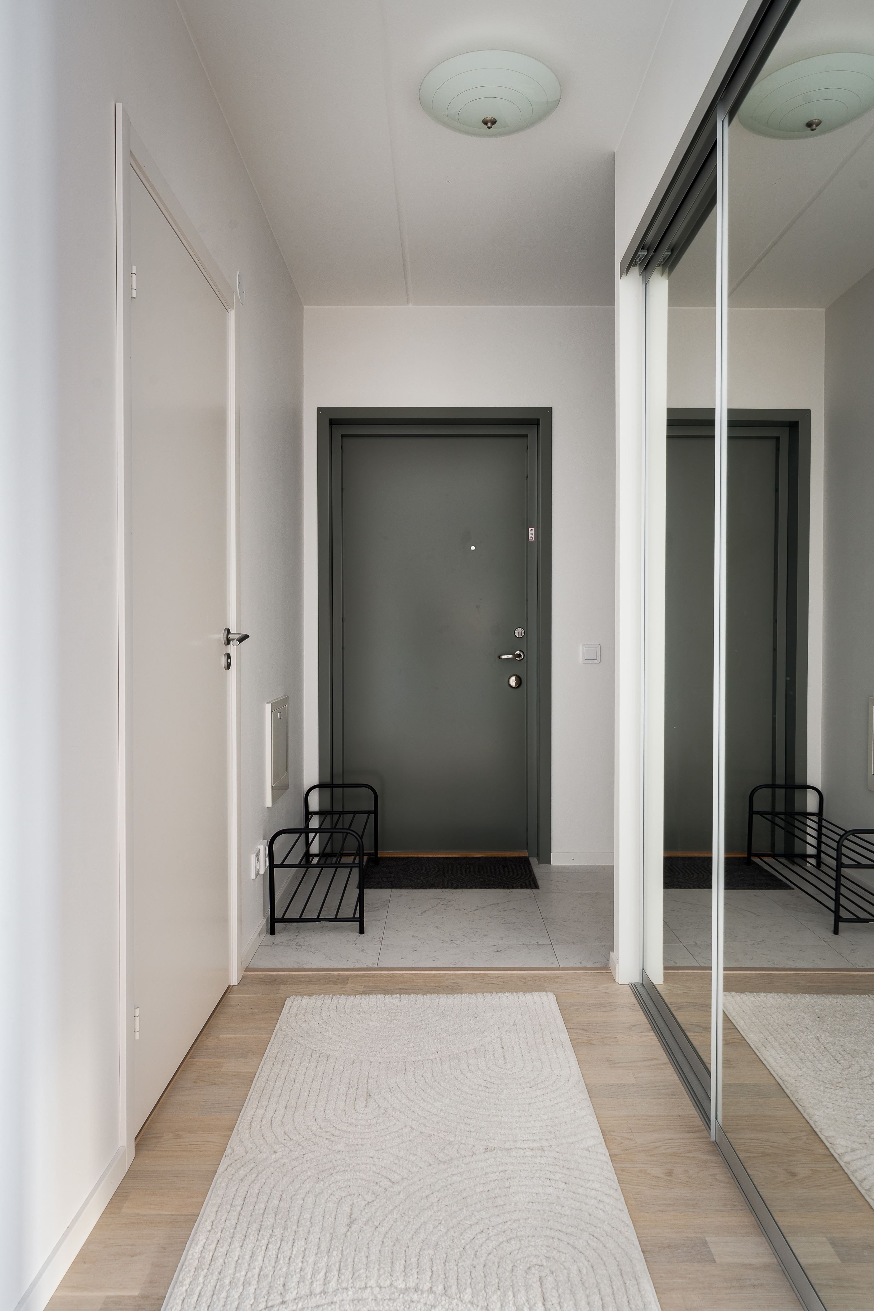 Hallen välkomnar med goda avhängningsmöjligheter och smart förvaring i garderober, vilket skapar ett ordnat och inbjudande första intryck.