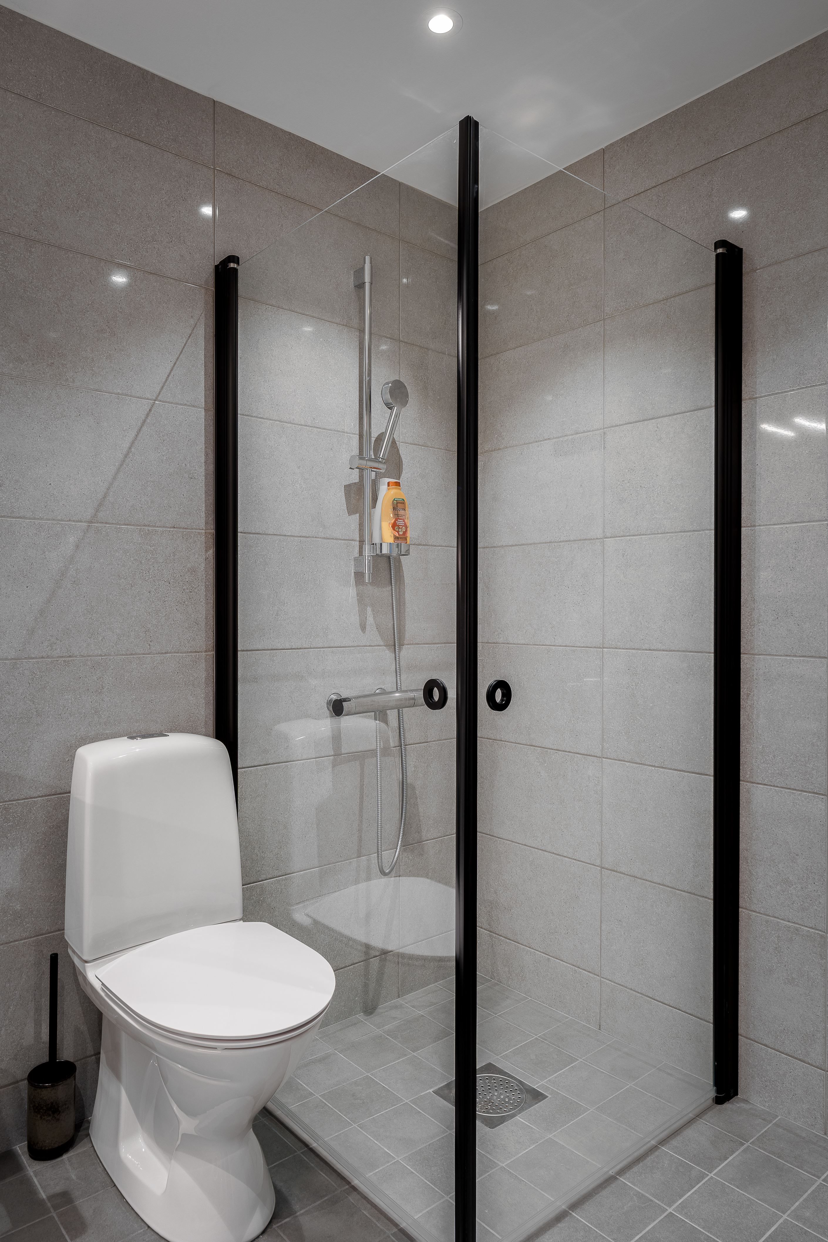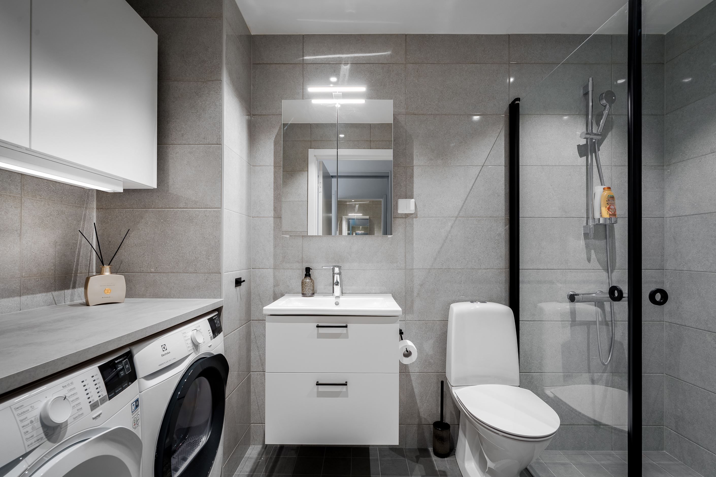 Det helkaklade duschrummet håller hög standard och är utrustat med duschhörna med glasväggar, wc, handfat med kommod samt egen tvättmaskin och torktumlare med praktisk arbetsbänk och förvaringsskåp ovan – ett bekvämt och funktionellt badrum för ett modernt boende.