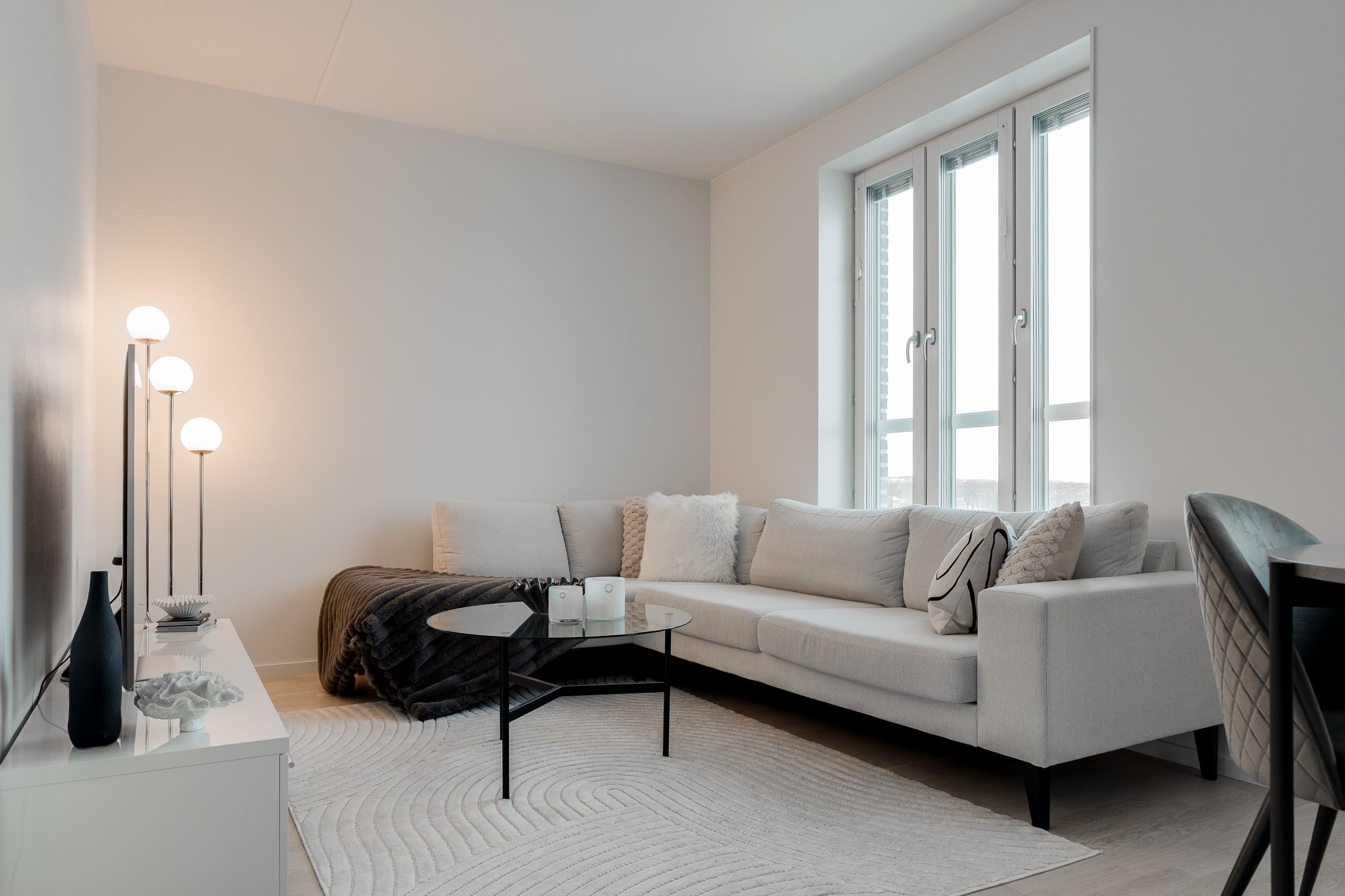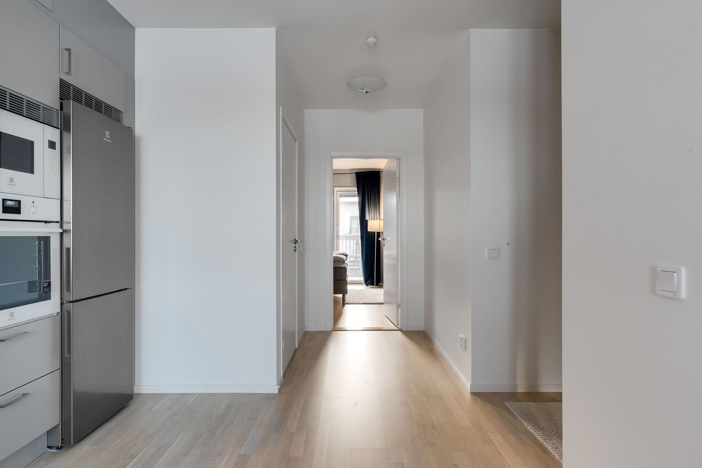 Bostaden präglas av en ljus och öppen planlösning mellan kök och vardagsrum, vilket skapar en social och trivsam yta med gott om plats för både soffgrupp och matbord. Köket är stilrent utformat med släta grå luckor, goda arbetsytor och full maskinell utrustning i form av inbyggnadsugn, mikro, diskmaskin samt kyl och frys i fullhöjd – perfekt för både vardag och helgmiddagar.