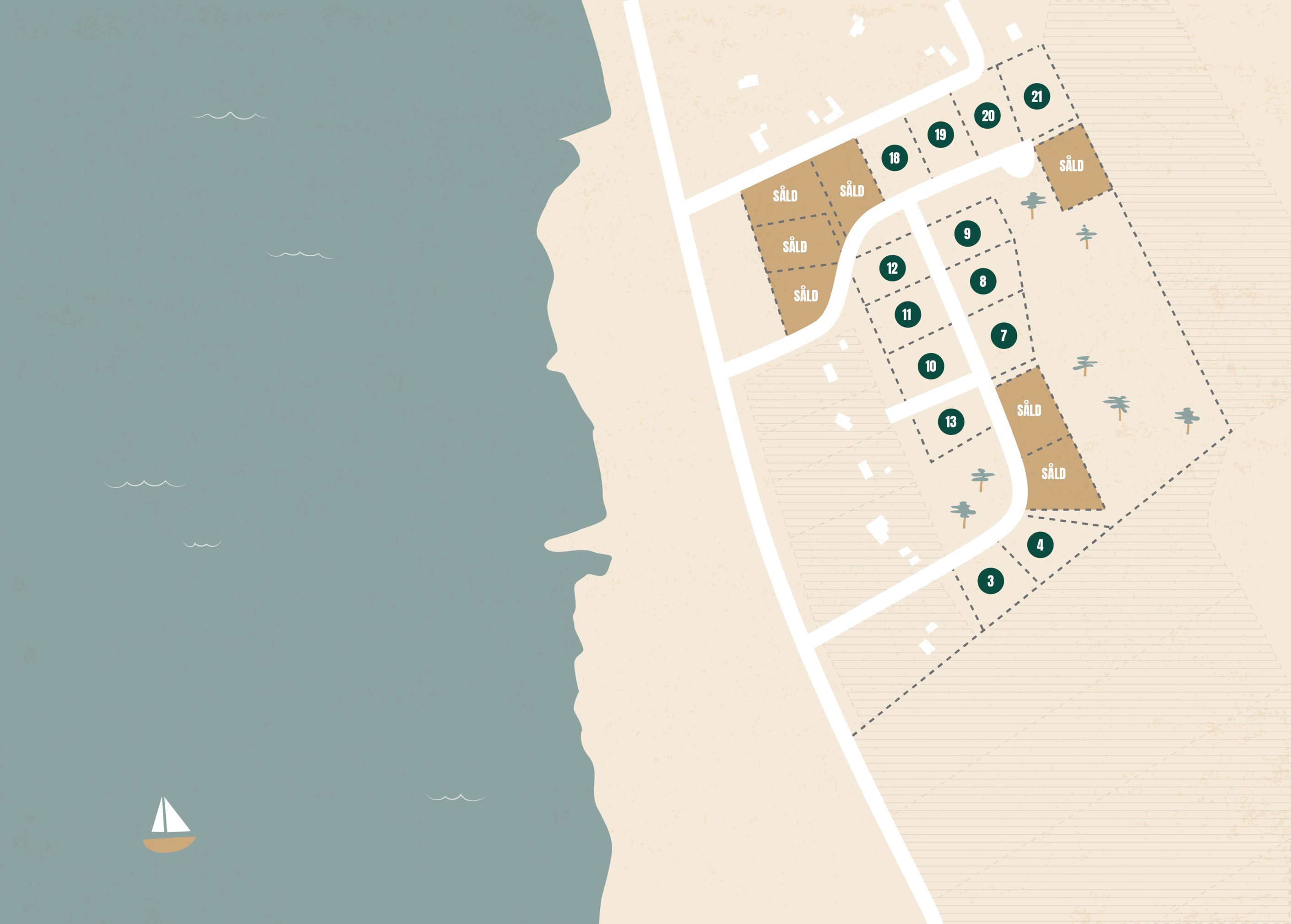 Under bilder finns tomtkartan där det syns vilka tomter som finns tillgängliga och vilka som är sålda